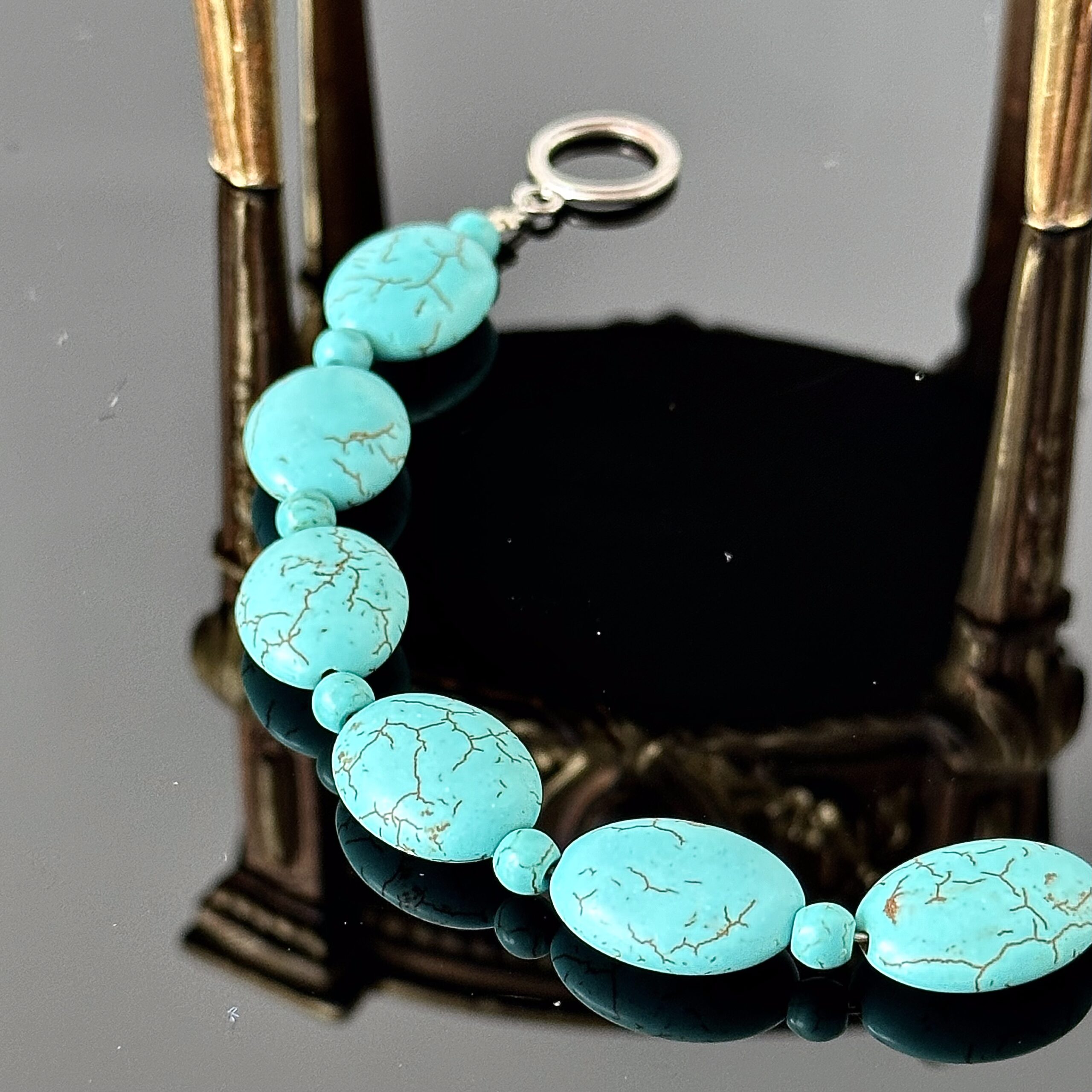Bransoletka z płaskim owalnym Turkusem, wykonana w Londynie około 1980 roku. Poszczególne elementy bransoletki zostały ze sobą połączone stalką jubilerską która jest bardzo mocna i odporna na zerwania. Efekt optyczny niebieskich elementów jest oszałamiający, bransoletka została przywieziona z Londynu i zakupiona w jednym z sklepów z biżuterią, całość znajduje się w bardzo dobrym stanie.