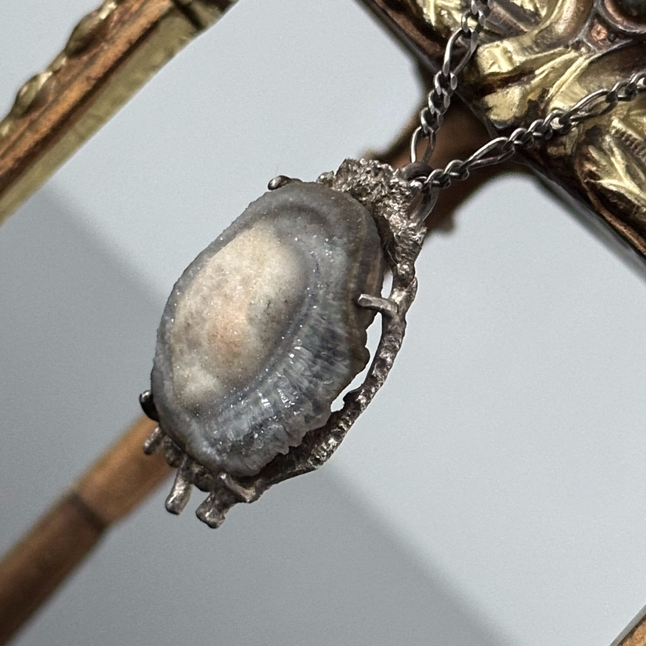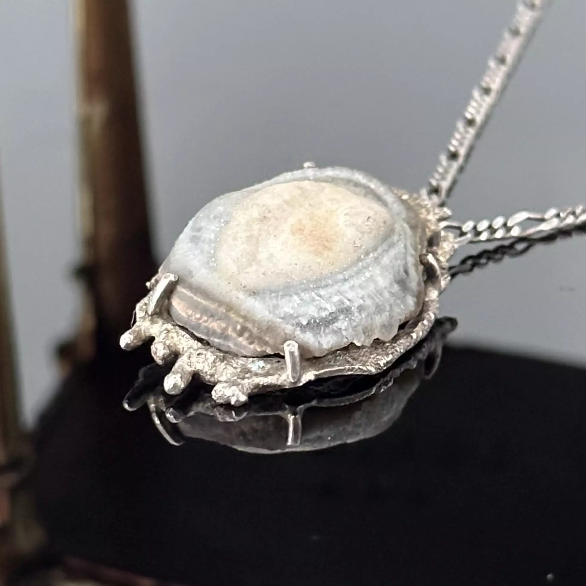 Wyjątkowy pojedynczy wyrób Artystyczny z wyjątkowym kamieniem Róża Chalcedonowa. Artysta wykonał przywieszkę z srebra próby 925. Róża chalcedonowa to wyjątkowa odmiana stworzona z chalcedonu. Chalcedon natomiast należy do grupy kwarców i składa się z dwutlenku krzemu, występuje głównie w skałach wulkanicznych, takich jak andezyty, ryolity czy bazalty. Ponadto, jest składnikiem różnych skał, takich jak krzemienie, lidyty oraz jaspisy. Można go znaleźć w różnych regionach świata, m.in. w Brazylii, Urugwaju, Kanadzie, Niemczech, Rosji, Indiach, Rumunii oraz na Sri Lance. Nazwa pochodzi od miasta Chalkedon w Azji Mniejszej, położonego nad Bosforem. Twardość chalcedonu na skali Mohsa wynosi 6.5-7, a gęstość 2,6 g/cm³. Charakteryzuje się brakiem łupliwości, nierównym, muszlowym przełamem oraz szklistym, matowym lub jedwabistym połyskiem.