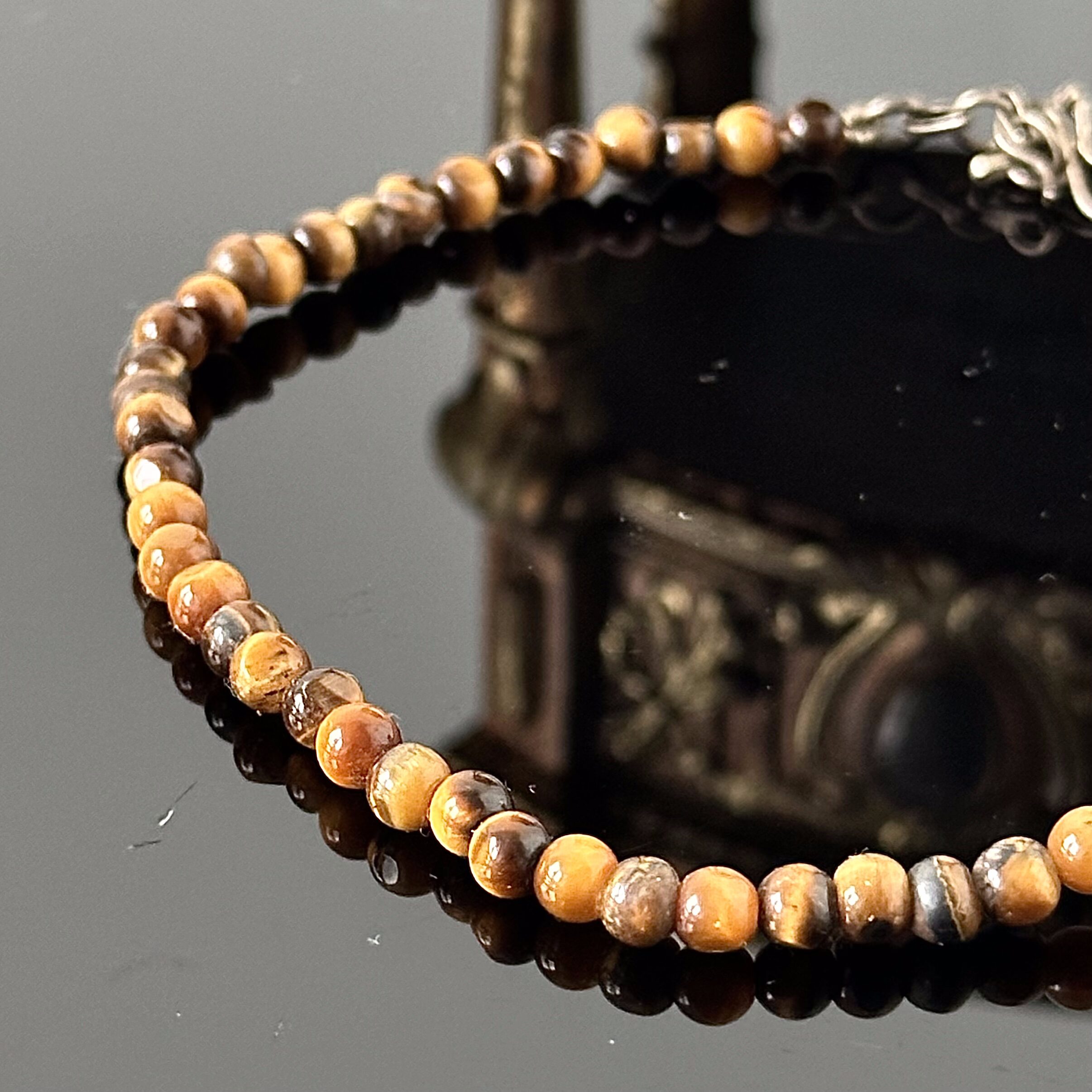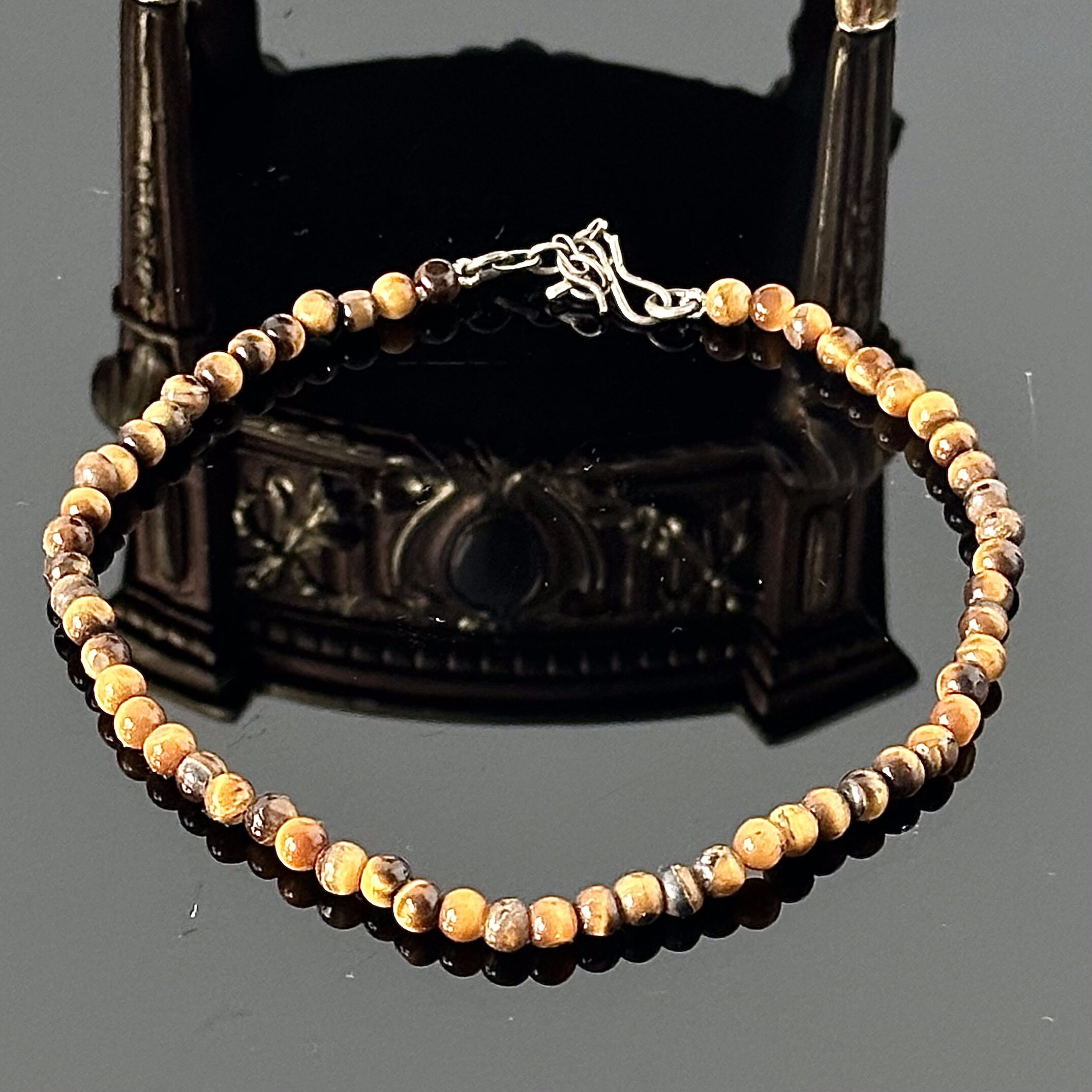 Bransoletka na stopę z okrągłym naturalnym Tygrysim Okiem, wykonana około 1920 roku. Poszczególne elementy bransoletki zostały ze sobą połączone łańcuszkiem srebrnym próby 800 (próba potwierdzona kwasowo). Efekt optyczny brązowo kawowych kulek jest oszałamiający, bransoletka została przywieziona z Londynu i zakupiona w jednym z sklepów z biżuterią, całość znajduje się w oryginalnym dobrym stanie nie odczyszczona i nie wypolerowana.