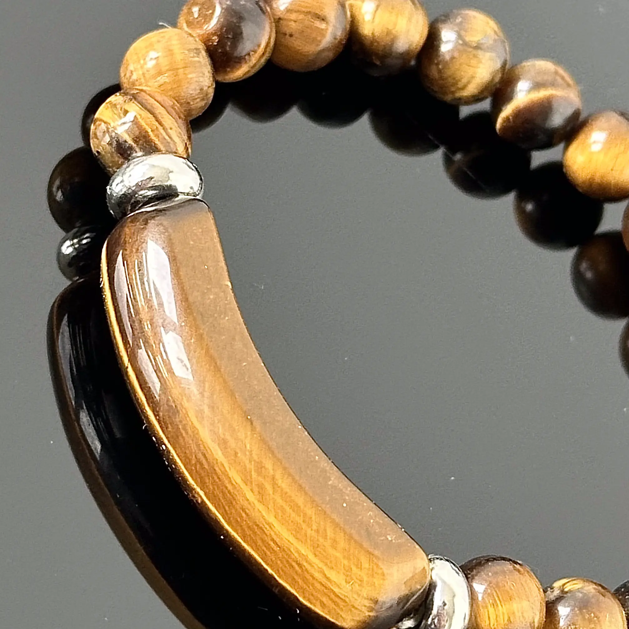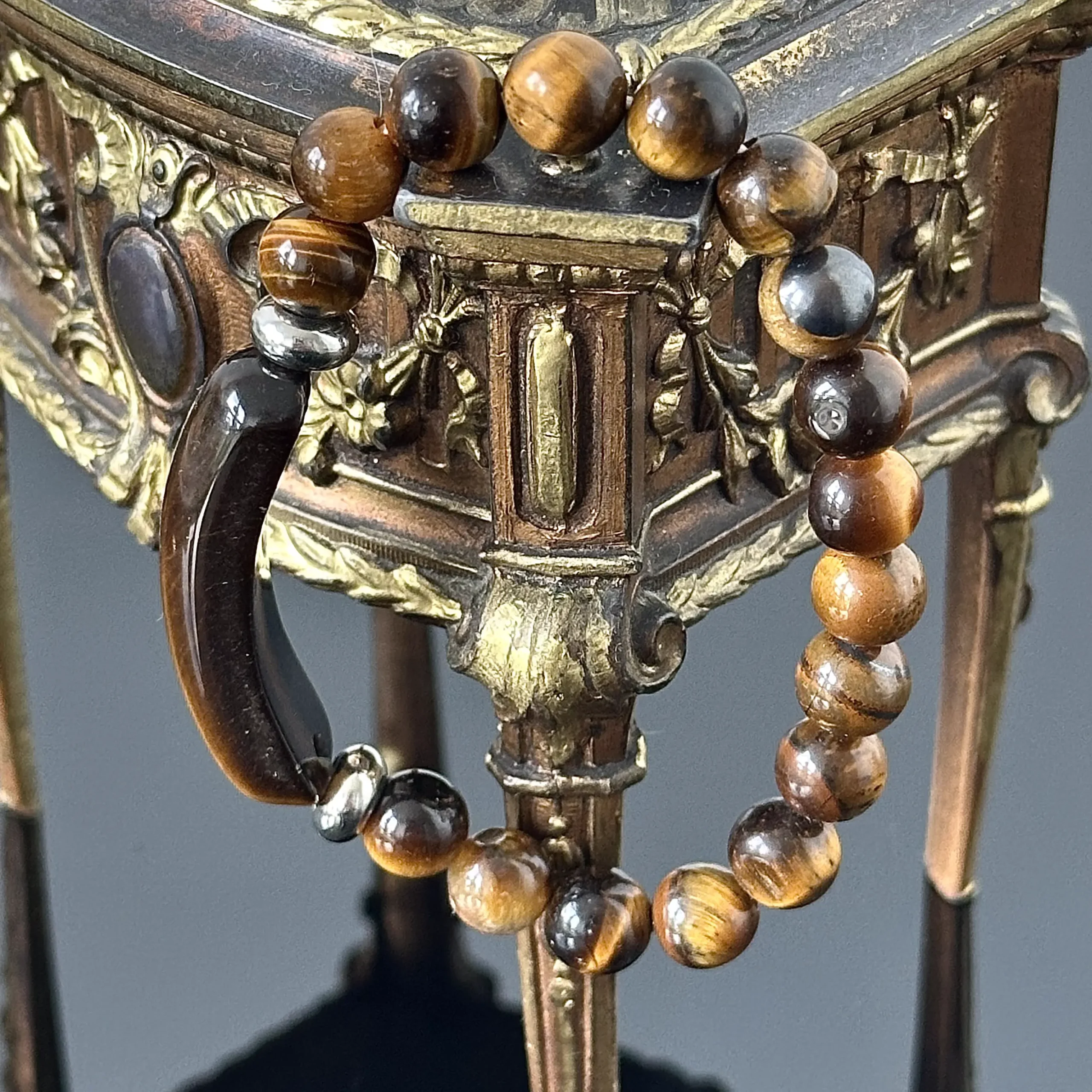 Bransoletka z okrągłym naturalnym Tygrysim Okiem, wykonana około 1980 roku w Londynie. Poszczególne elementy bransoletki zostały ze sobą połączone gumką jubilerską co pozwala bezproblemowo zdjąć czy nałożyć. Efekt optyczny brązowo kawowych kulek jest oszałamiający, bransoletka została przywieziona z Londynu i zakupiona w jednym z sklepów z biżuterią, całość znajduje się w bardzo dobrym stanie.