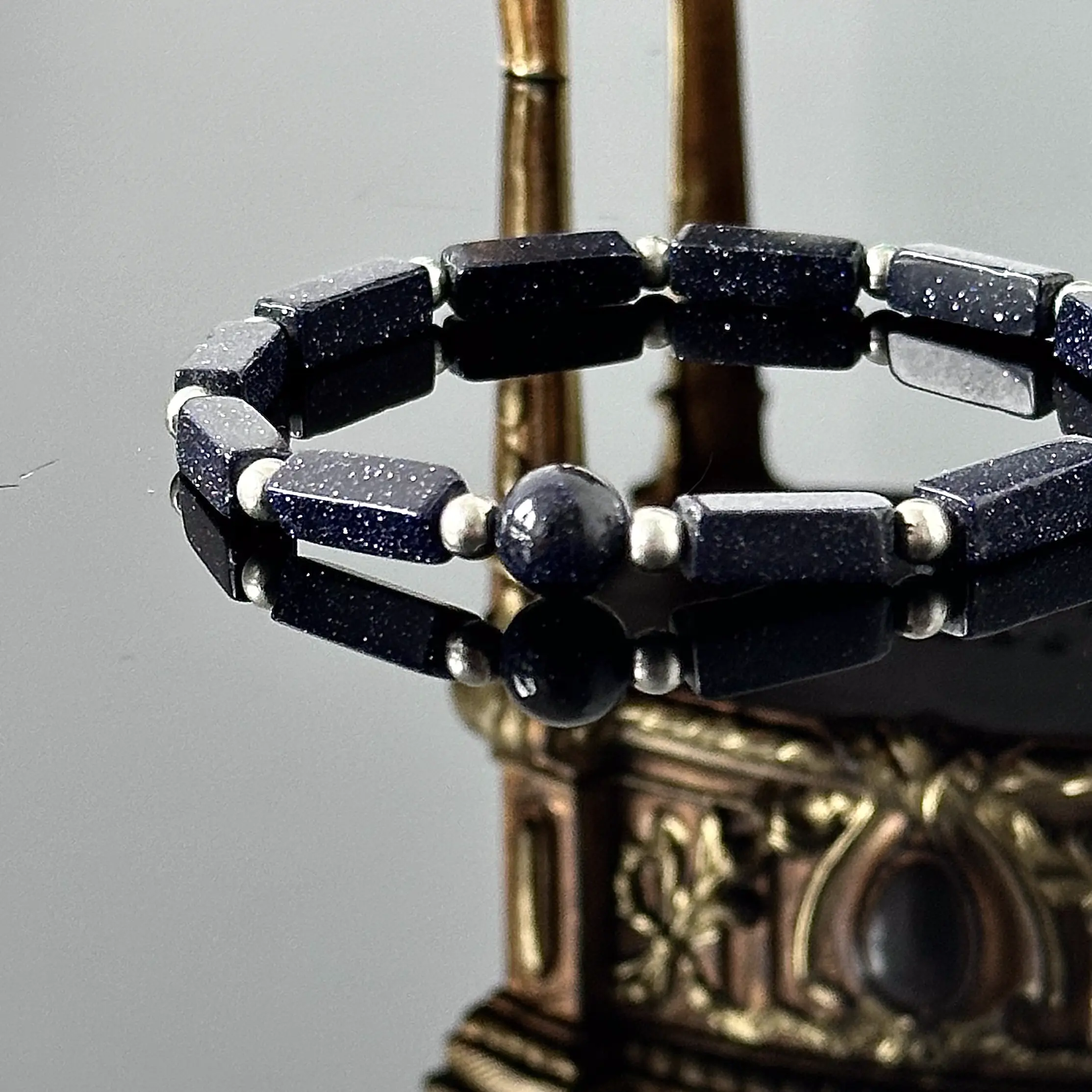 Przepiękna bransoletka wykonana z kamienia Noc Kairu. Pochodzi z Londynu i została wykonana ok. 1980 roku z jednakowych wielkością kamieni na gumce jubilerskiej. Wszystkie kamienie zostały wyszlifowane w prostokąty i mienią się w słońcu i padającym świetle. Kamień ten posiada tysiące bardzo drobnych gwiazdek srebrnych dodając dodatkowego uroku i blasku. Bransoletka znajduje się w bardzo dobrym stanie, zdecydowanie polecamy.