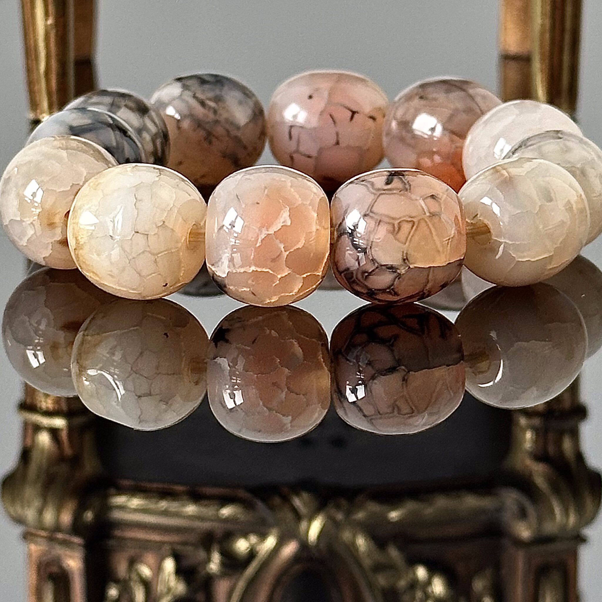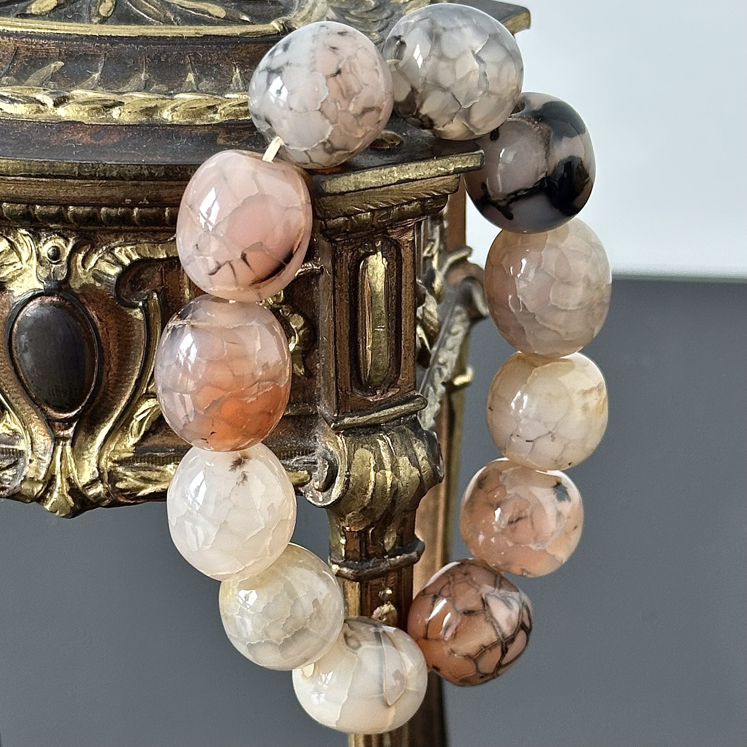 Bransoletka z okrągłym naturalnym Smoczym Agatem, wykonana w Londynie około 1980 roku. Poszczególne elementy bransoletki zostały ze sobą połączone gumką jubilerską co pozwala bezproblemowo zdjąć czy nałożyć. Efekt optyczny delikatnie szarych i delikatnie różowych kulek jest wyjątkowy, bransoletka została przywieziona z Londynu i zakupiona w jednym z sklepów z biżuterią, całość znajduje się w bardzo dobrym stanie.