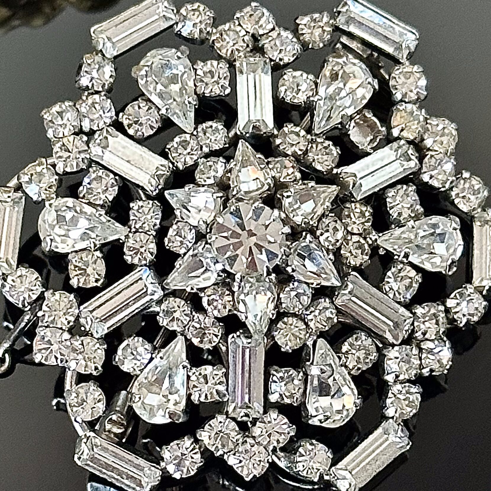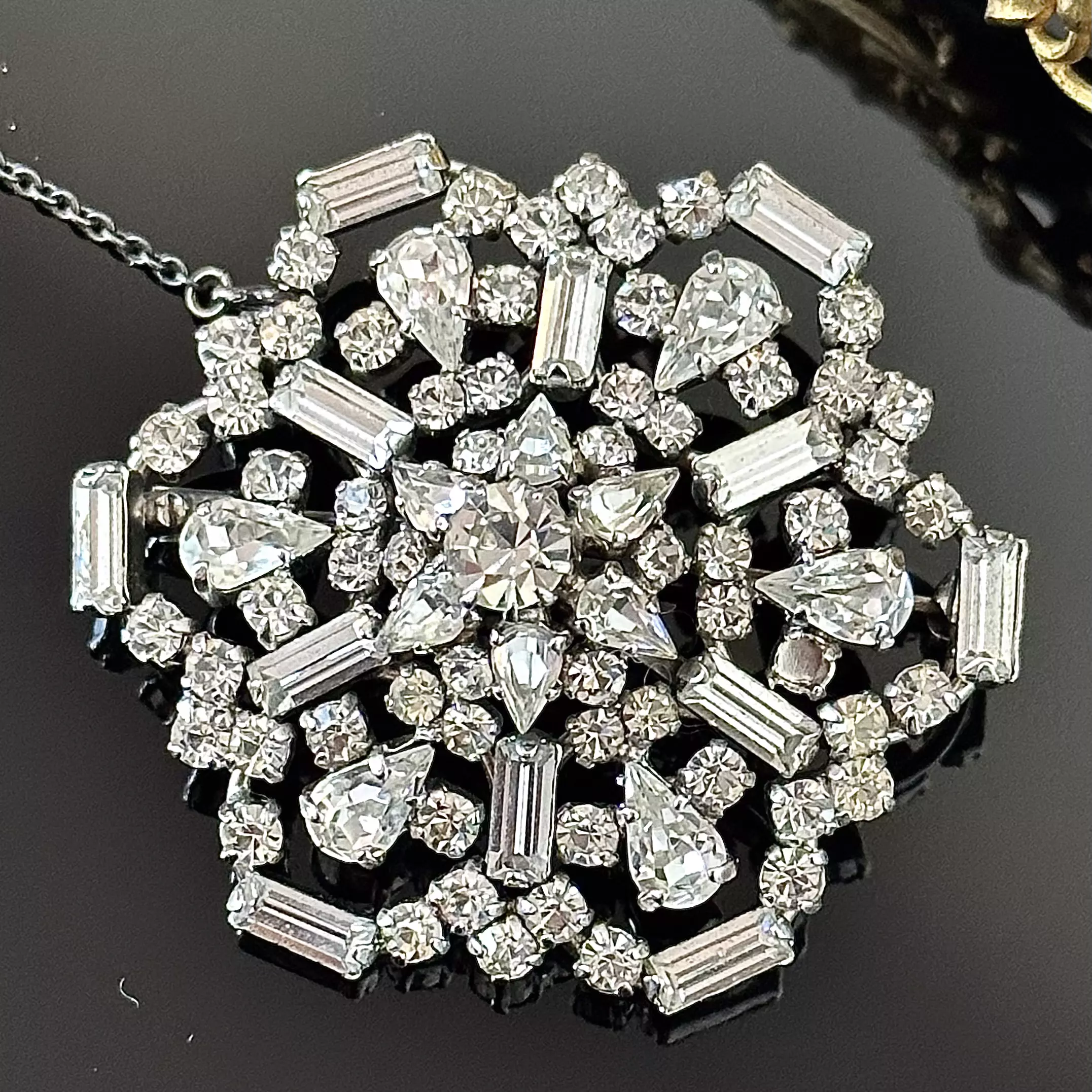 Posrebrzana broszka pokryta w pełni kamieniami Swarovskiego. Wyjątkowy projekt w stylu Art Deco pochodzi z Ameryki z końca lat 60. XX wieku. Lustrzane kamienie które wypełniły w 100% całą powierzchnię broszki, wprowadziły do projektu światło, fasetowane kamienie całkowicie dominuje nad klejnotem, osadzone kamienie są zróżnicowane kształtem i wielkością, co po geometrycznym ich rozmieszczeniu podkreśliło idealnie wzornictwo Art Deco z tamtego okresu.