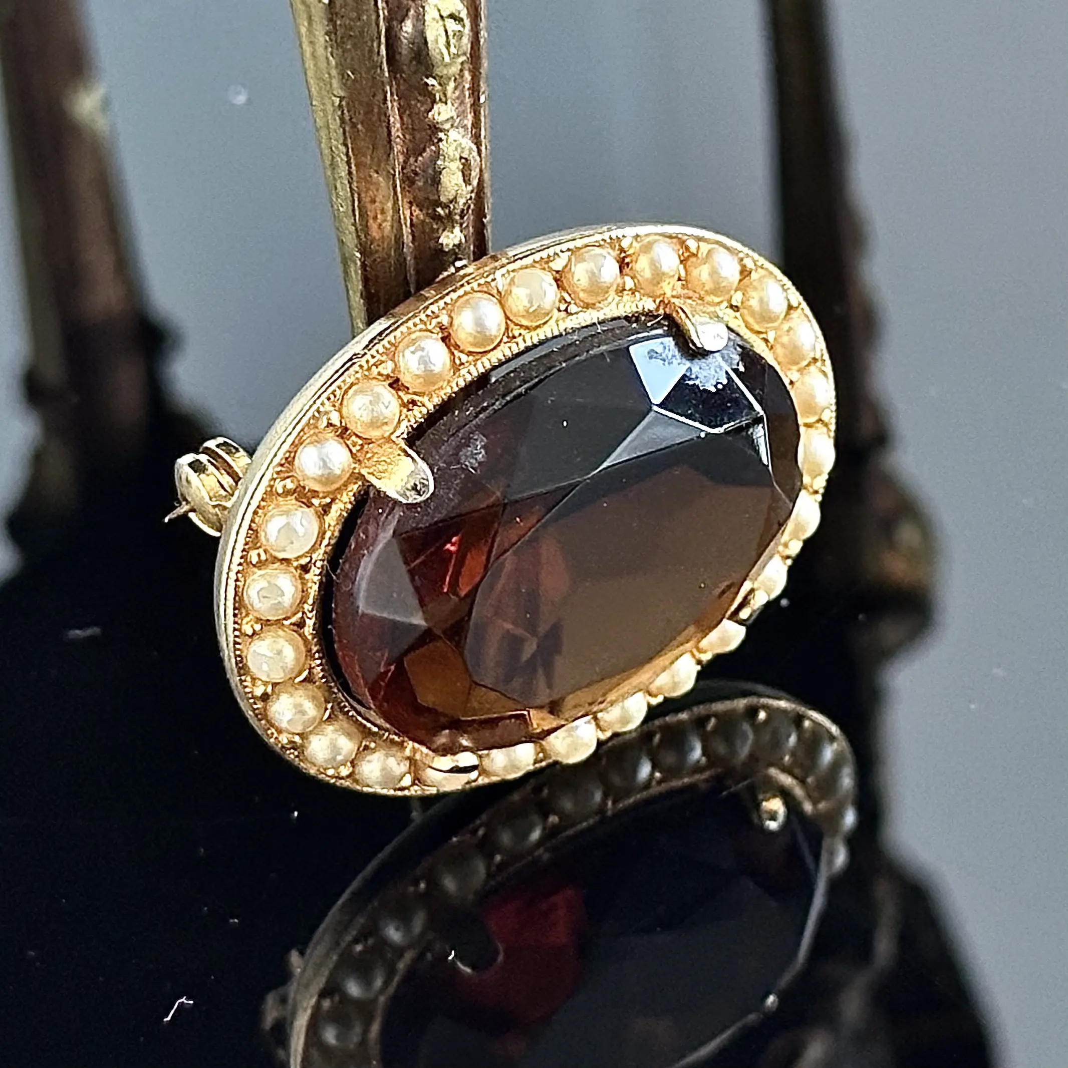 Broszka vintage z kamieniem Cytrynowym i Perłami