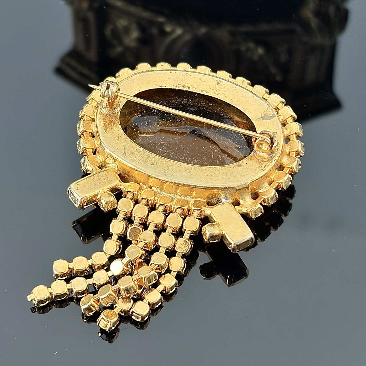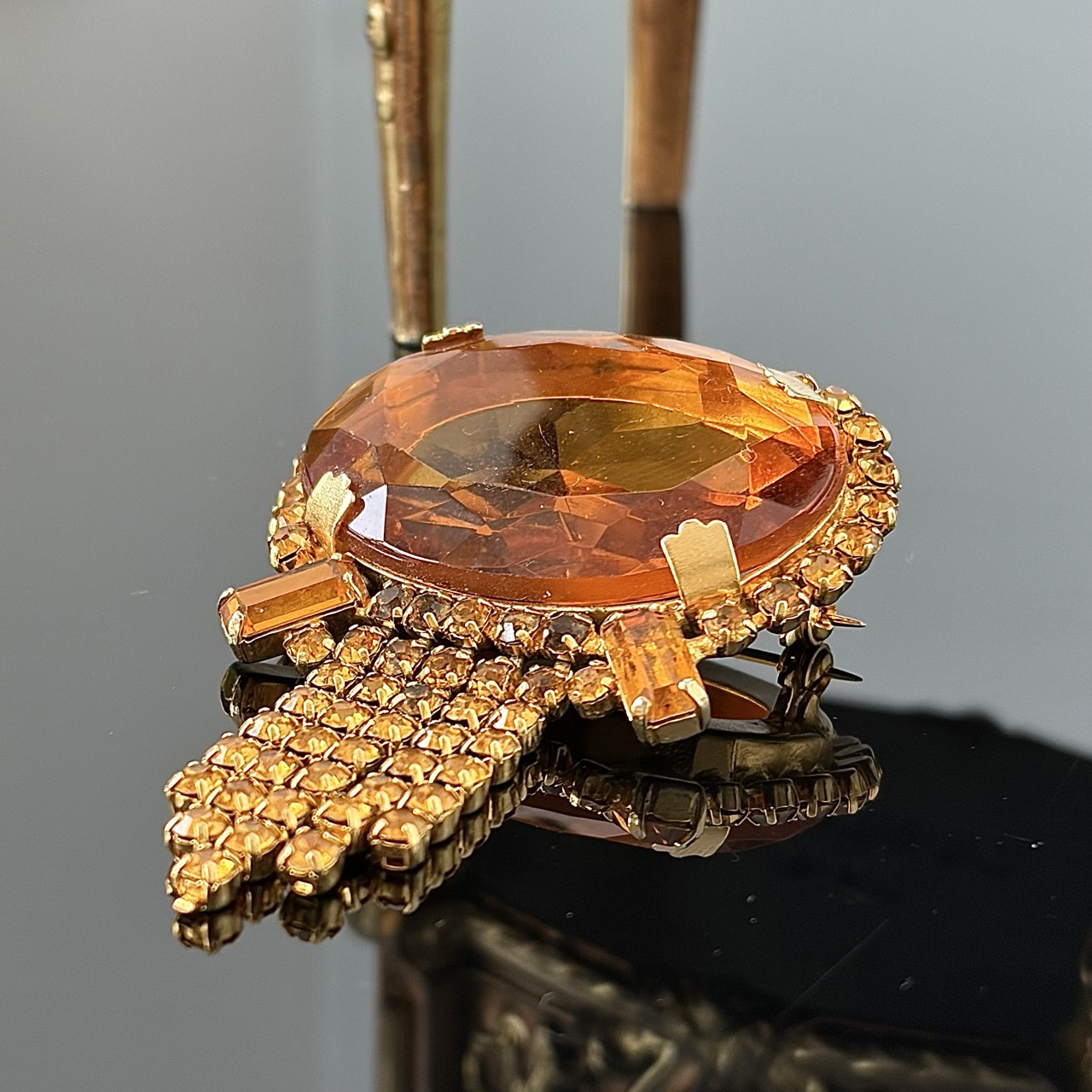 Pozłacana 24 karatowym złotem broszka z centralnie osadzonym wielkim kamieniem cytrynowym, całość pochodzi z Czechosłowacji, wykonane w latach 50-60 XX wieku. Przejrzyste cytrynowe światło wspaniale przenika i oświetla cały projekt. Broszka została wykonana w kształcie owalu i wspaniale otacza centralny kamień. Całość znajduje się jak widać w dobrym stanie technicznym i wizualnym. Kamień jest doskonałej jakości, zdecydowanie polecamy.