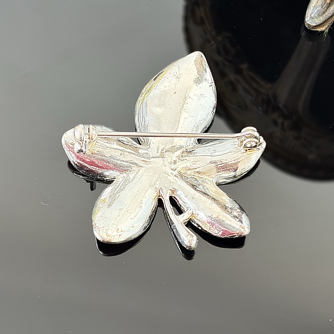Broszka w kształcie kwiatu z czerwoną emalią