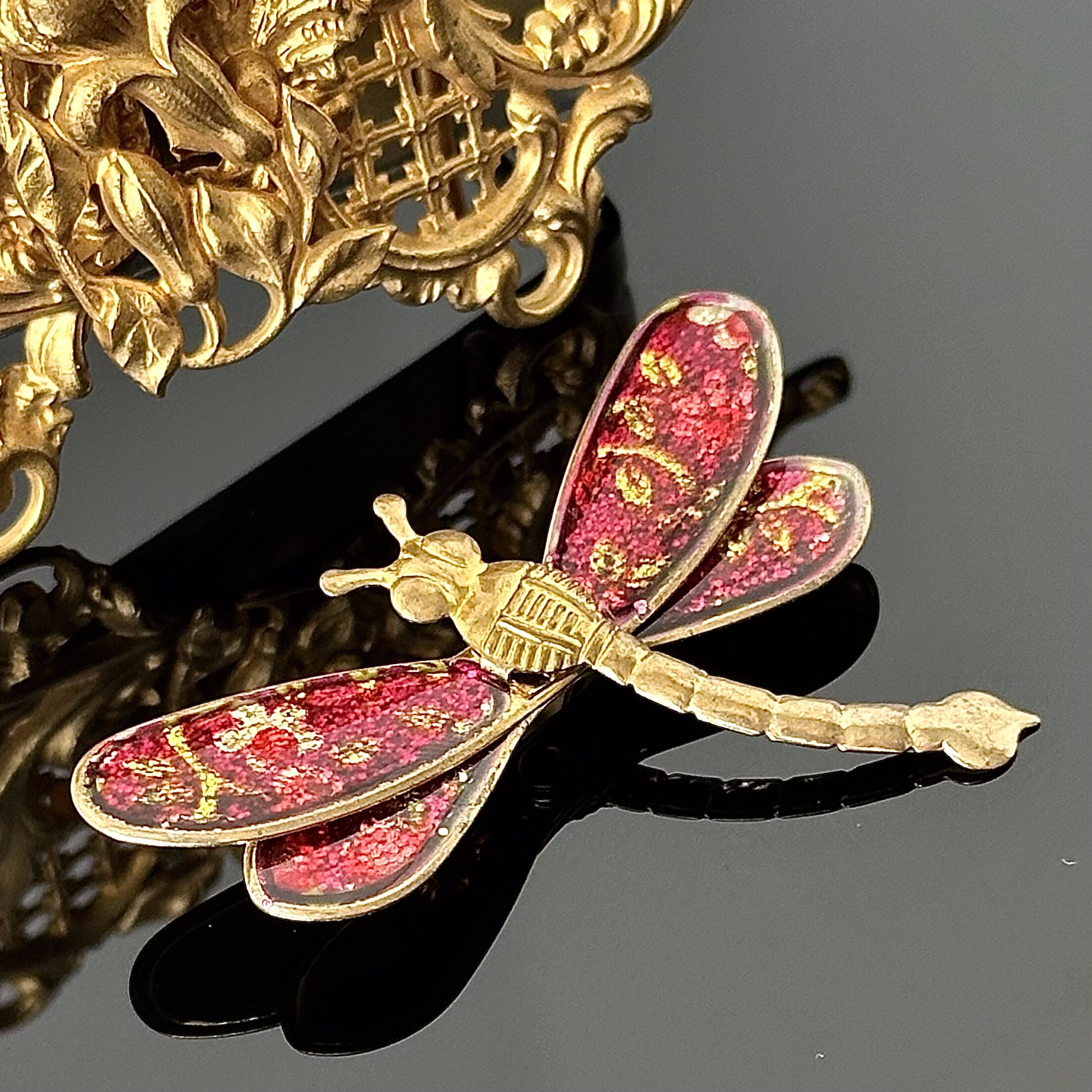 Pozłacana broszka z emaliowaną ważką w stylu Vintage. Projekt wykonany w latach 70-tych w Ameryce z metalu i został pozłocony 14 karatowym złotem, oraz pokryta emalią. Ważka znajduje się w bardzo dobrym stanie i może się wspaniale komponować do garderoby czy torebki w stylu z tamtego okresu.