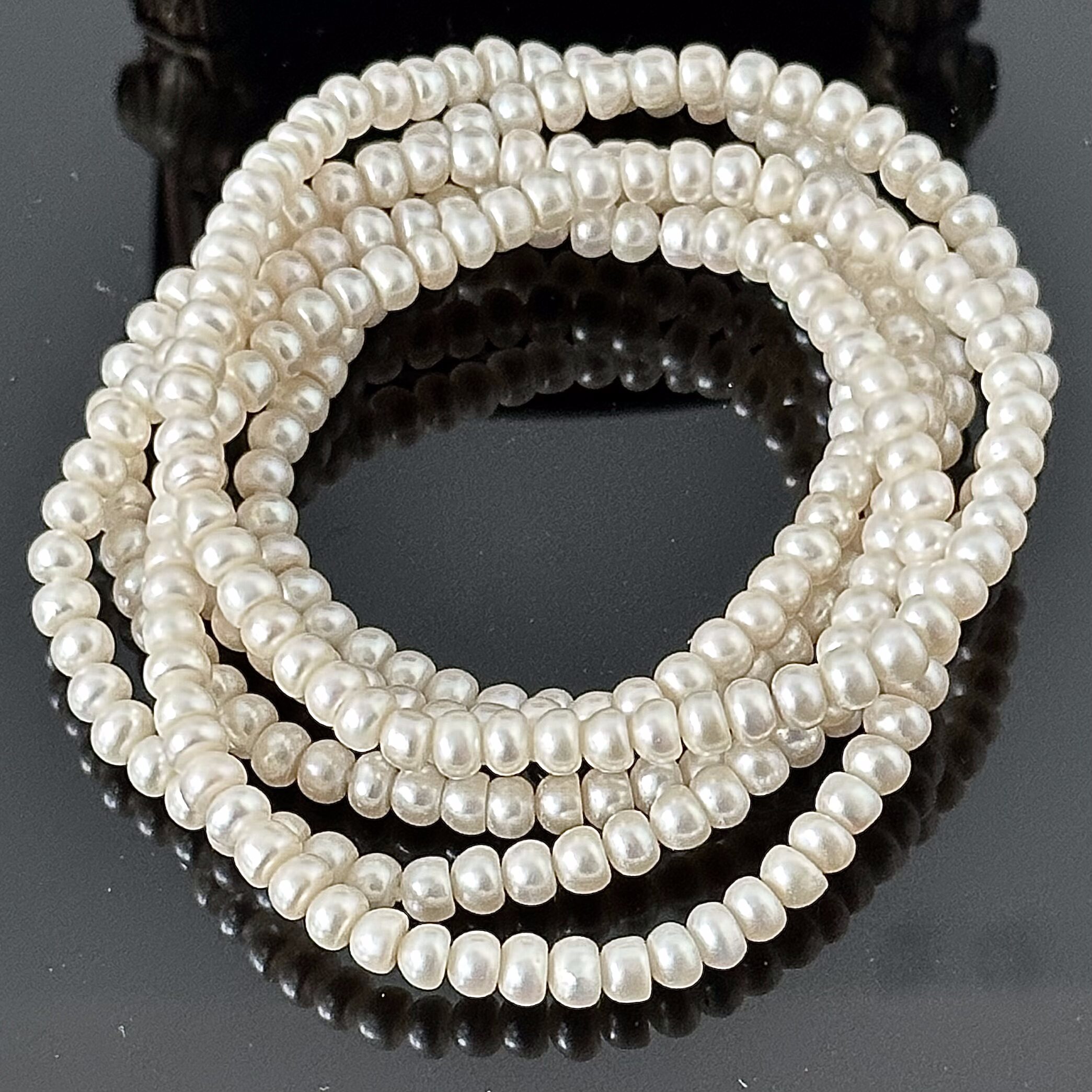 Długi naszyjnik z naturalnych Pereł. Naszyjnik ten to wspaniały przykład wzornictwa sztuki Art Deco, pochodzi z Londynu gdzie został wykonana ok. 1980 roku. Artysta wykonał jednorzędowy długi naszyjnik który można owinąć 2 lub 3 krotnie w koło szyi z dużych pereł i połączył wszystkie koraliki linką jubilerską. Całość znajduje się w idealnym stanie, jest okazały oraz godny polecenia.