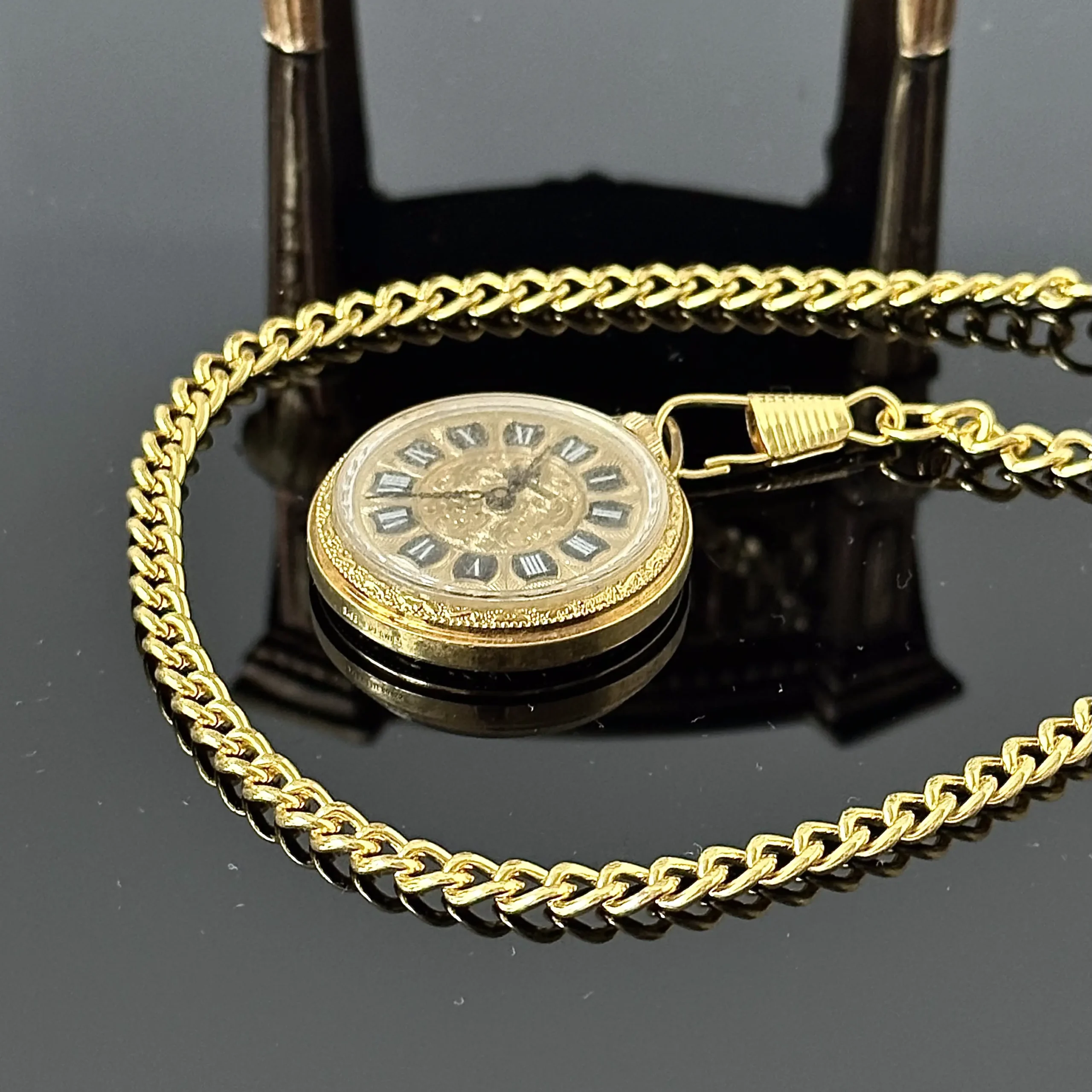 Pozłacany łańcuszek do zegarka dewizka, dewizka została wykonana z brązu i pozłocona 14 karatowym złotem. Wspaniały splot, stosowany przy zegarkach wysokiej klasy znanych marek z jednej strony mamy uchwyt do guzika lub do kieszeni, a drugiej karabińczyk do zegarka. Całość znajduje się w bardzo dobrym stanie, jest jak nowy, zdecydowanie polecam.