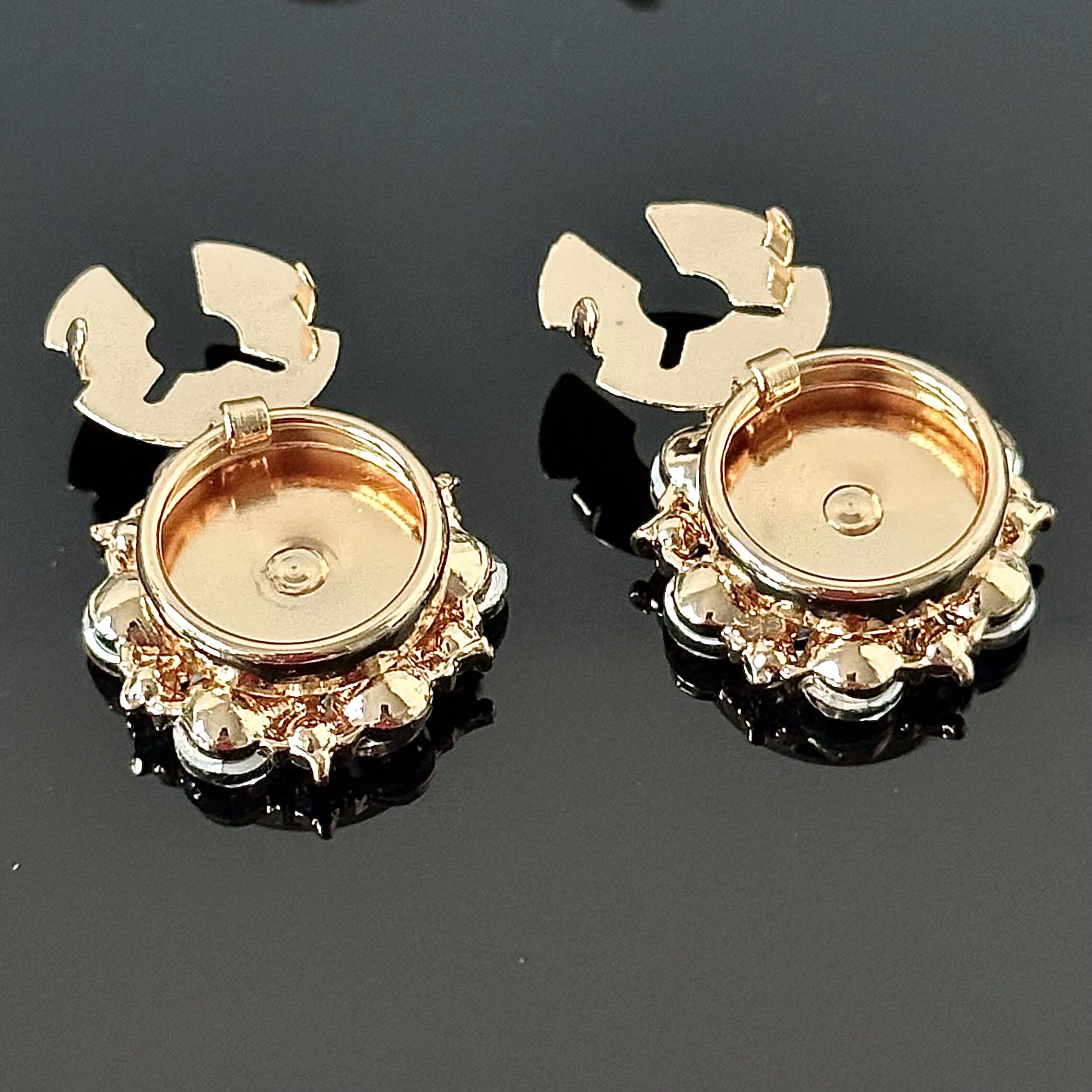 Pozłacane nakładki na guziki do koszuli z kamieniami Swarovskiego w stylu La bella epoque. Wspaniałe rozwiązanie, już nie musisz szukać koszuli bez guzików, teraz nakładki nakładasz lub wsuwasz na istniejące guziki i cieszysz się wyjątkowym wyglądem. Pochodzą z Londynu, należały do kolekcjonera spinek i nie były nigdy używane. Kamienie z przepiękną głębią i brylantowym odbiciem, dzięki szlifowi w zależności od konta padania światła, oddaje kolorystyczny urok i blask, wspaniały efekt optyczny. Całość pokryta powłoką zabezpieczającą przed ciemnieniem, jak nowe.