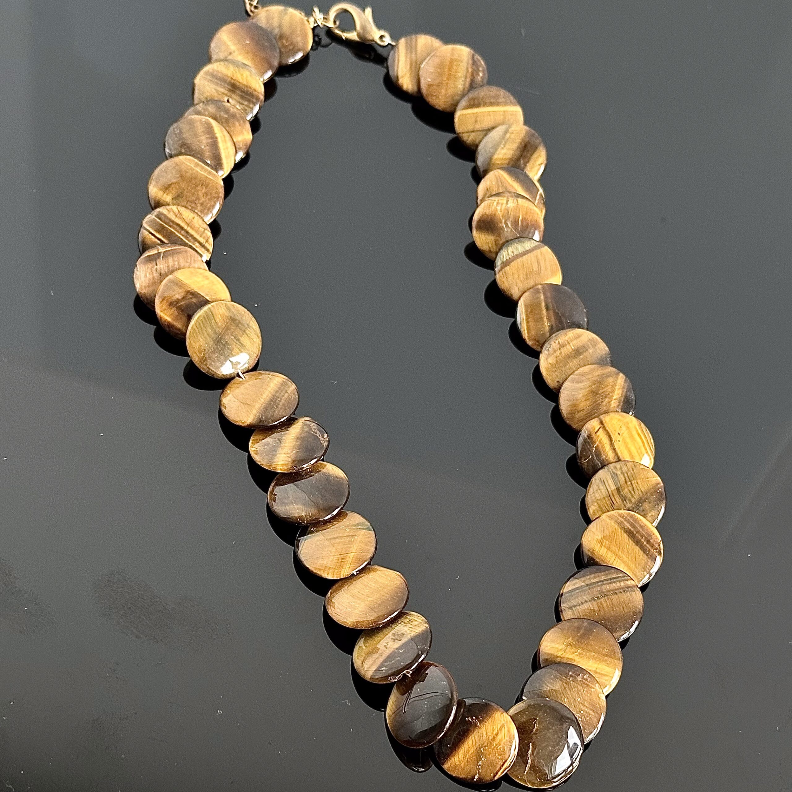 Naszyjnik z naturalnego Tygrysiego Oka. Wspaniałe regularne płaskie okrągłe i oszlifowanego Tygrysiego Oka, połączone w jeden sznur tworzy wspaniały delikatny i ciepły kolorystycznie naszyjnik. Jest to wyjątkowy wyrób z lat 80-tych ubiegłego stulecia, który znajduje się w bardzo dobrym stanie i jest godny polecenia.