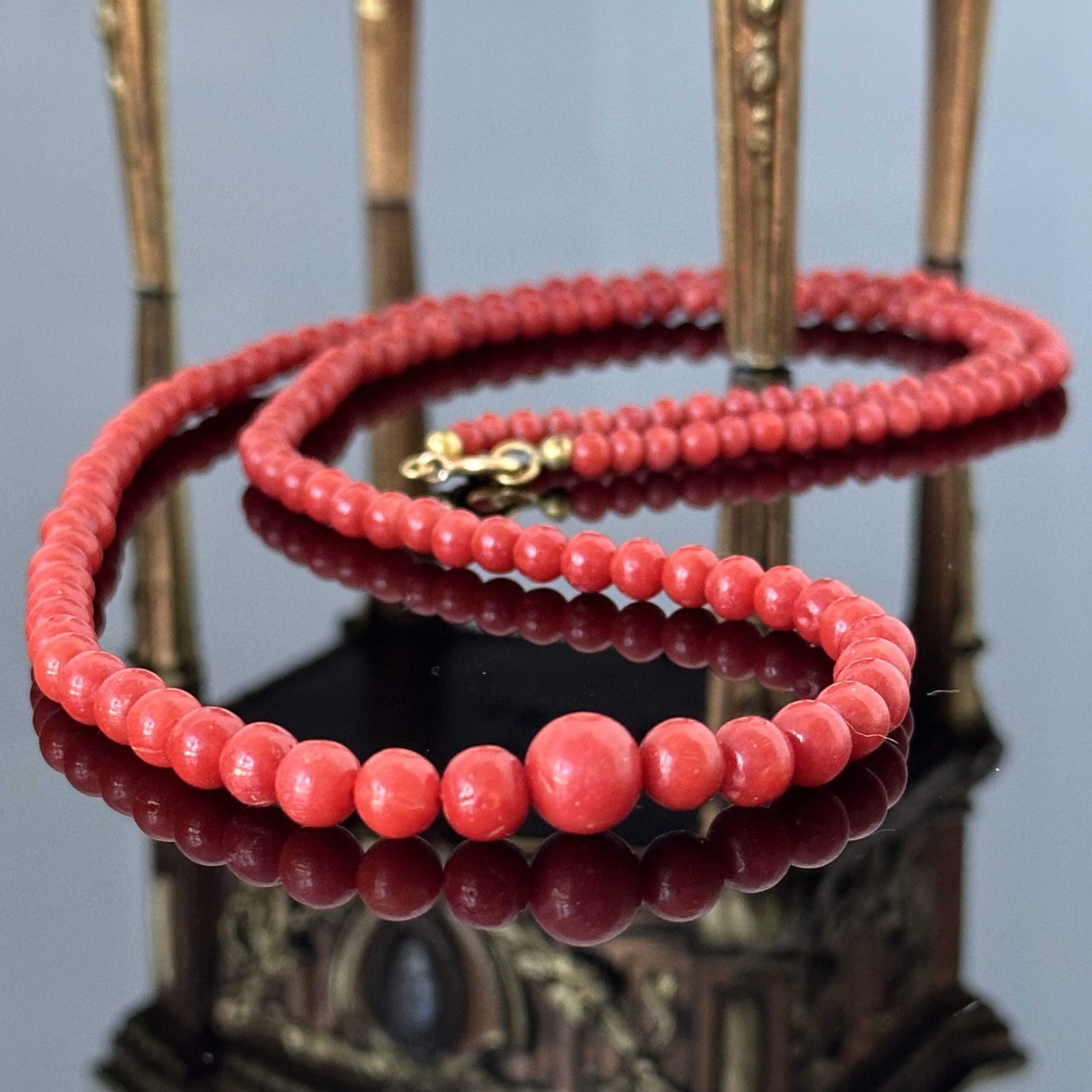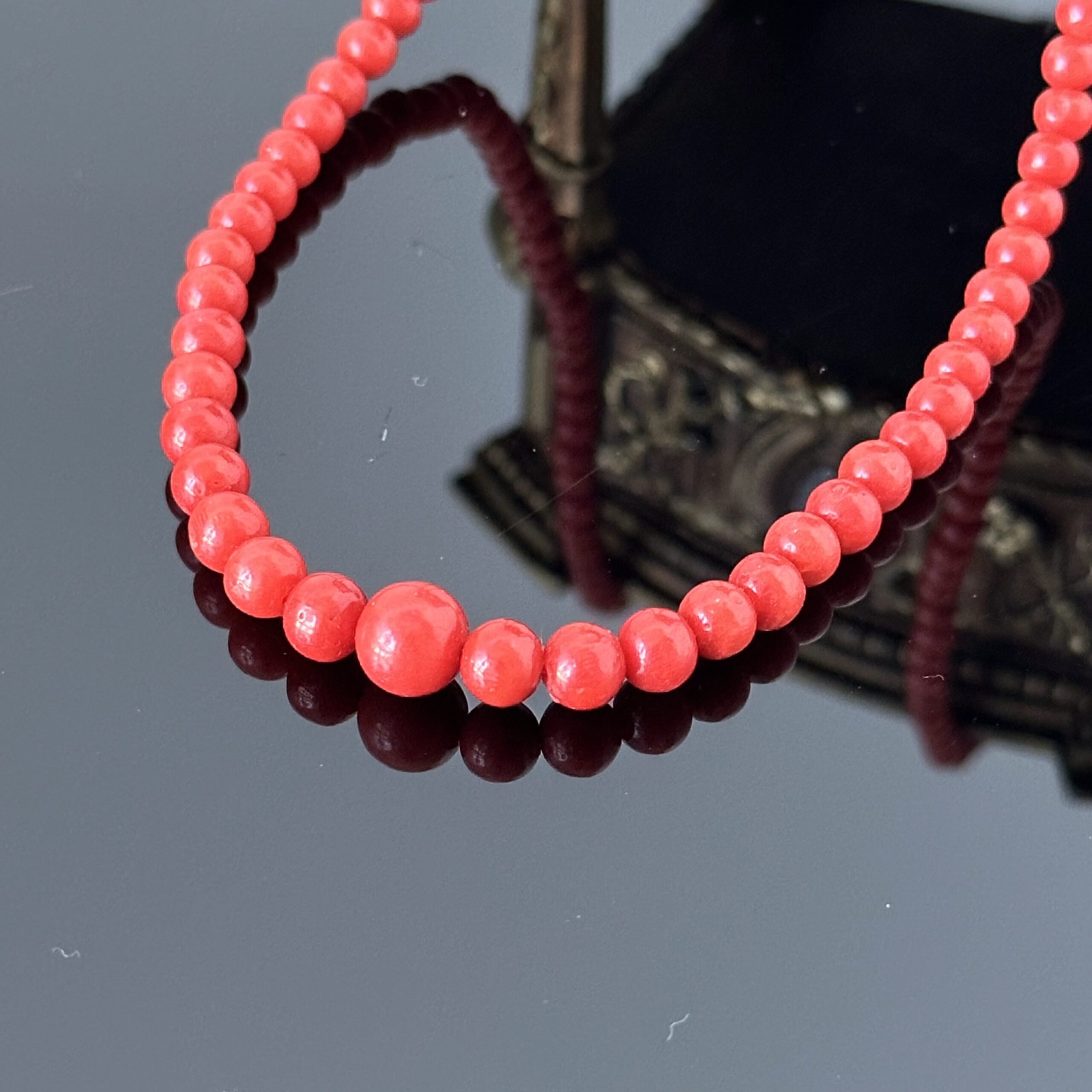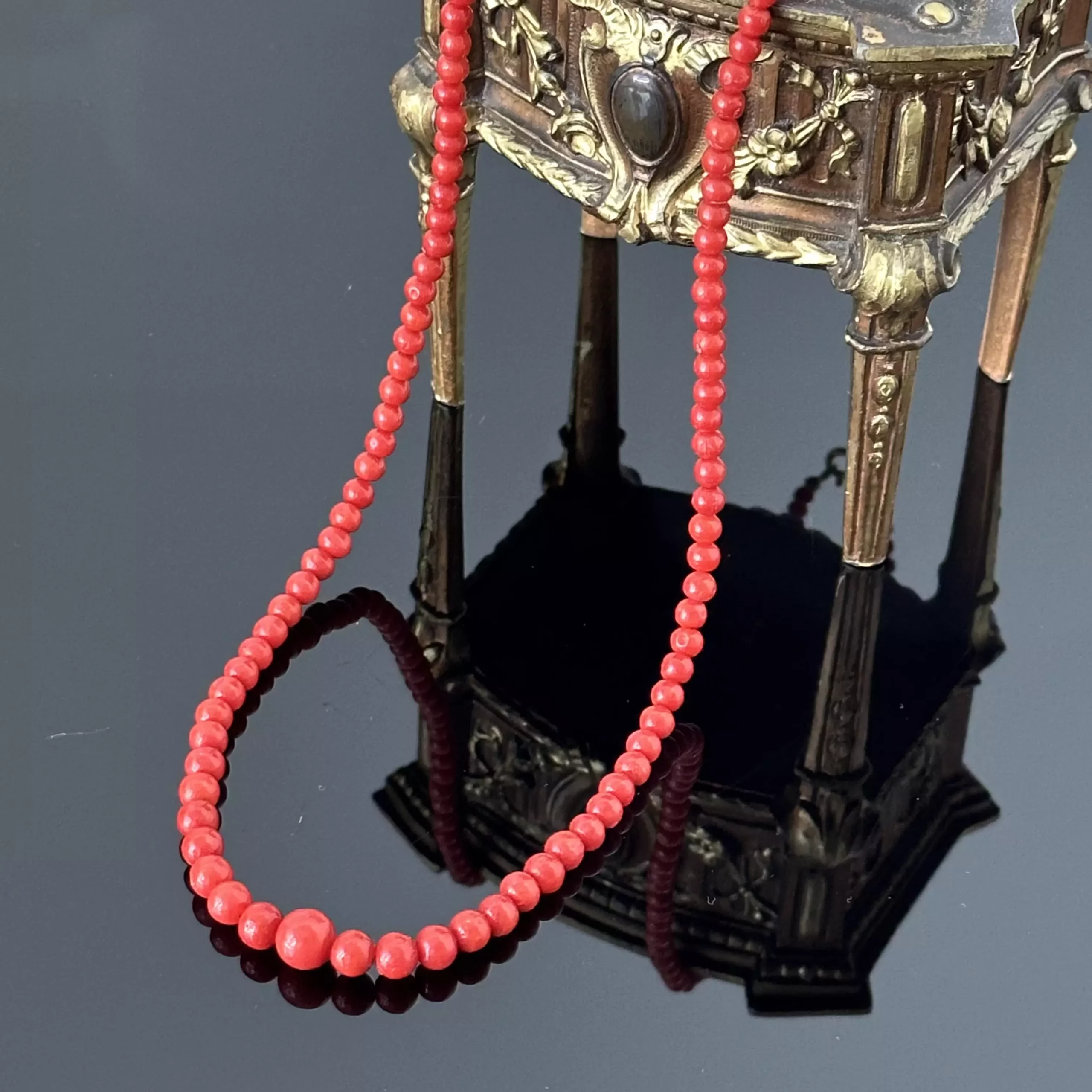 Naszyjnik z naturalnych czerwonych korali, o bardzo intensywnej czerwono koralowej barwie w bardzo dobrym stanie. Szacujemy że naszyjnik został wykonany ok. 1920 roku. Zapięcie wykonane ze srebra próby 925 i pozłacane, oceniamy że zapięcie zostało w późniejszym okresie wymienione.