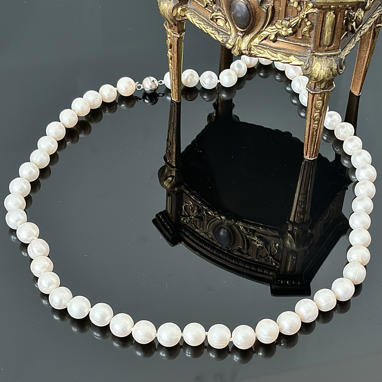 Klasyczny naszyjnik wykonany z naturalnych pereł o delikatnym, kremowo-białym odcieniu i subtelnym, jedwabistym połysku. Perły mają zbliżony rozmiar i naturalną strukturę, co podkreśla ich autentyczny charakter i dodaje biżuterii szlachetności. Naszyjnik zapinany jest na praktyczne magnetyczne zapięcie, które zapewnia wygodę użytkowania oraz estetyczne wykończenie. Prosta, harmonijna forma sprawia, że jest to biżuteria niezwykle uniwersalna – idealna zarówno do codziennych stylizacji, jak i na eleganckie okazje. To ponadczasowy dodatek, który nigdy nie wychodzi z mody i doskonale sprawdzi się jako klasyczny element garderoby lub elegancki prezent.