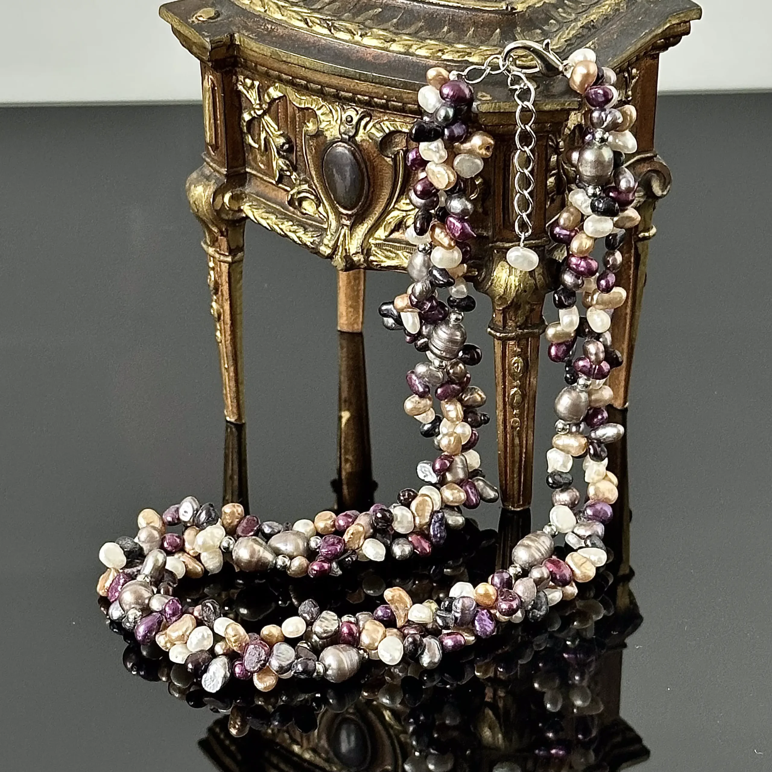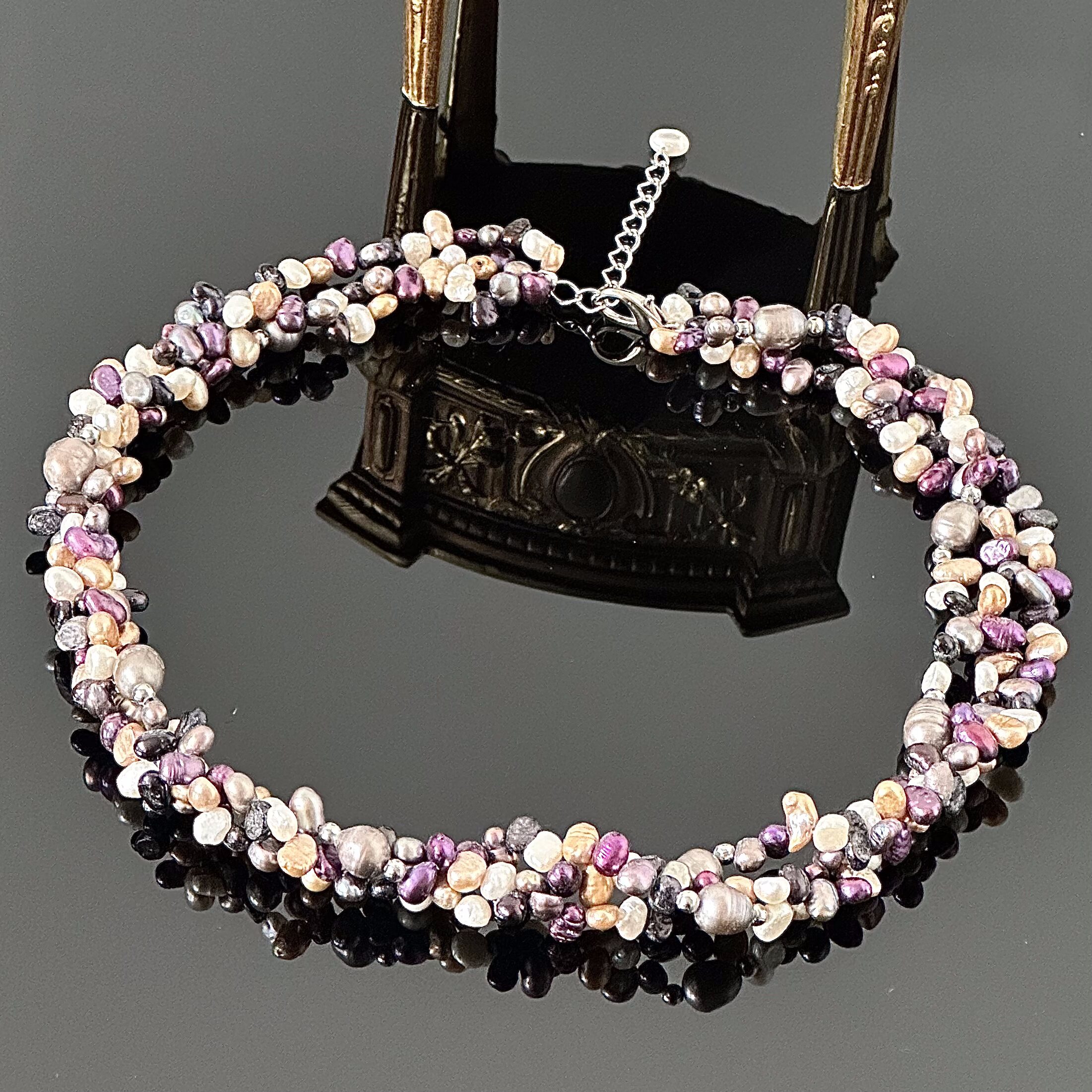 Naszyjnik trzy rzędowy z naturalnymi perłami w wielu kolorach, pochodzący z Anglii, jest to wyrób okresu Art Deco ok. 1970 roku. Wspaniały masywny, dekoracyjny naszyjnik, Perły są naturalne hodowlane słodkowodne, zapięcie srebrne z możliwością regulacji długość naszyjnika, całość znajdują się w bardzo dobrym stanie.
