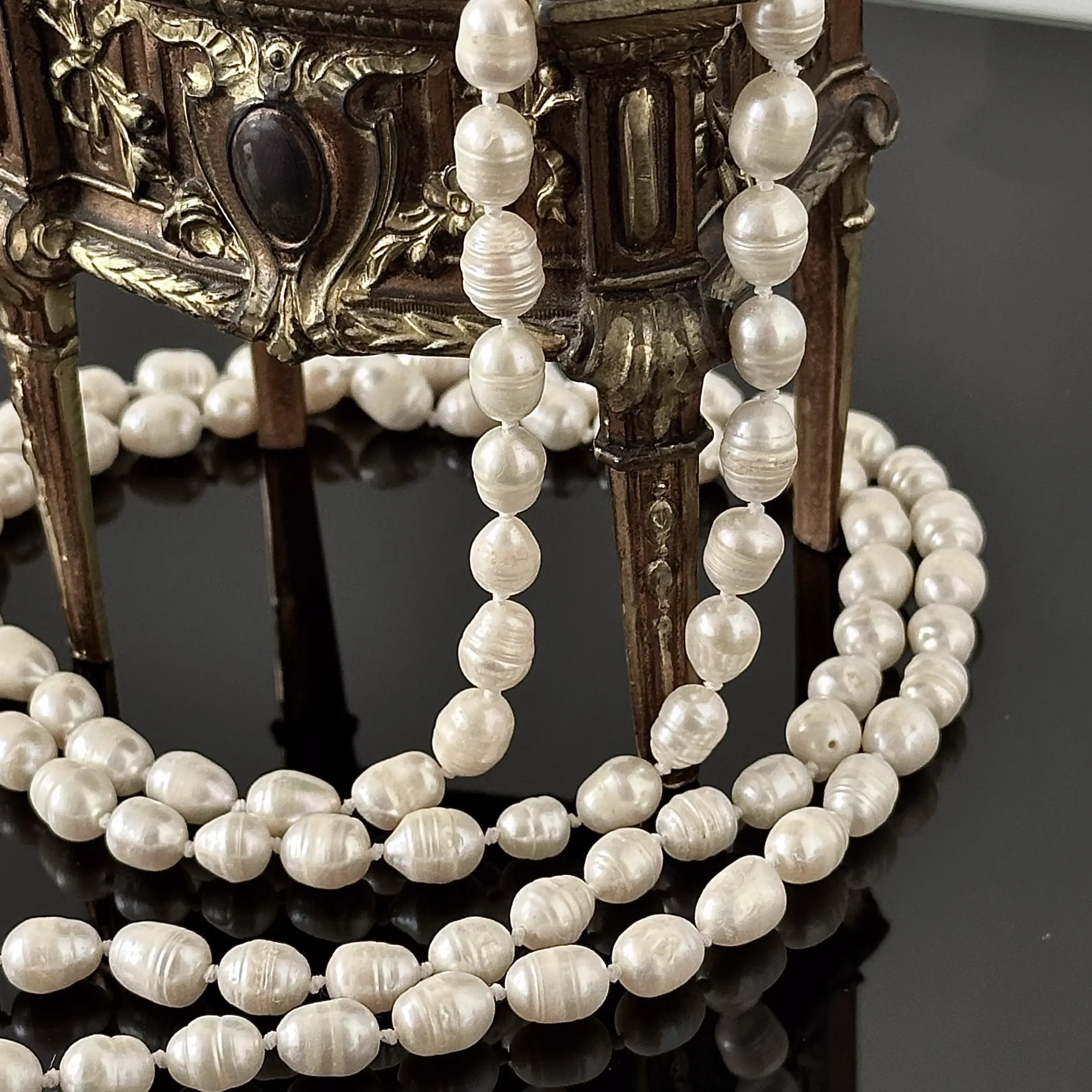 Duży i długi naszyjnik z naturalnych Pereł. Naszyjnik ten to wspaniały przykład wzornictwa sztuki Art Deco, pochodzi z Londynu gdzie został wykonana ok. 1980 roku, może stanowić również jako bransoletka. Artysta wykonał jednorzędowy długi naszyjnik z dużych pereł i połączył wszystkie koraliki linką jubilerską, przedzielając każdy z nich guzem aby zabezpieczyć przed ocieraniem, Całość znajduje się w idealnym stanie, jest okazały oraz godny polecenia.