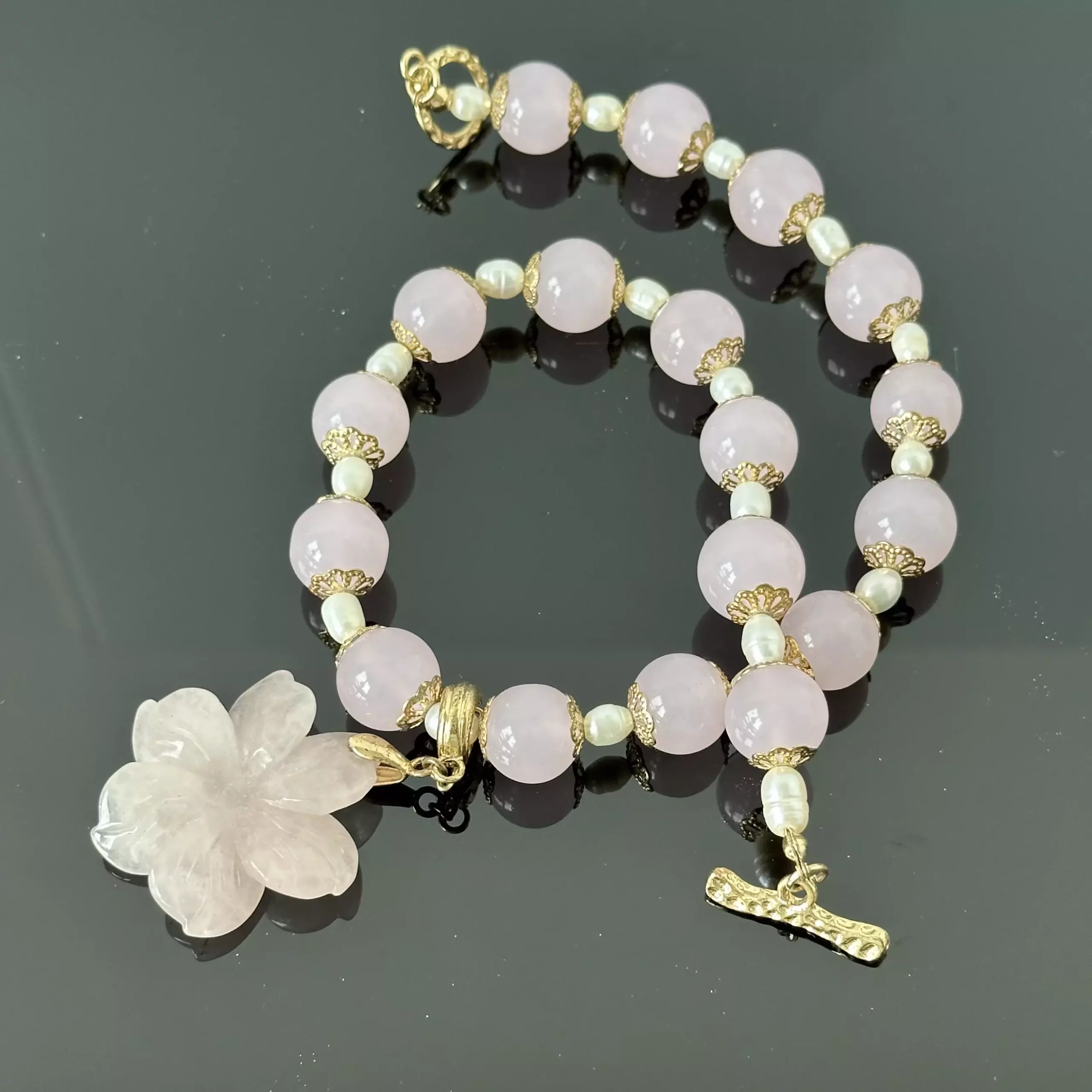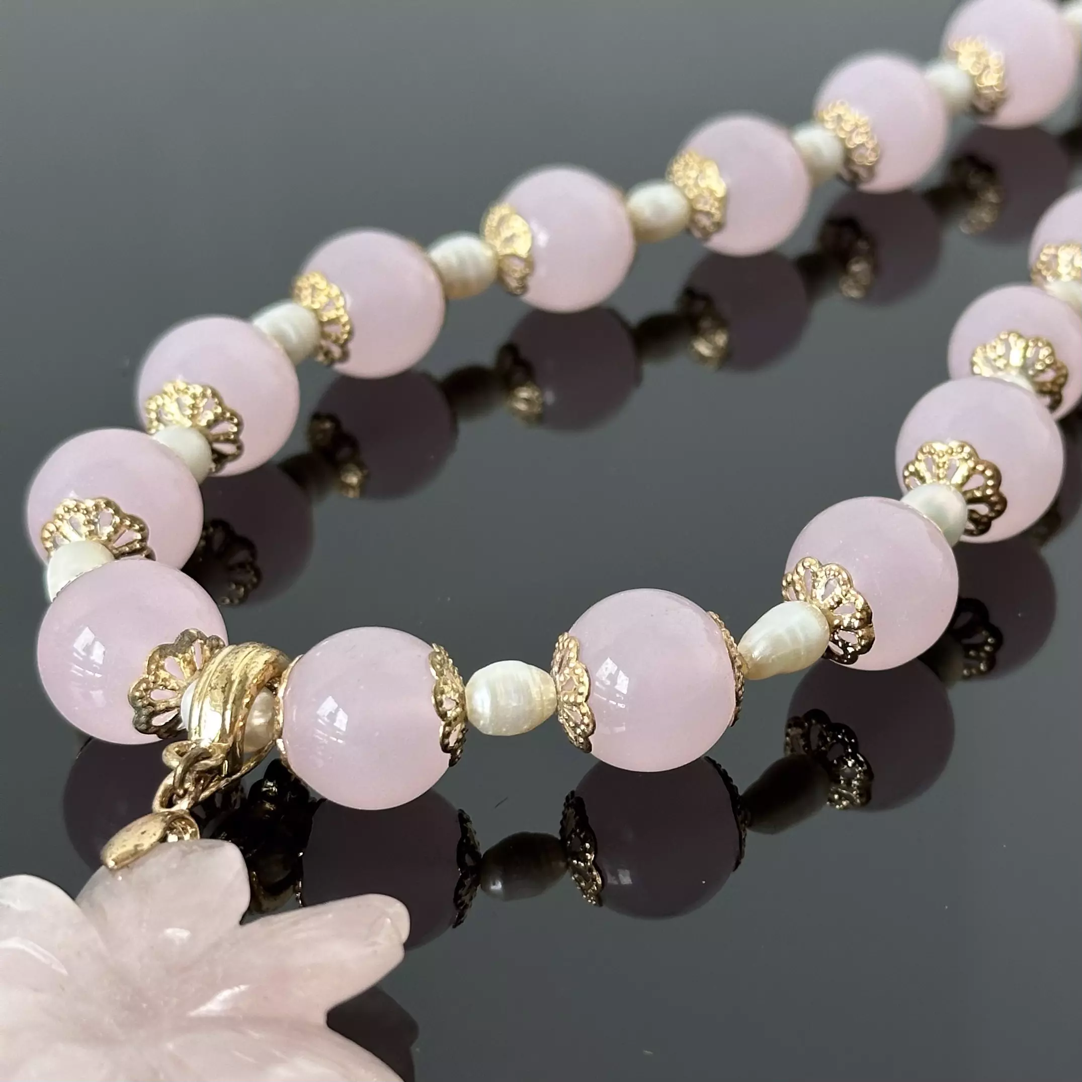 grube pozłocenie 18 karatowym złotem, naturalne Perły oraz naturalny Różowy Kwarc