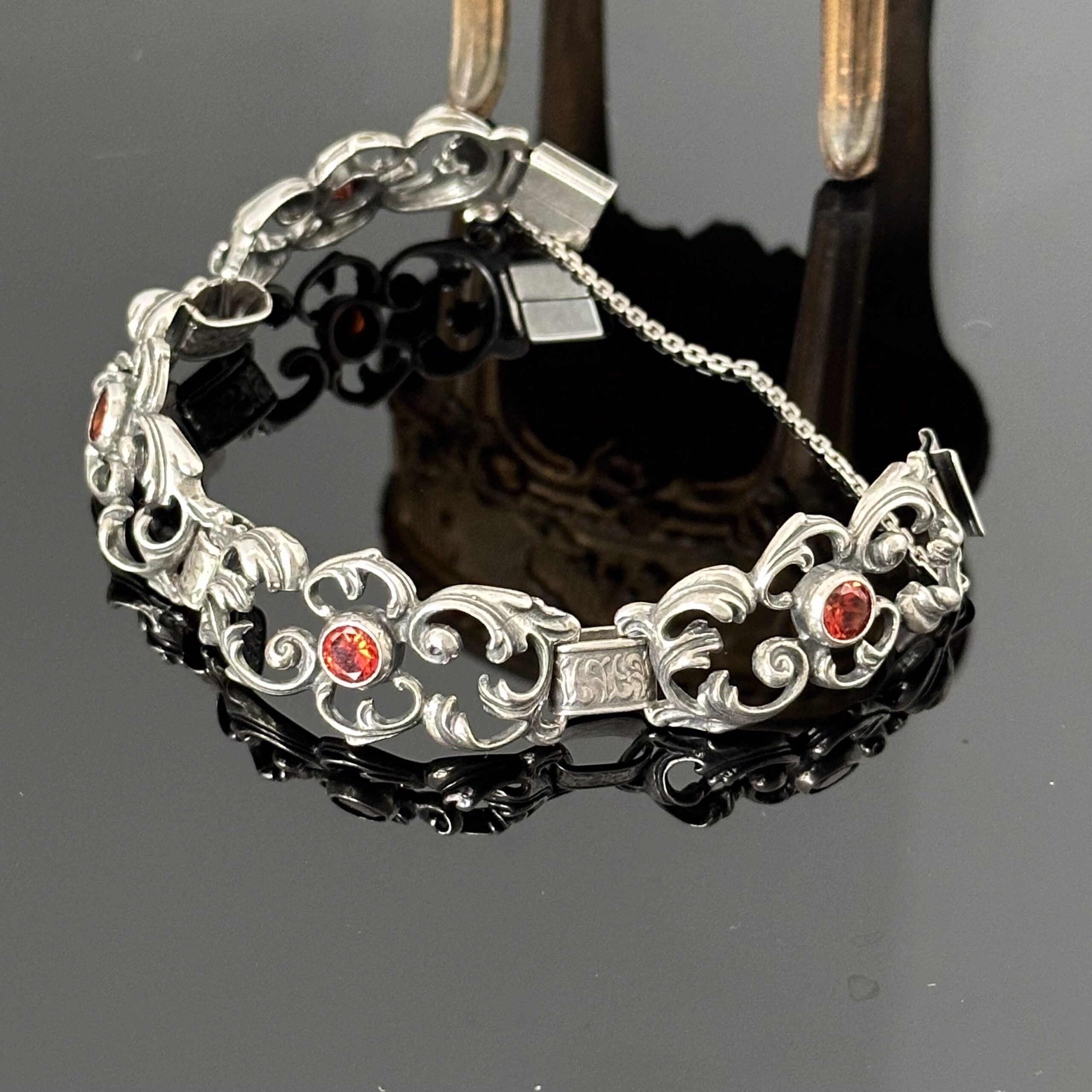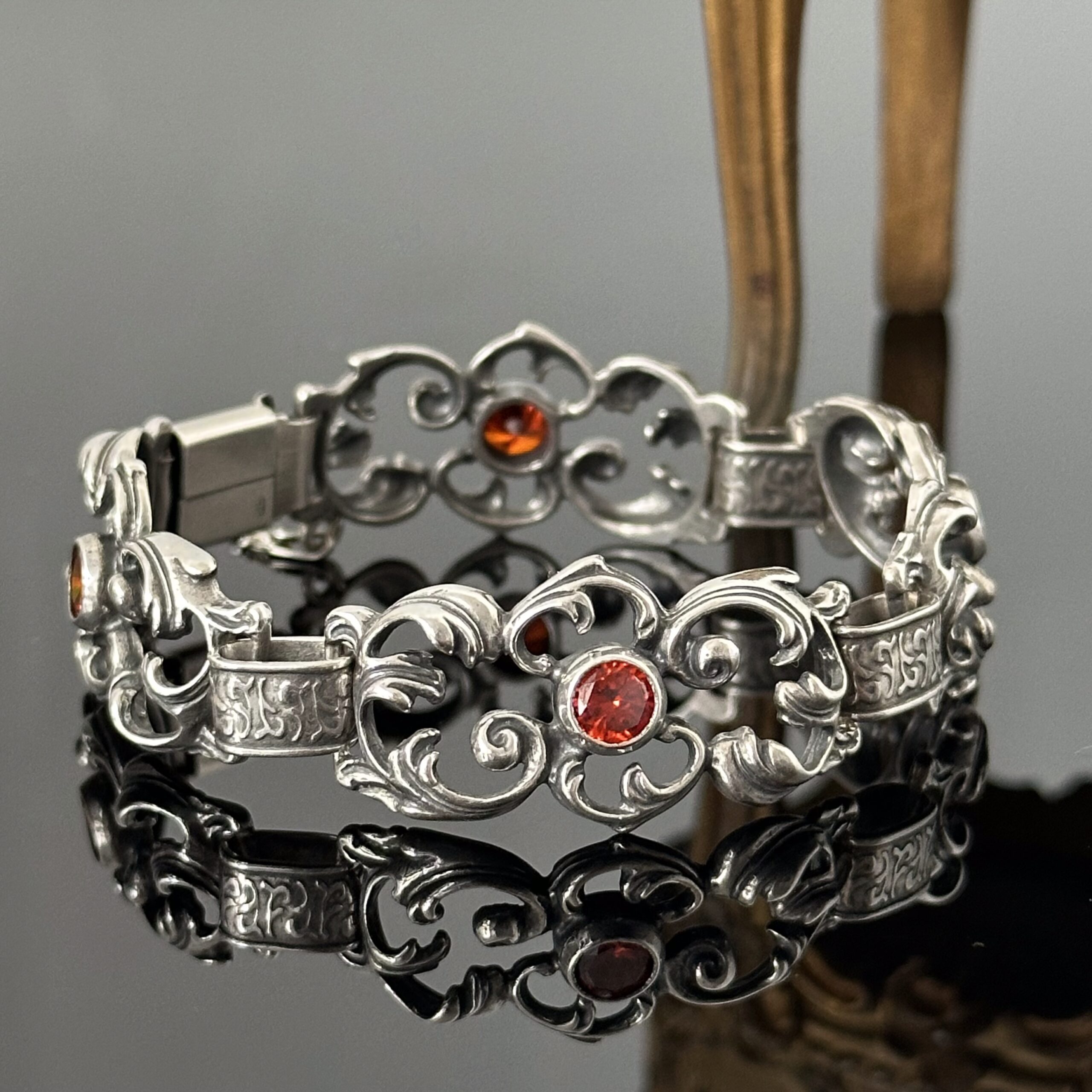 Srebrna neorenesansowa bransoletka z Pomarańczowymi Szafirami. Przepiękny i bardzo plastyczny projekt, został wykonany w całości z srebra próby 925. Bransoletka znajduje się w idealnym stanie. Pomarańczowy szafir jest rodzajem szafiru, który jest naturalnie zabarwiony na pomarańczowo. Składa się on z minerału korundu i jest ceniony za swój żywy pomarańczowy kolor. Pomarańczowe szafiry są rzadkie i można je znaleźć w różnych odcieniach, od bladego pomarańczowego do głębokiego, bogatego pomarańczowego. Są one często używane w wysokiej klasy biżuterii i mogą osiągać bardzo wysokie ceny. Szafir – znaczenie i symbolika Szafir, którego nazwa pochodzi ze starogreckiego sappheiros (niebieski kamień) to minerał, któremu już od starożytności przypisuje się niesamowite cechy. Kamień ten, ofiarowany na zaręczyny, miał gwarantować stabilność związku i wierność partnerów. Ponadto miał umacniać uczucie pary, chronić od pokus i wzmacniać silną wolę. Zazwyczaj ofiarowywany był w pierścionku, ale częstym zwyczajem było również umieszczanie go w naszyjniku. Wierzono również, że kamień ten jest święty i symbolizuje prawdę, pokój i nieśmiertelność, stąd też przez wiele wieków nosić go mogli tylko wysoko postawieni członkowie rodziny królewskiej, królowie i dostojnicy kościelni. W średniowieczu wierzono również, że minerał ten ze względu na swoją boskość chroni od złych duchów, a pierścień z szafirem chroni właściciela przed manipulacją.