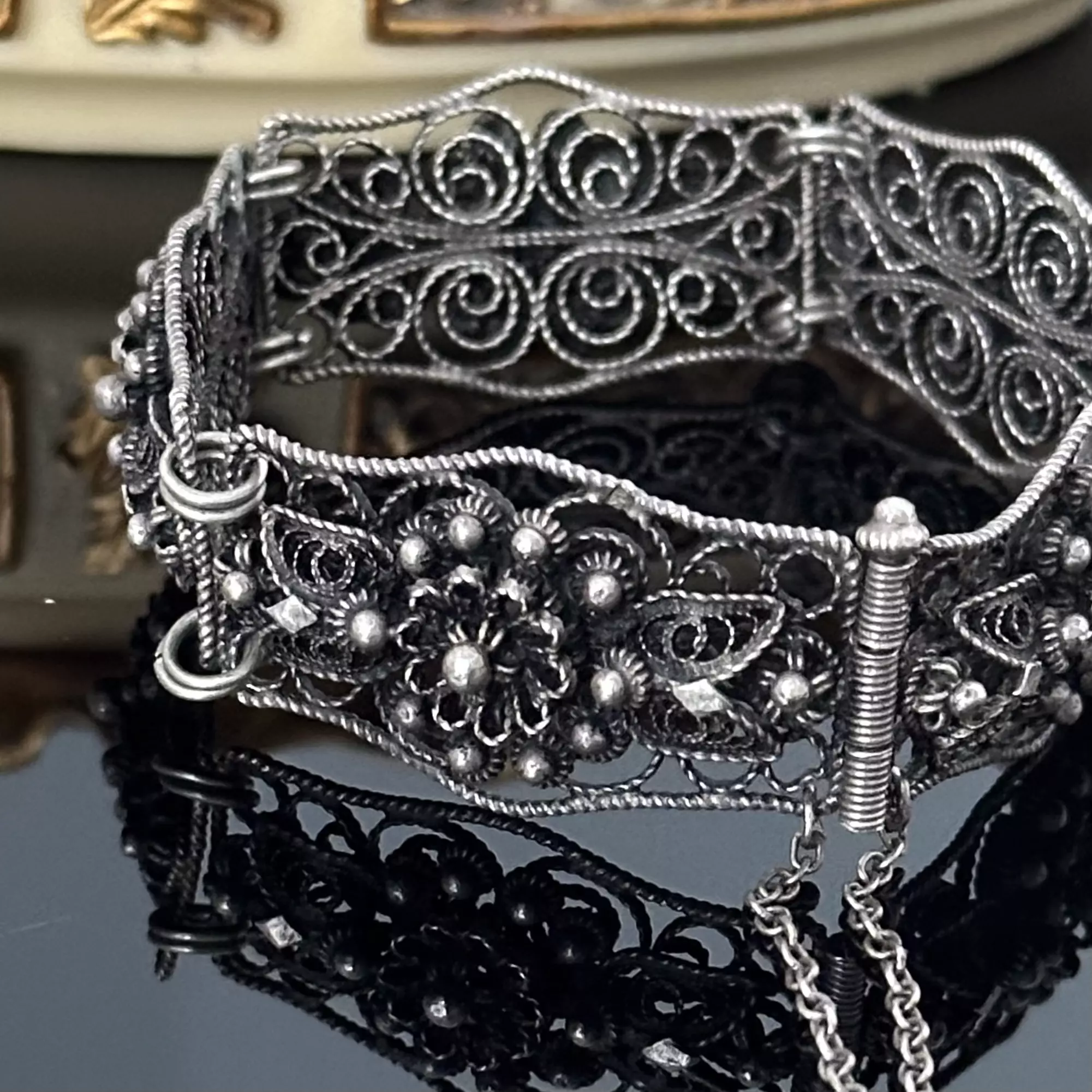 Srebrna bransoletka ażurowa - oryginał z ok. 1920 rok To przykład misternej sztuki jubilerskiej okresu lat 20-tych ubiegłego stulecia.