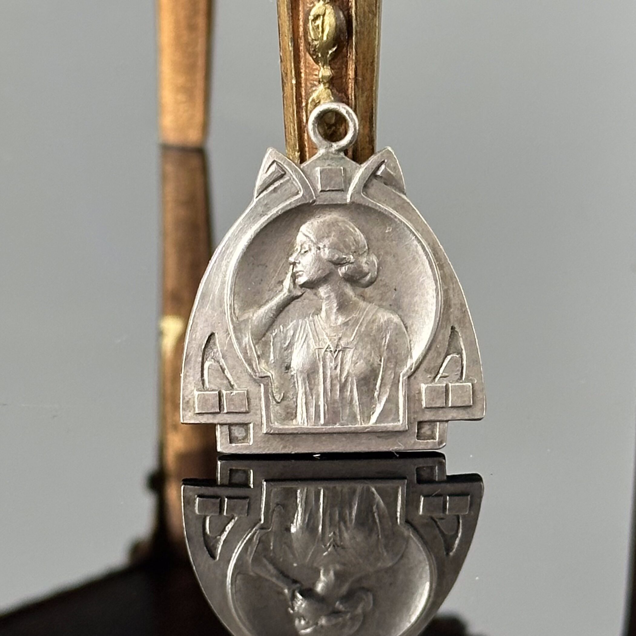 Przywieszka srebrna - oryginalna secesja wiedeńska Alfons Mucha. Srebrna przywieszka do łańcuszka w swoim oryginalnym stanie, wykonana z srebra próby 800 (próba bita i potwierdzona kwasowo) około 1900 roku w Wiedniu. Motyw i wzór autorstwa Alfonsa Muchy, wyjątkowy eksponat. Stan jak na swój wiek bardzo dobry, celowo nie został wypolerowany i znajduje się w swoim oryginalnym stanie. Alfons Maria Mucha 1860-1939r. – jeden z najwybitniejszych artystów secesyjnych (fr. art nouveau) – ilustrator i malarz. Urodził się w miejscowości Ivančice w Czechosłowacji, gdzie spędził pierwsze lata swojego życia. Już jako dziecko interesował się rysunkiem i malarstwem. W wieku 15 lat porzucił szkołę, aby zostać uczniem w zakładzie litograficznym w Brnie. Pracował tam przy tworzeniu plakatów i innych wydruków, a także pomocnikiem kamieniarza. Mucha czerpał z tej pracy wiele inspiracji i doświadczeń, które pomogły mu w rozwoju jego artystycznej kariery. W wieku 20 lat rozpoczął studia w Akademii Sztuk Pięknych w Monachium. W 1887 roku przeniósł się do Paryża, gdzie rozpoczął studia na kierunku technik malarstwa, rysunku i kompozycji. W tym czasie Mucha pracował również jako ilustrator, rysownik i projektant. W 1894 roku, na zamówienie Sary Bernhardt, zaprojektował słynny plakat teatralny, który przyniósł mu międzynarodową sławę i określenie ikony secesji. Od tamtej pory, Mucha zaczął tworzyć plakaty, grafiki i ilustracje na zamówienie. Alfons Mucha wierzył, że sztuka powinna mieć wpływ na społeczeństwo i zmieniać świat na lepsze. Dlatego starał się tworzyć dla wszystkich, a nie tylko dla wybranej elity. Z tego względu jego prace często miały charakter edukacyjny i propagowały wartości takie jak miłość, harmonia i równość. Styl i inspiracje Alfonsa Muchy Styl artysty, nazywany “le style Mucha”, charakteryzował się połączeniem naturalnych motywów z ornamentyką i kolorystyką, co tworzyło wrażenie harmonii i równowagi. Prace malarza cechuje bogactwo detali, precyzja i dbałość o każdy element kompozycji. W stylu Muchy często pojawiają się eleganckie linie, kobiece postacie, długie falujące włosy i zmysłowe rysy twarzy. Jednym z głównych źródeł inspiracji Muchy była natura. Artysta uwielbiał obserwować rośliny, zwierzęta i krajobrazy. Uwielbiał też sztukę japońską. Wiele z jego prac zawiera elementy tamtejszej estetyki, takie jak płaskie, zgeometryzowane formy i asymetryczne kompozycje. W swoich pracach często przedstawiał motywy związane z kulturą ludową i folklorem, kojarzącym się mu się z jego dzieciństwem na Morawach. Jak mawiał sam artysta, korzenie jego prac można odnaleźć w sztuce Czeskiej. Zafascynowany historią słowian i tradycjami swojego kraju, bardzo często ukazywał ją również w dekoracjach wnętrz kościołów i innych budynkach publicznych. Ważnym elementem twórczości artysty była duchowość, którą czerpał z religii, filozofii i ezoteryki. Wiele z jego dzieł zawiera elementy symboliki i mistycyzmu, co nadaje im jeszcze głębszy wymiar i przesłanie. Art Nouveau Okres pomiędzy 1890, a 1914 rokiem, opisywany był różnie w różnych językach. We Francji było to art noveau, w Niemczech Jugendstill, w Wielkiej Brytanii Arts and Crafts Movement zaś w Austro-Węgrzech po prostu secesja. Czas ten obfitował w eksperymenty z nowymi technikami, materiałami i motywami. Gustav Klimt w swoim malarstwie sięgnął po złoto, jubilerzy secesyjni sięgali np. po emalię. Biżuteria w stylu secesyjnym cechowała się dużą wyrazistością, zarówno w formie, jak i w kolorze. Techniki emaliowania, jak basse-taille, champleve, cloisonné i plique-à-jour, pozwalały na osiągnięcie tej wyrazistości. Wśród motywów, które wiodły prym, wymienić należy chociażby motywy kwiatowe – storczyki, irysy, bratki, pnącza; zwierzęce – łabędzie, pawie, węże, ważki czy stworzenia mitologiczne. Istotne znaczenie miała także kobieca sylwetka. Co ciekawe, nowy nurt przesunął nieco punkt ciężkości sztuki jubilerskiej z kamieni szlachetnych, na sam projekt artystyczny. Przykładem takiego podejścia są brożki z ważką Lalique, będące istnym arcydziełem sztuki emalierskiej. Biżuterię belle époque cechowała fantazja, bogactwo wzornictwa i artystyczne wizje. Kres przyniosła jej I wojna światowa, która zmieniła nastawienie społeczne i doprowadziła do rozwinięcia się nowego, nieco bardziej stąpającego po ziemi stylu.