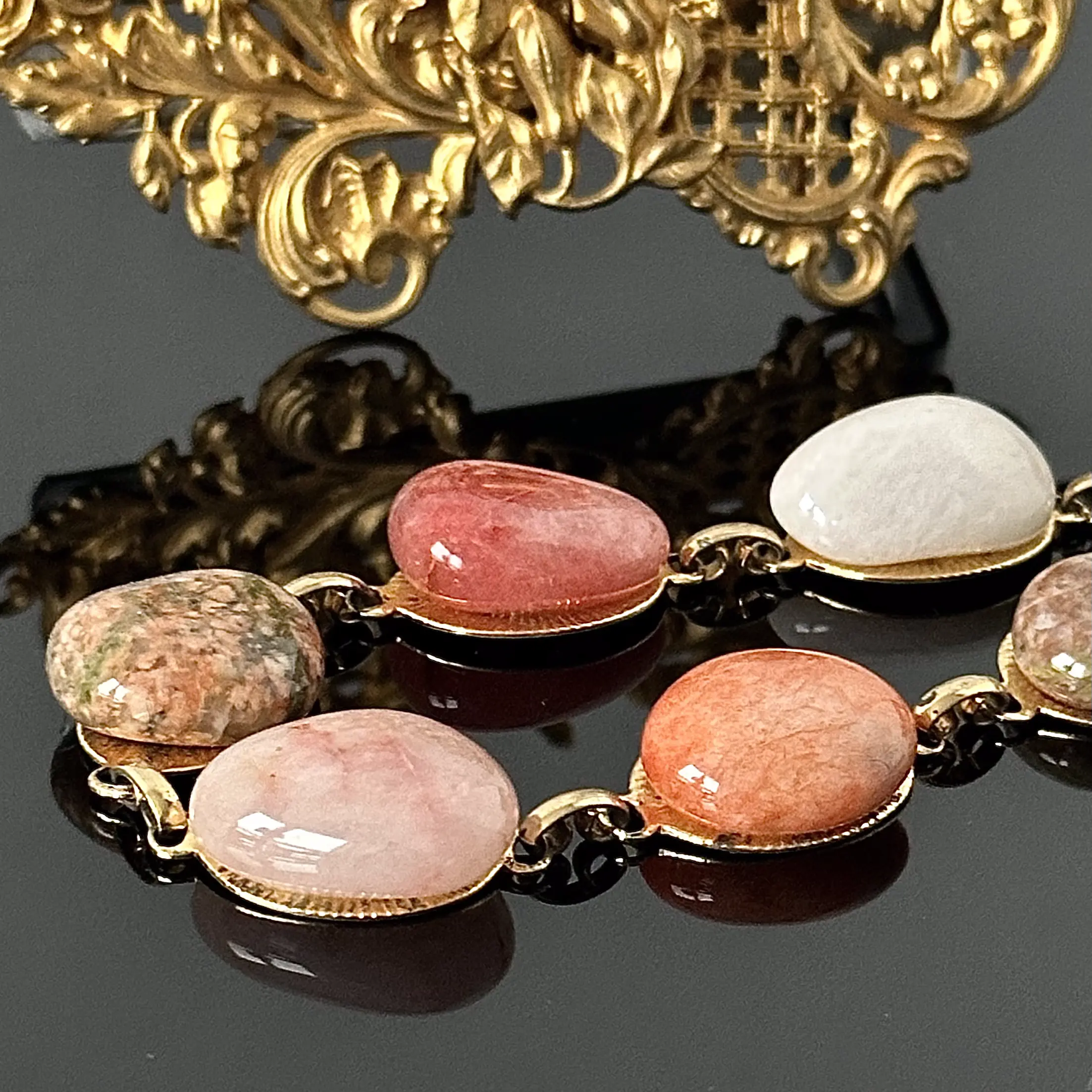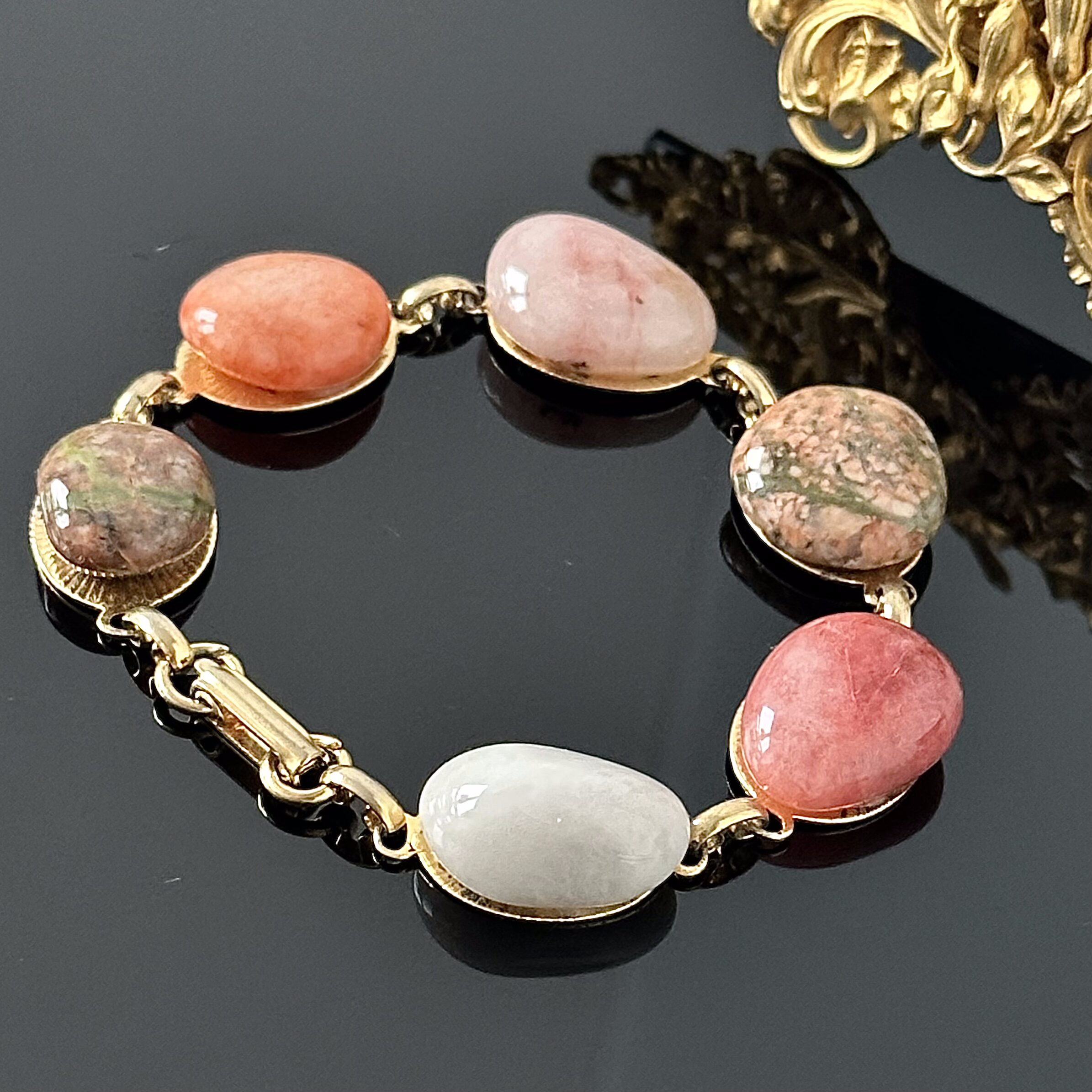 Bardzo okazała pozłacana bransoletka Bala Bala, wykonana ok. 1970 roku, składająca się z naturalnych kamieni Zielonego Jaspisu, Różowego Kwarcu, Pomarańczowego Agatu, Chalcedonu i Złotego Topazu. Wspaniała powtarzająca się kompozycja kolorystyczna przeplatana pozłacanymi elementami, bransoletka znajduje się w bardzo dobrym stanie i jest niezwykle dekoracyjna.