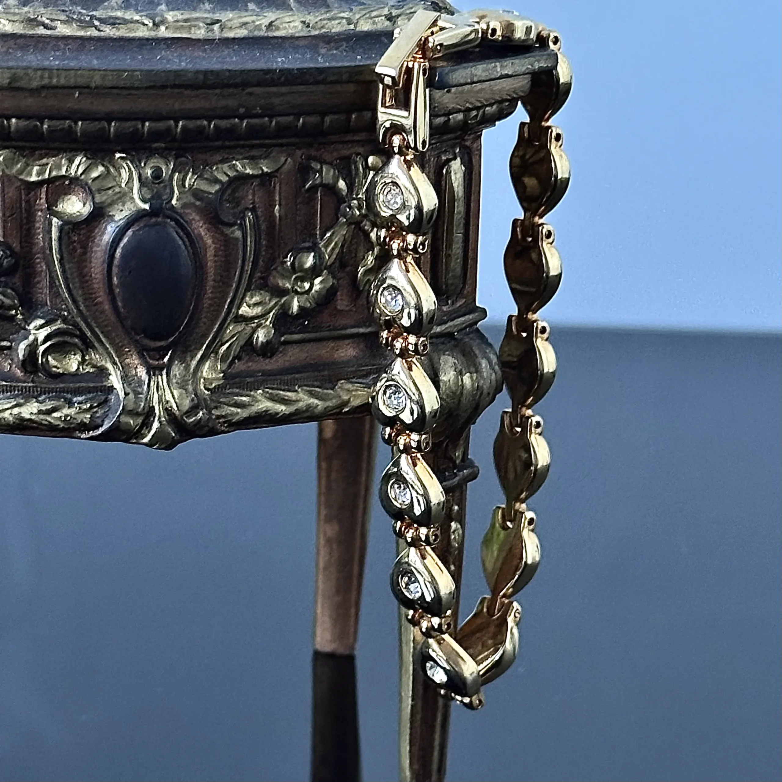 Pozłacana 24 karatowym złotem bransoletka tenisowa z Cyrkoniami, piękny masywny wysokiej klasy wyrób, mieniące się kamienie jak brylanty w żółtym złocie, nadają uroku temu projektowi. Bransoletka została w całości grubo pozłocona 24 karatowym złotem co zabezpiecza ją przed przetarciami i powoduje że będzie się stale błyszczeć. Wspaniały efektowny model do używania na codzień, bransoletka znajduje się w bardzo dobrym stanie jak nowa i jest godna polecenia.