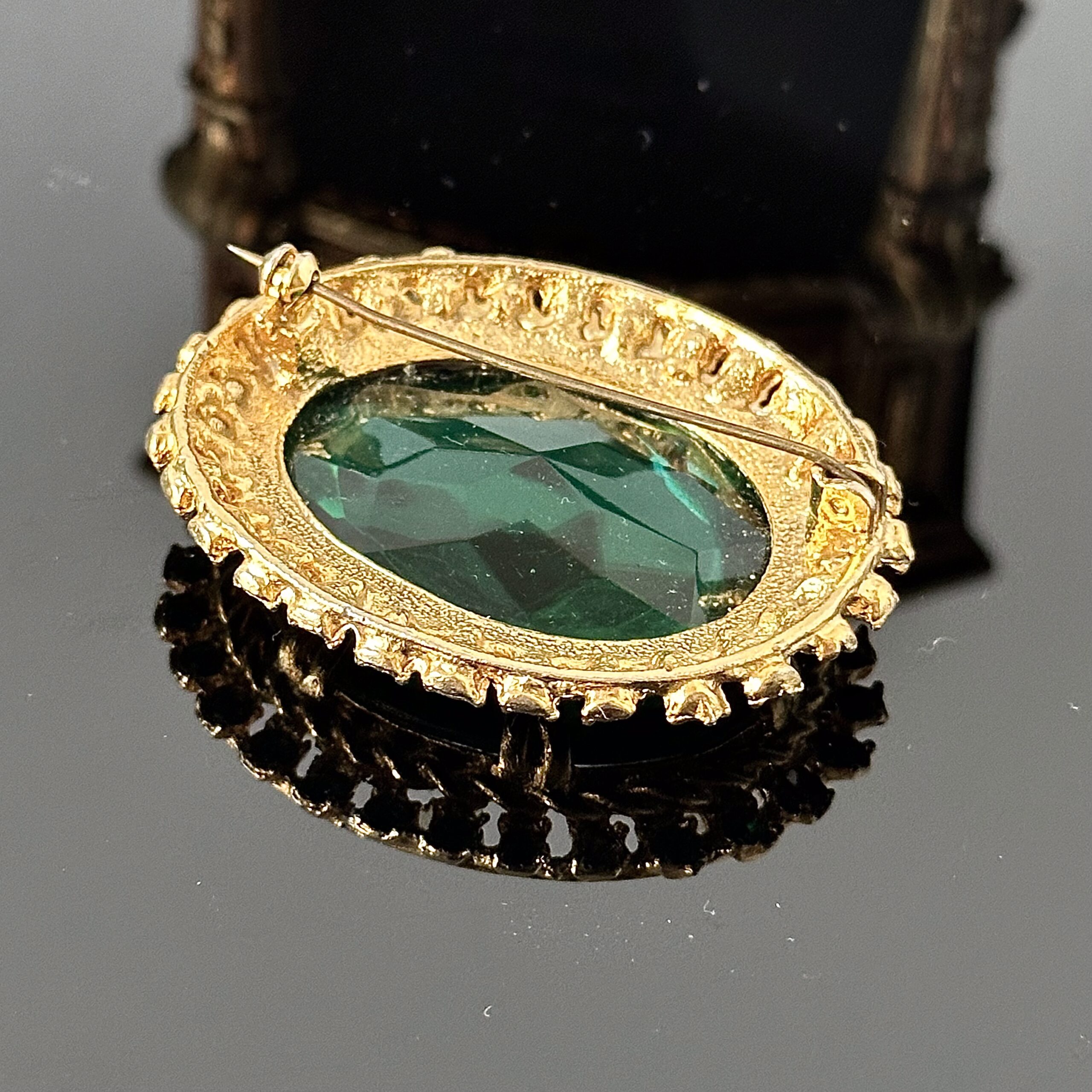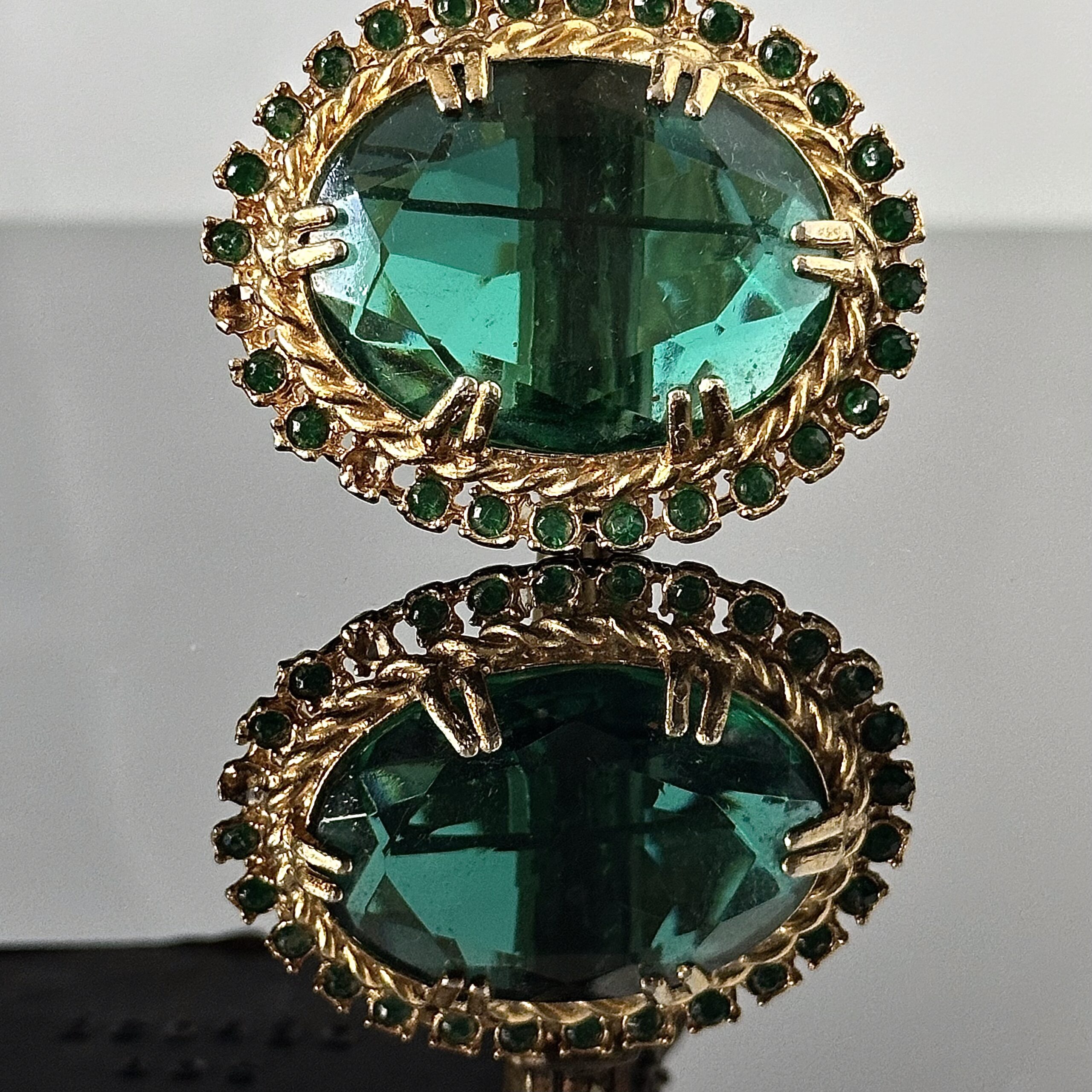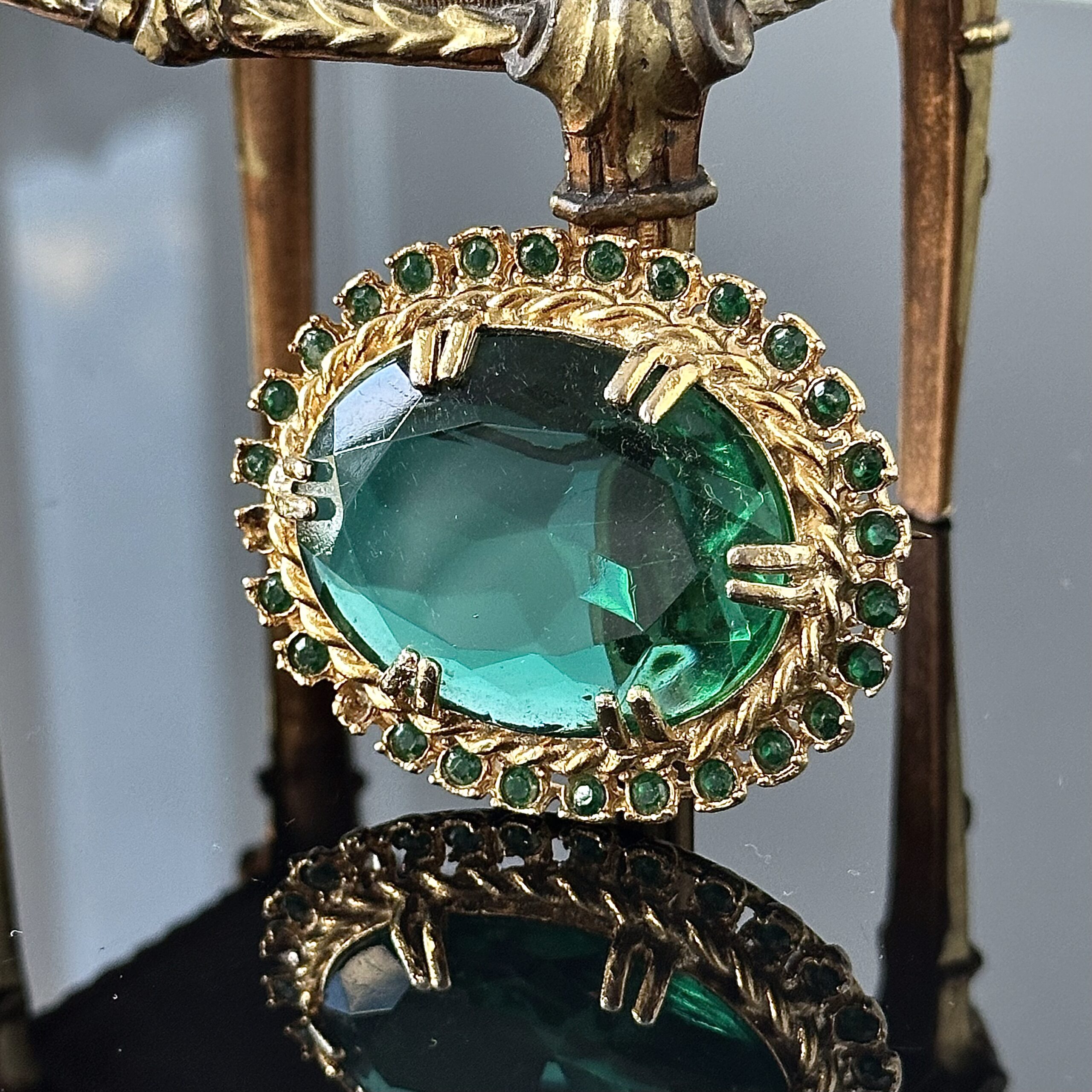 Pozłacana 24 karatowym złotem, centralnym kamieniem Szmaragdowym i wieloma małymi kamieniami Swarovskiego
