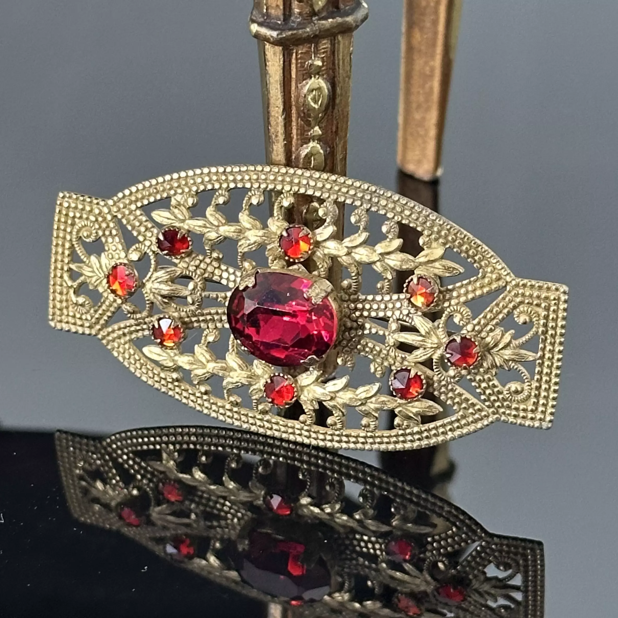 Przepiękny wyrób z ok. 1960 roku z Ameryki, wyprodukowany przez znanego Artystę Stanleya Haglera. Ta piękna broszka z czerwonymi kamieniami, została wykonana z mosiądzu i pozłocona w odcieniu starego złota. Wyjątkowo misterna robota oraz bardzo dekoracyjny wyrób który zwróci uwagę nie jednej osoby. Wyroby Haglera z lat 60-tych cieszą się do dziś wielkim zainteresowaniem celebrytów.