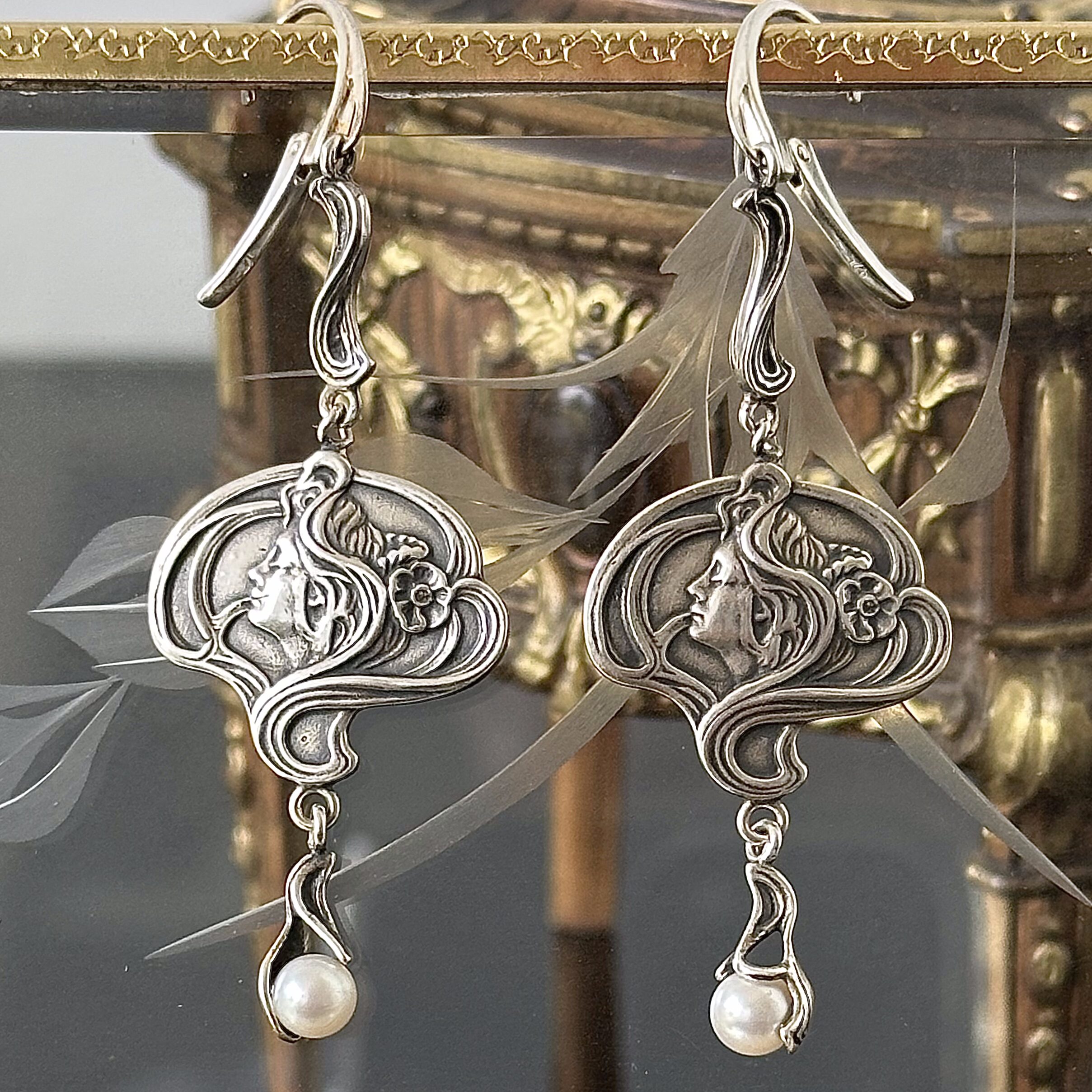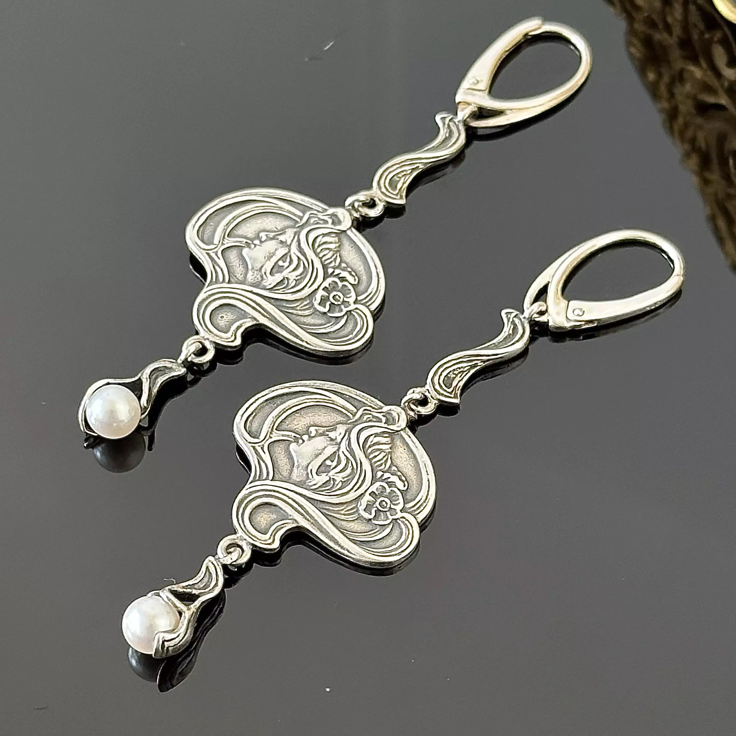 Secesyjne kolczyki srebrne z motywem młodej kobiety i pereł, wykonane przez naszych artystów z srebra próby 925. Bardzo realistyczny projekt wykonany z wielką dbałością o szczegóły, zdecydowanie polecamy dla miłośników tej stylistyki. Ciepłe miesiące dostarczyły artystom secesyjnym wielu motywów. Tak jak pierwsze kwiaty wiosny zwiastują nowy rok i odrodzenie życia po mrocznej zimie, tak też secesja pragnęła rozpocząć nowy rozdział w sztuce i życiu w ogóle u schyłku XIX wieku. W formalnym świecie tego nowego stylu dominowały kwiaty, wąsy, motywy zwierzęce i przyrodnicze – w miarę możliwości należało unikać odwoływania się do istniejących form i ornamentów. Na przykładzie obecnych kolczyków możemy zauważyć, że zapotrzebowanie na innowacje miało również wpływ na tradycję rzemiosła grawerów metali szlachetnych. Grawerzy metali szlachetnych XIX wieku niemal bez wyjątku nawiązywali do znanych motywów ze sztuki – słynnych obrazów, płaskorzeźb, a czasem nawet rzymskich monet. Leżało w naturze, że takie modele powstawały zazwyczaj dużo wcześniej niż same kamienie szlachetne. Tutaj jednak inwencja obrazowa jest z końca XIX wieku – prawdopodobnie nawet niezależna, oryginalna, całkowicie wpisując się w gust linearnej secesji z lat około 1910. Profil młodej kobiety rysuje się blisko wywiniętych motywów secesyjnych.