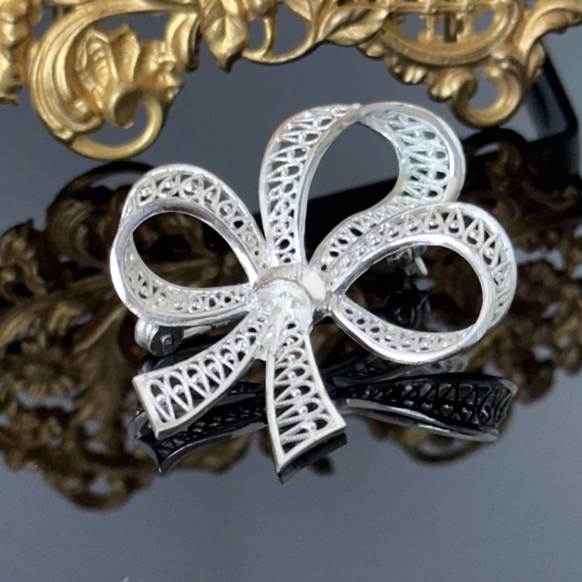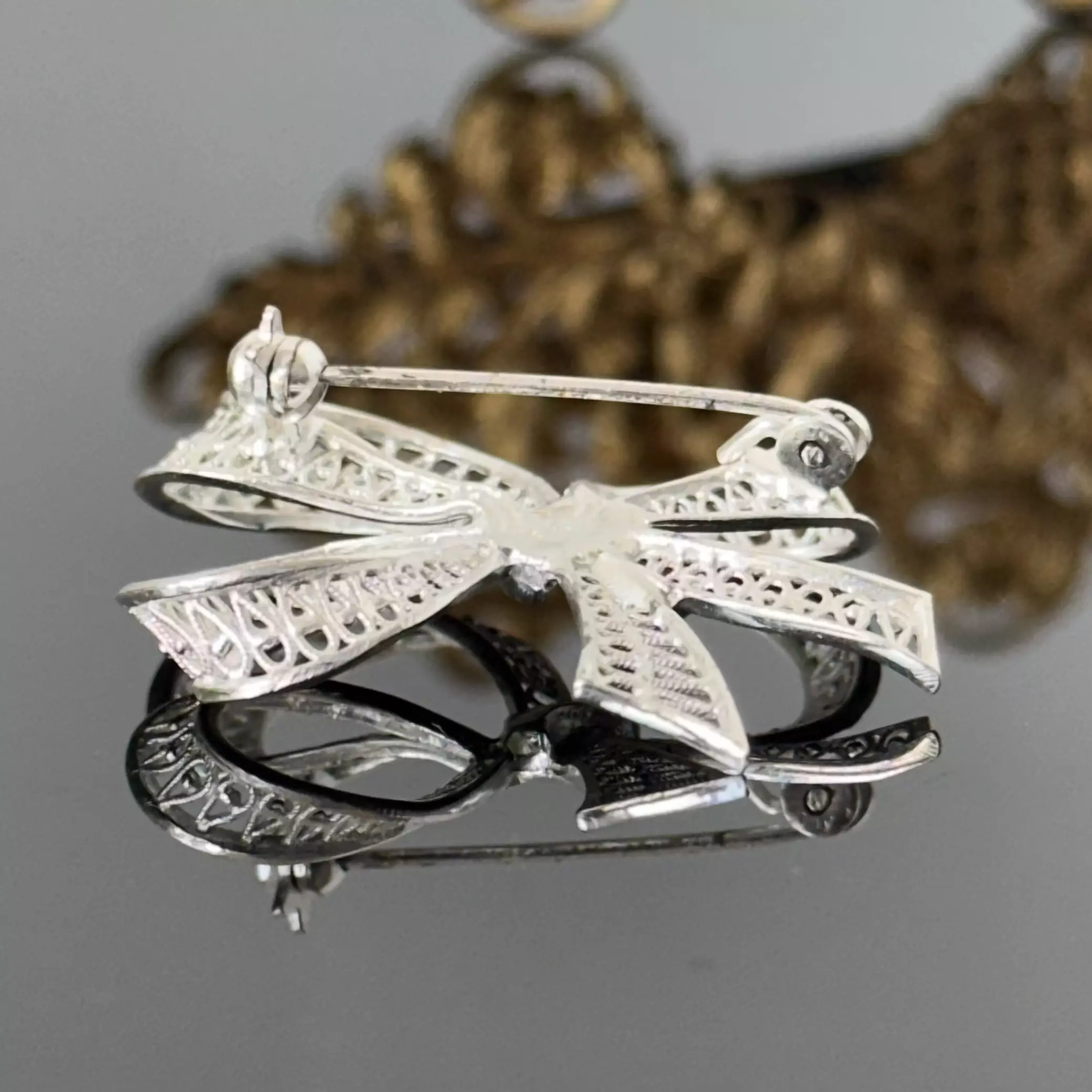 Srebrna ażurowa broszka kokarda