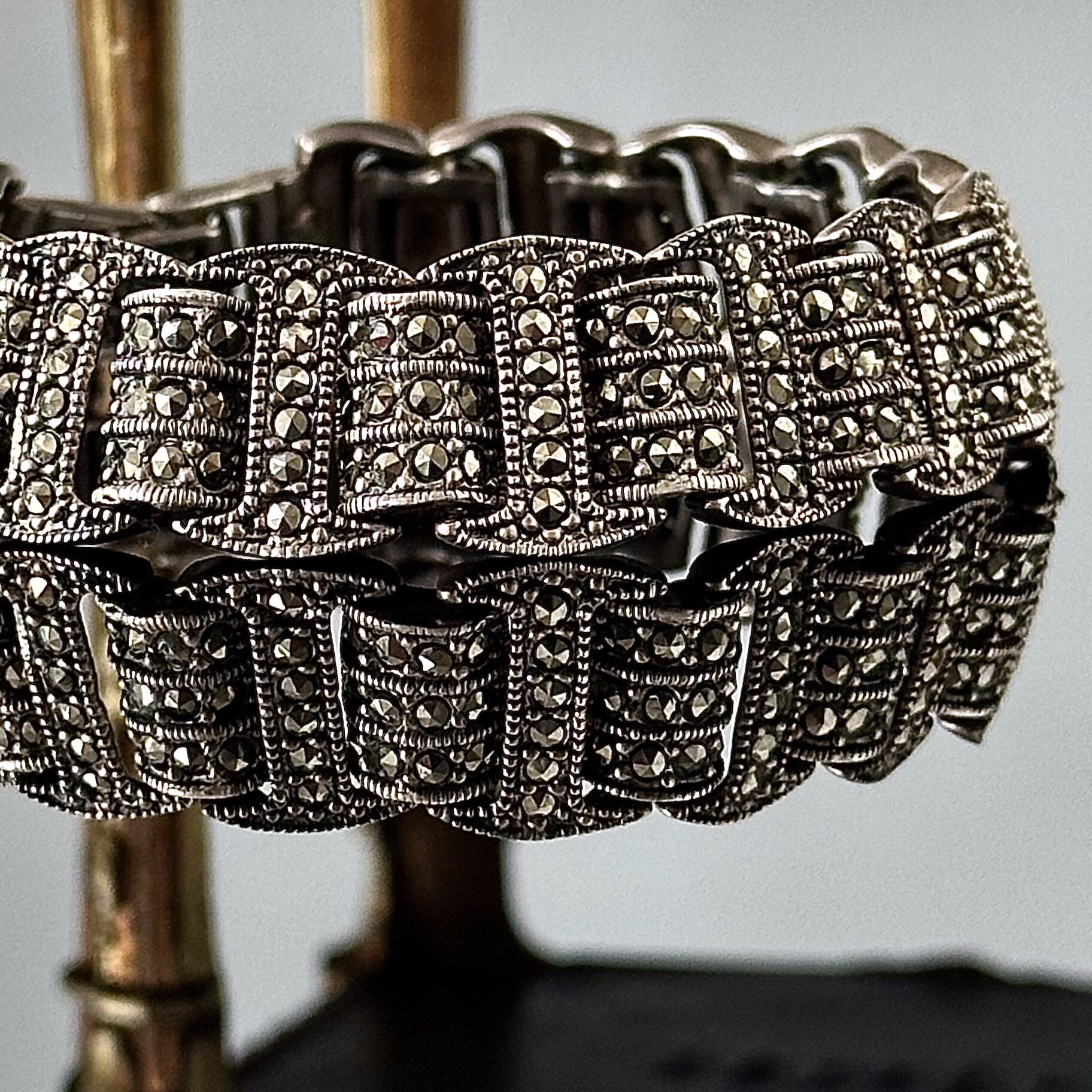 Srebrna bransoletka wykonana w stylu Art Deco, wykładana Markazytami. Bransoletka pochodzi z ok. 1970 roku, została wykonana z srebra próby 925 (próba bita i potwierdzona kwasowo). Całość składa się z geometrycznych powtarzających się elementów, na każdym z nich znajdują się kamienie, bransoletka znajduje się w bardzo dobrym oryginalnym stanie i jest przykładem sztuki z tamtego okresu. Bransoletka jest nie odczyszczona i nie wypolerowana, zgodnie z życzeniem wielu naszych klientów.
