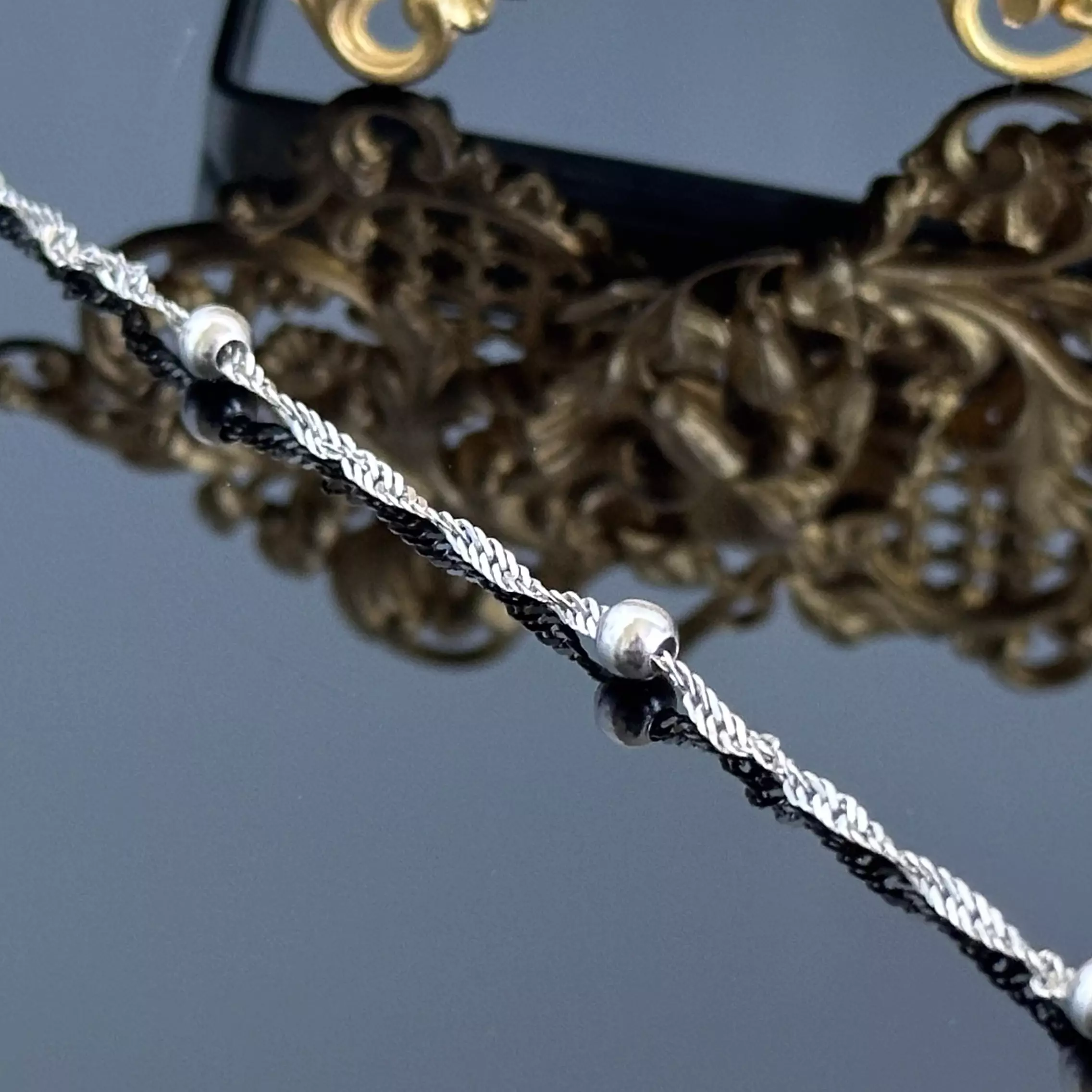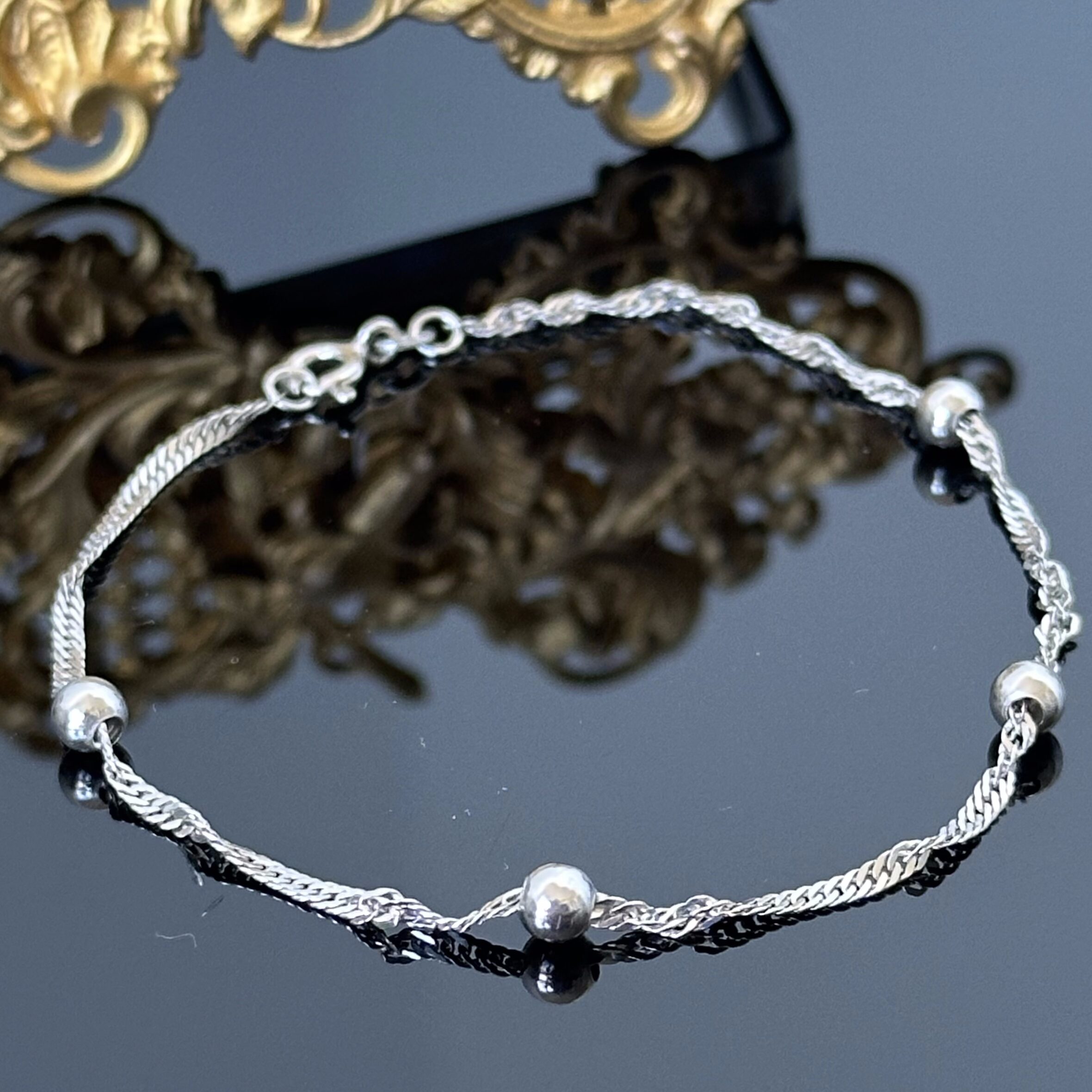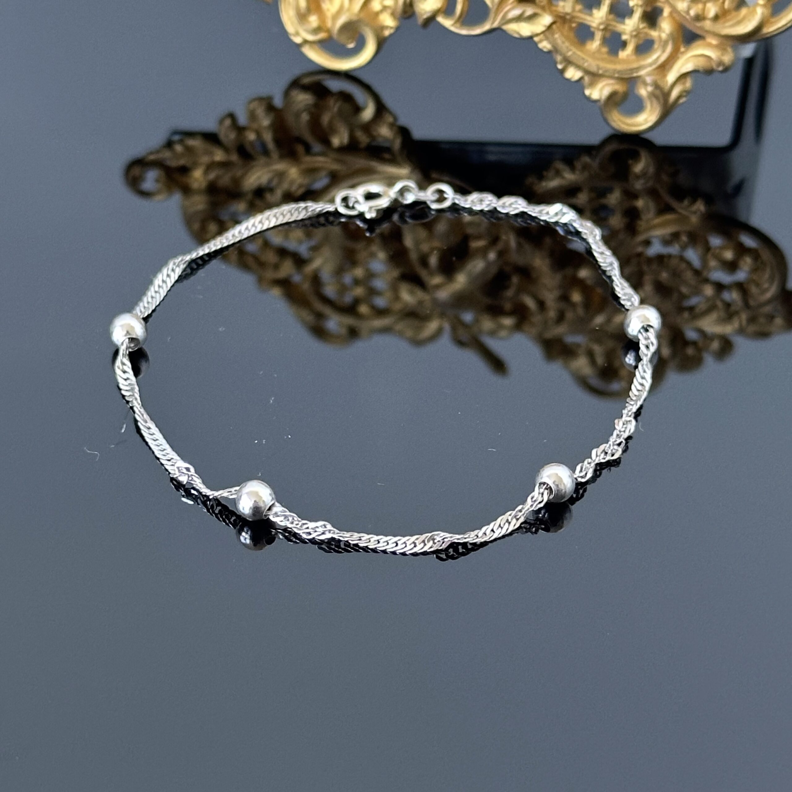 Srebrna bransoletka damska z kulkami, wykonana z srebra próby 925 (próba bita i potwierdzona kwasowo). Całość znajduje się w bardzo dobrym stanie, brak uszkodzeń, zdecydowanie polecam.