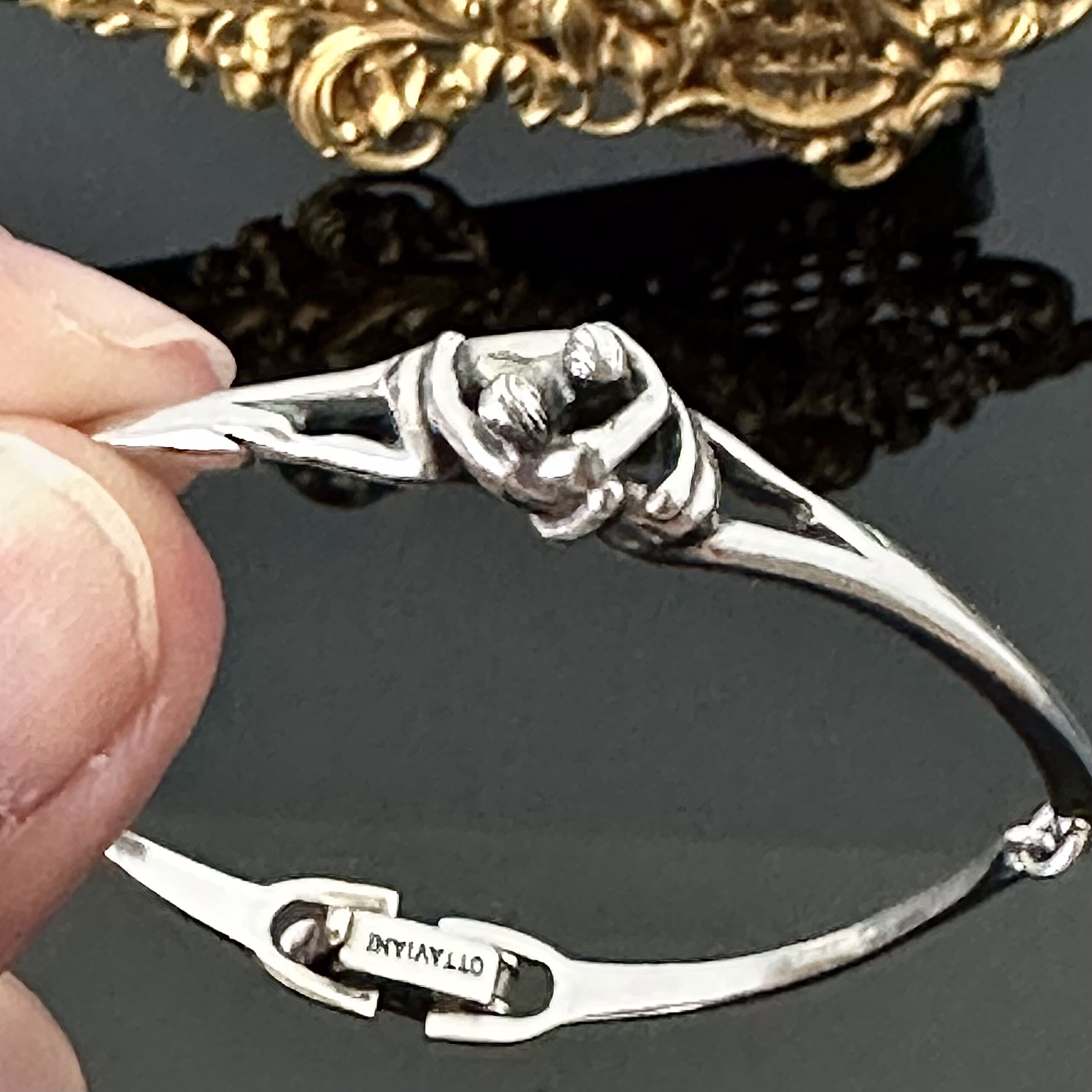 Srebrna bransoletka erotyczna firmy OTTAVIANI. Projekt wykonany przez znanego producenta biżuterii z srebra próby 925 (próba bita i potwierdzona kwasowo). Artysta wykonał w nowoczesnym stylu obejmującą się parę, całość została podzielona na trzy ruchome elementy, na zapięciu umieszczono próbę i sygnaturę producenta, Bransoletka znajduje się w bardzo dobrym stanie i jest godna polecenia.