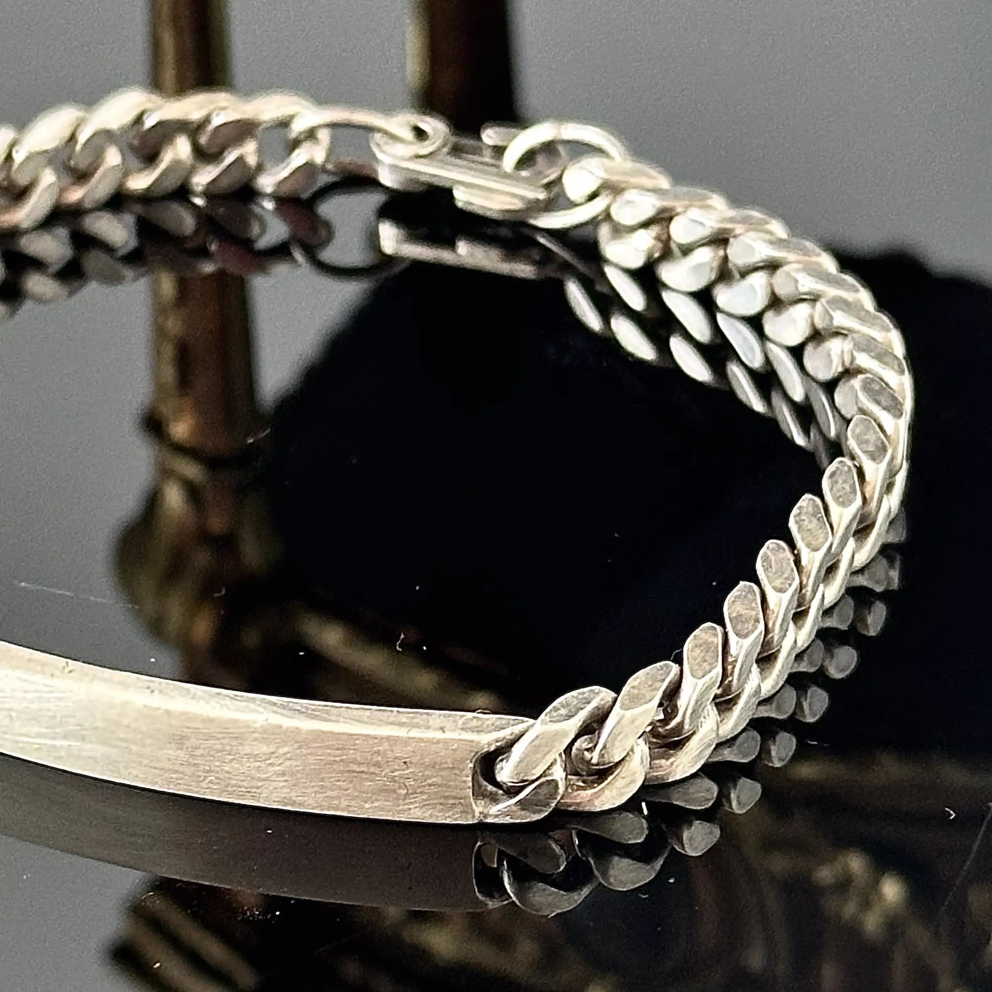 Srebrna bardzo masywna bransoletka z częścią do wygrawerowania. Bransoletka została wykonana z srebra próby 835 (próba bita i potwierdzona kwasowo), bardzo masywny wyrób na lata. Całość znajduje się w bardzo dobrym stanie.