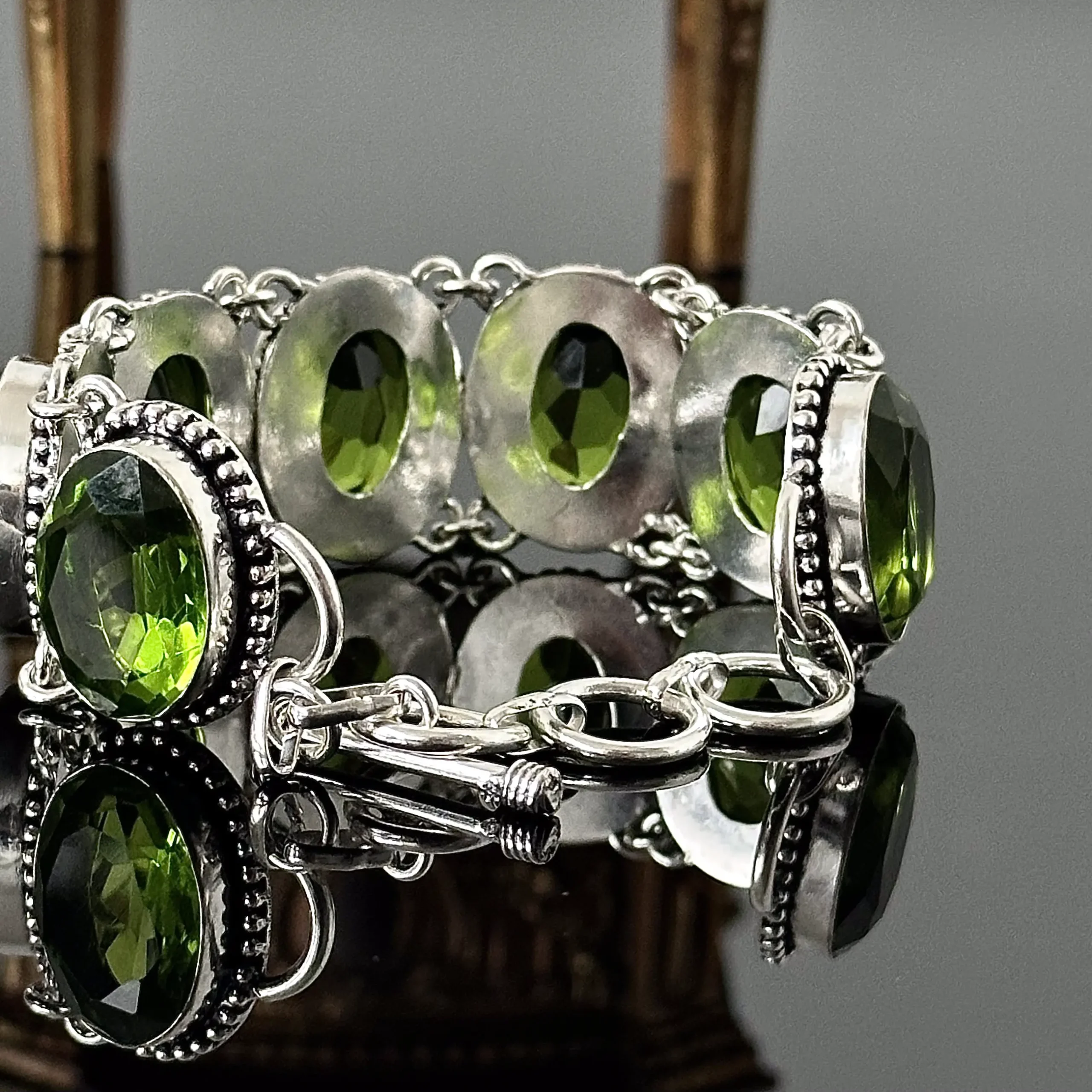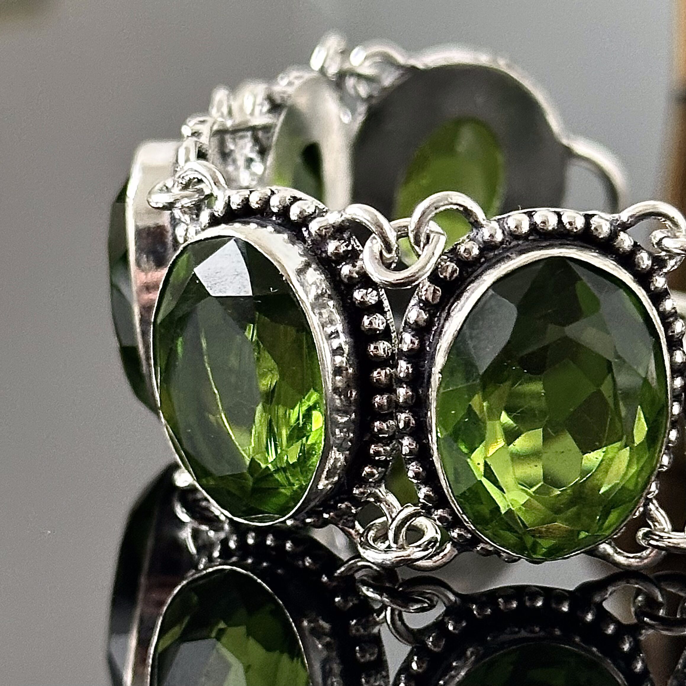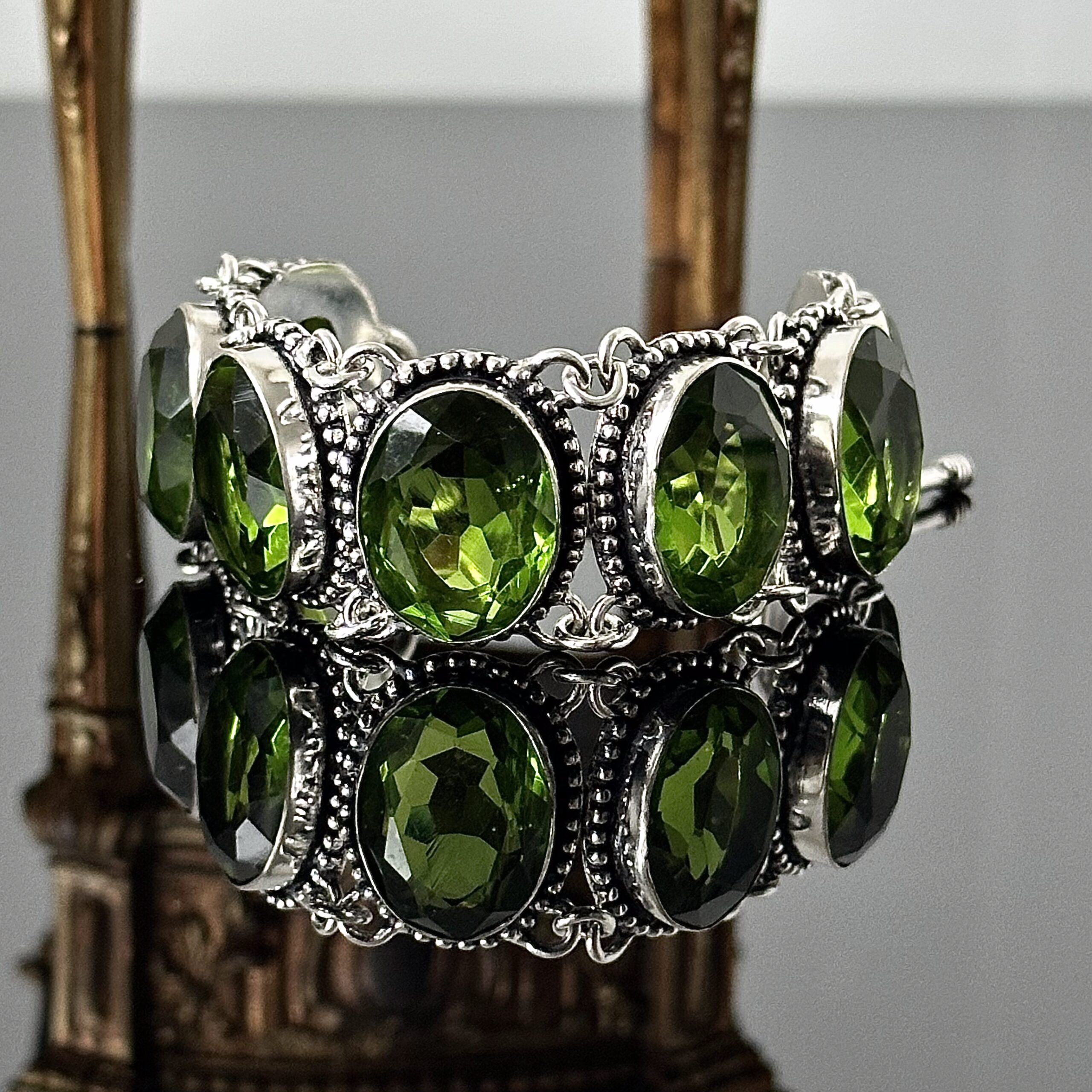 Srebrna masywna bransoletka z Oliwinem. Bransoletka została wykonana z srebra próby 925 (próba bita i potwierdzona kwasowo), ten przepiękny projekt posiada na swojej całej długości 7 dużych Oliwinów, całość bardzo solidnie i masywnie wykonana. Bransoletka znajduje się w bardzo dobrym stanie.