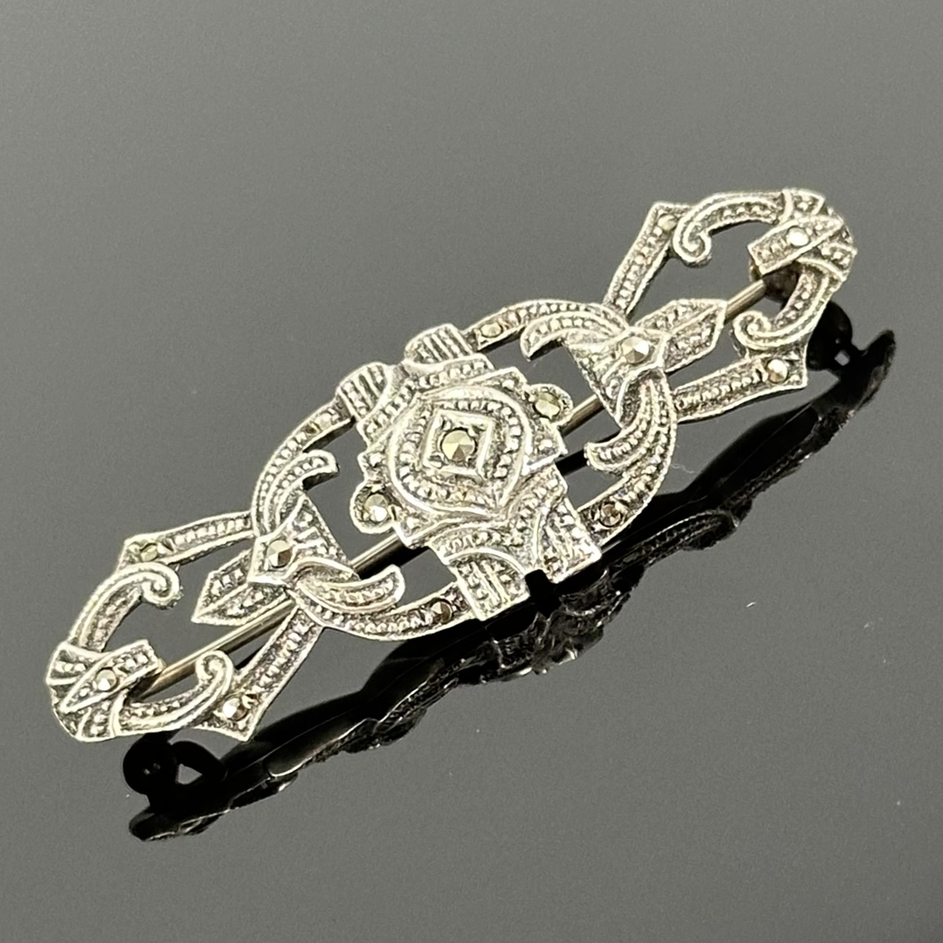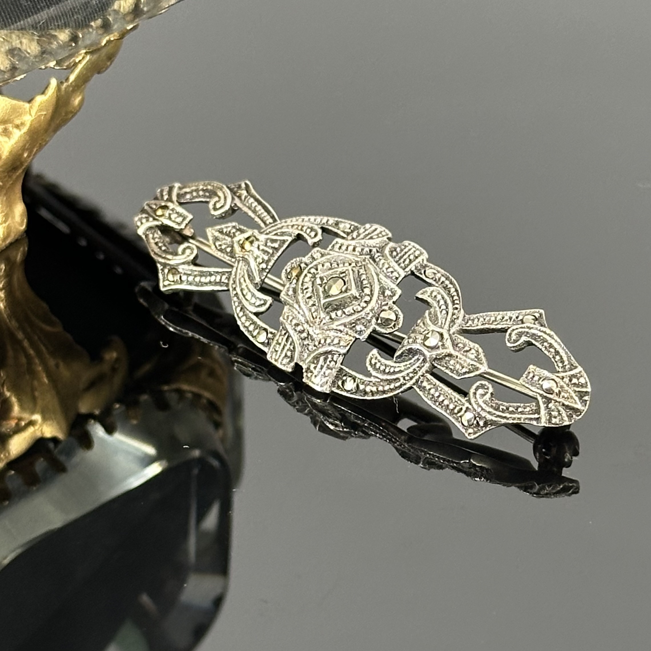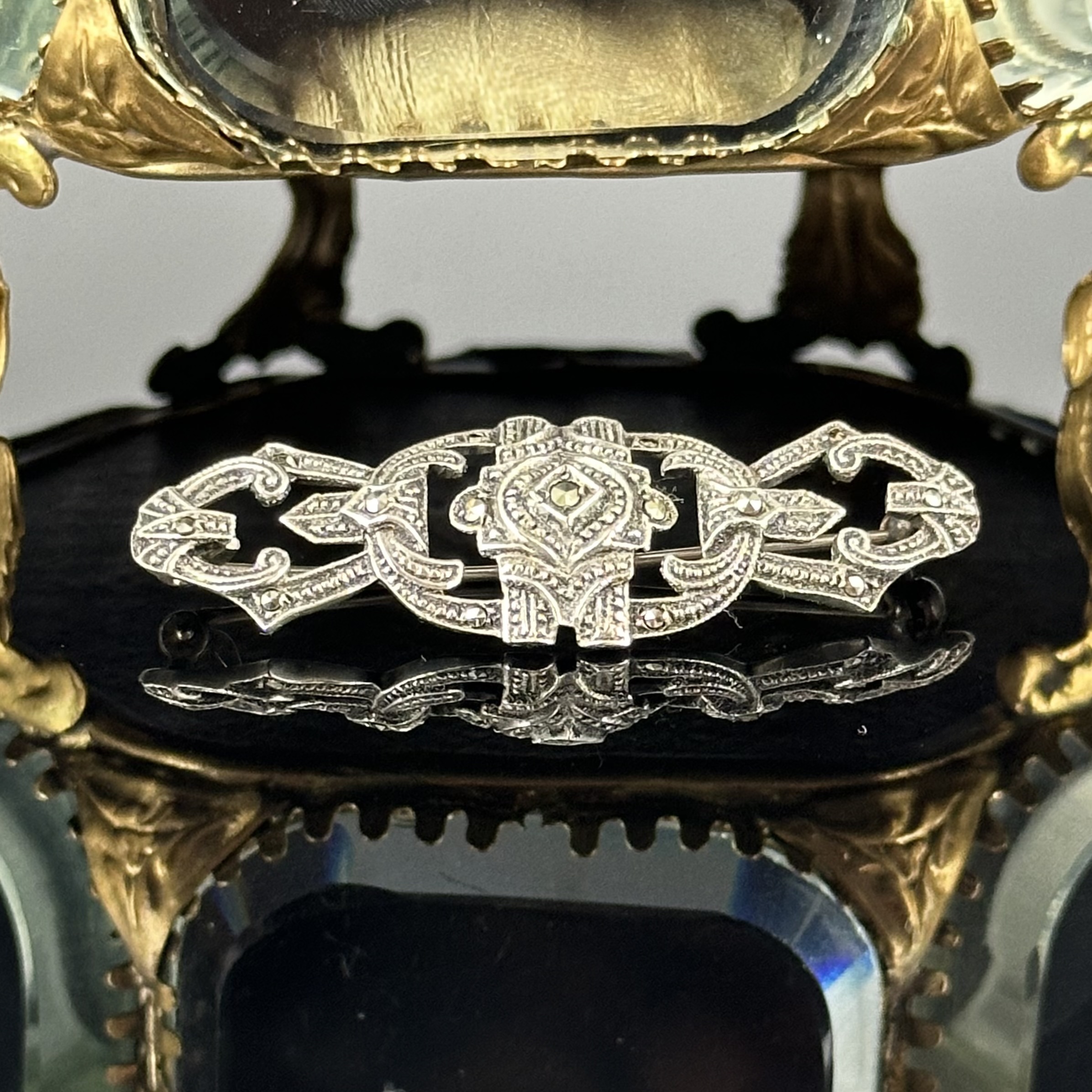 Broszka mimo swojego wieku znajduje się w bardzo dobrym stanie, brak uszkodzeń, zarysowań, Markazyty są kompletne. Zdecydowanie polecamy