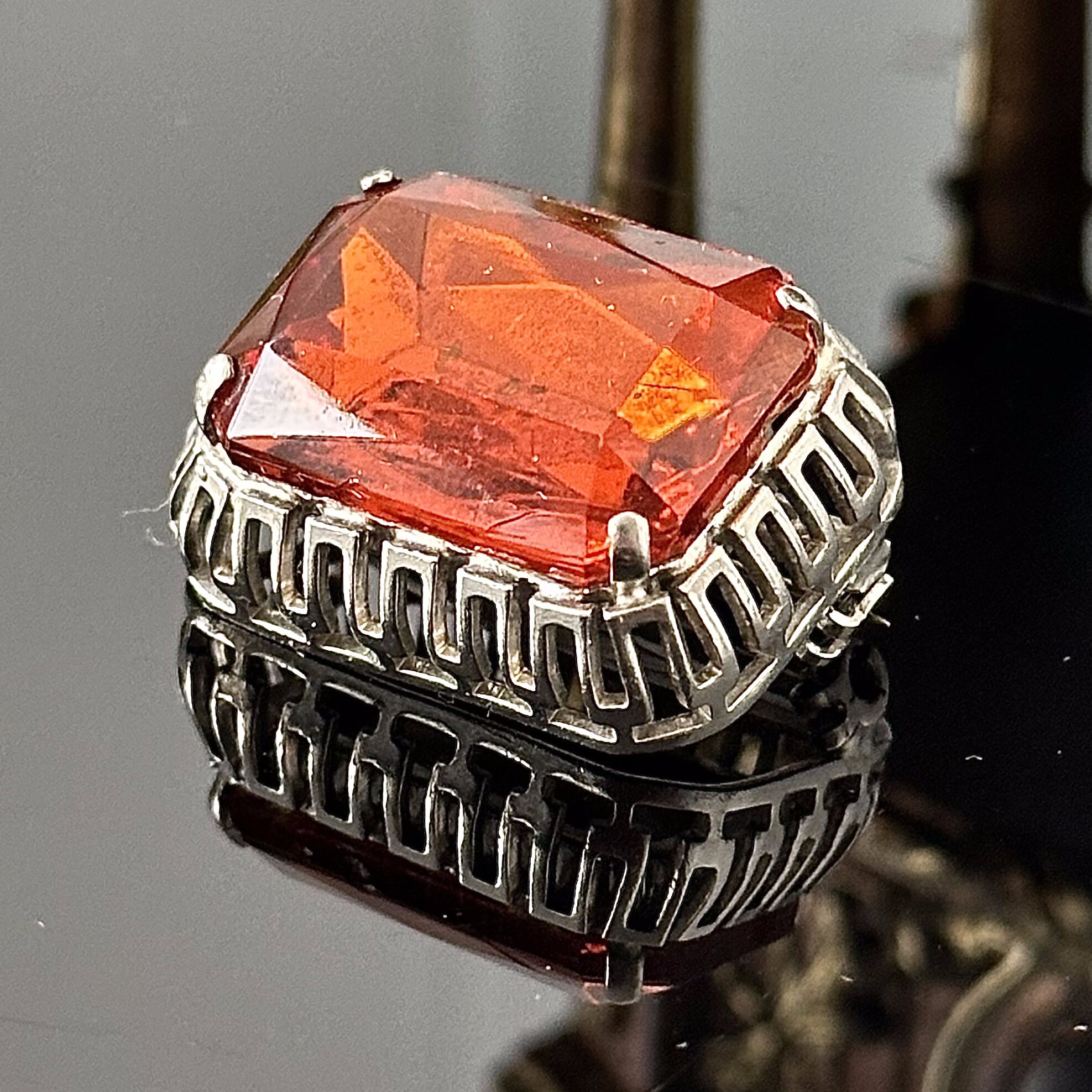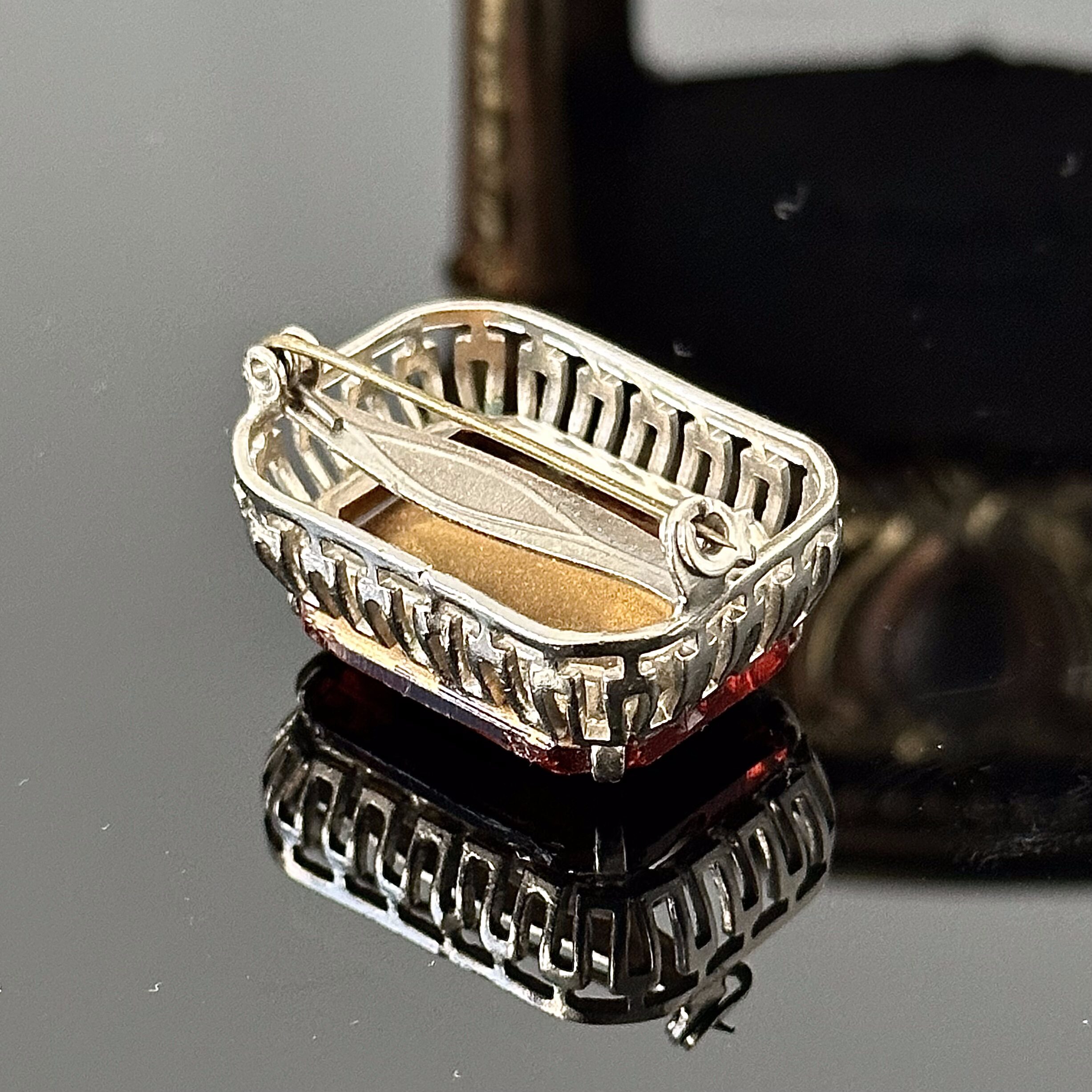 Broszka klasycystyczna z kamieniem Cytrynowym, pochodzi z Anglii z końca lat 60. XX wieku. Lśniące cytrynowe światło dużego, prostokątnego, fasetowanego kamienia całkowicie dominuje nad klejnotem, osadzonym w oprawie imitującego Art Decowski styl, co stanowi idealny zarys dla tego ciepłego, lekkiego kamienia. Kamień jest doskonałej jakości, nawet jeśli broszka nie posiada żadnych sygnatur ani znaków, jego jakość jest naprawdę dobra.
