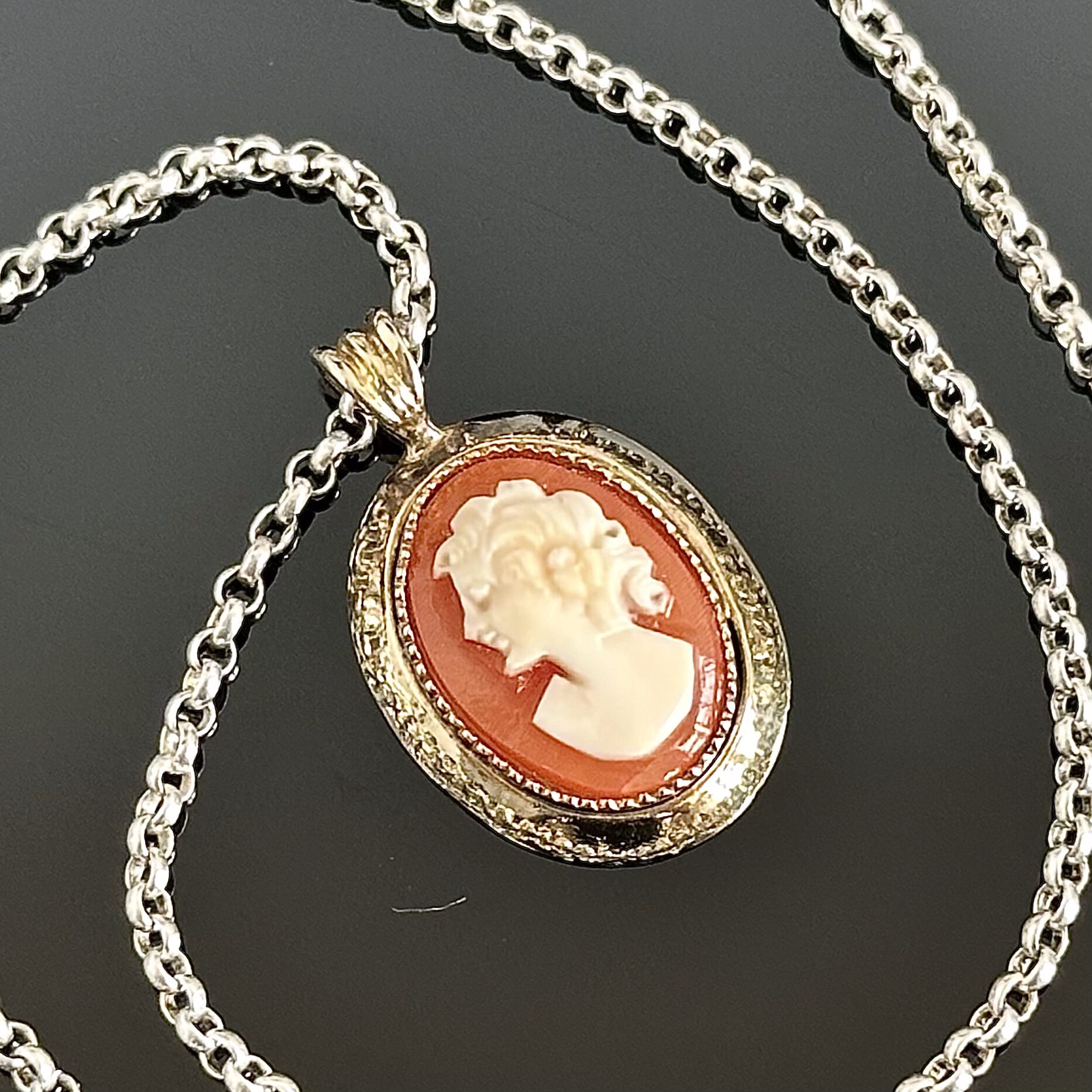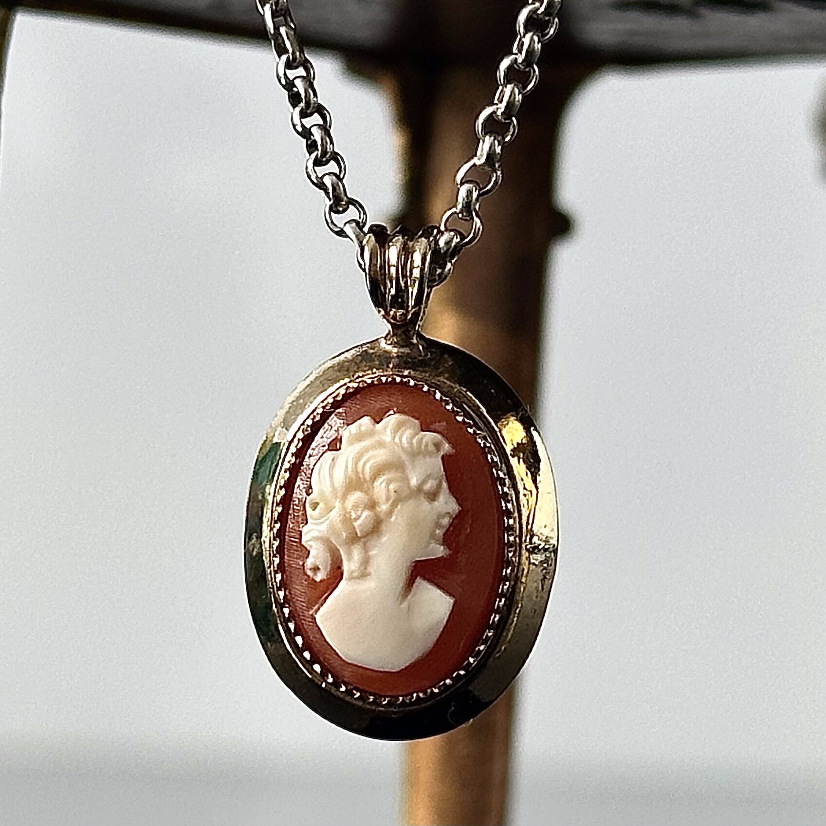 Srebrna kamea - oryginał Art Deco z ok. 1965 roku - przywieszka, wyjątkowe wykonanie, artysta modernistycznie wyrzeźbił w muszli kamee. Ten wspaniały projekt idealnie odzwierciedla styl Art Deco w sztuce jubilerskiej tamtego okresu, został wykonany z srebra próby 925 (próba potwierdzona kwasowo). Kamea jak na swój wiek znajduje się w dobrym stanie, brak uszkodzeń, zalecam przepolerowanie.