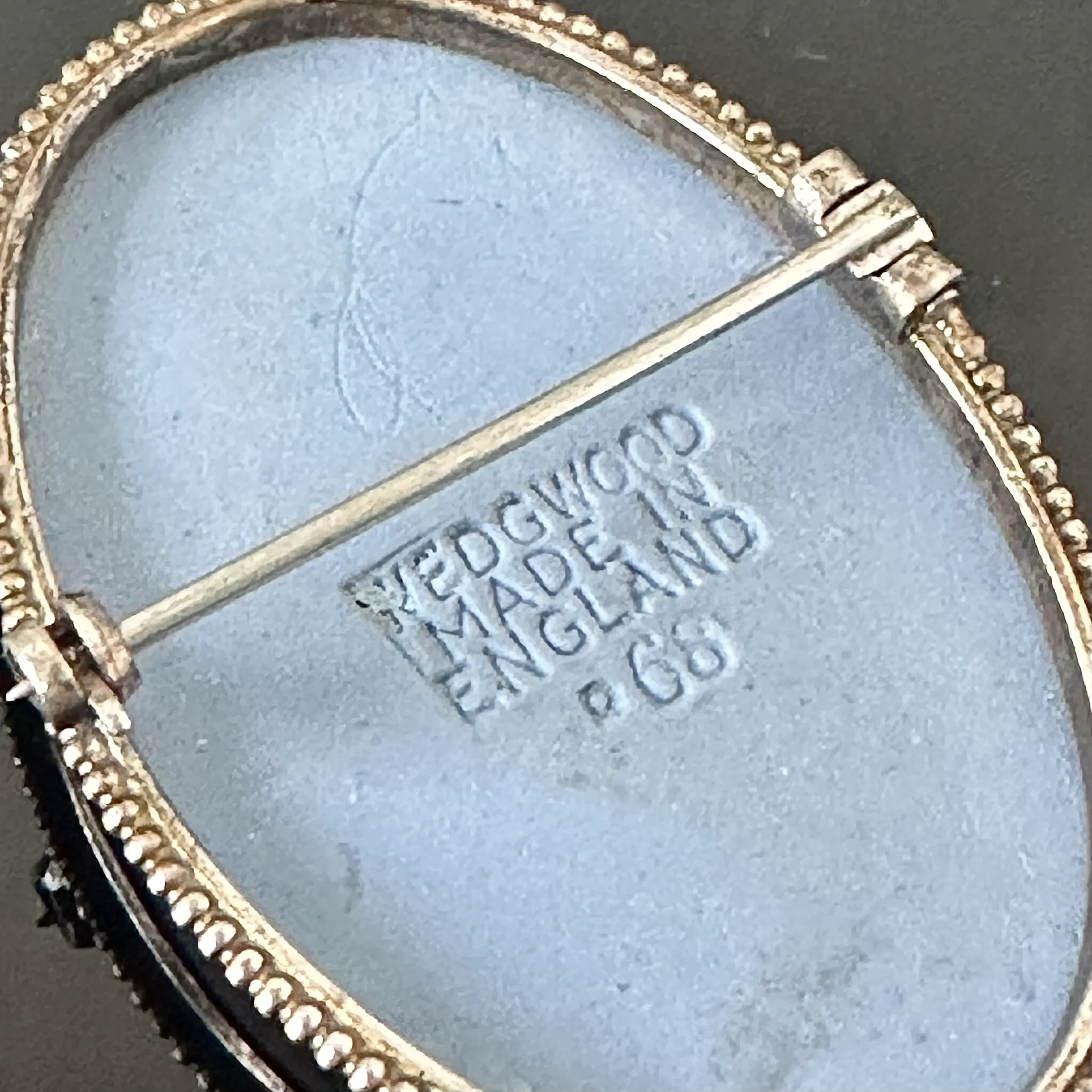 Srebrna kamea firmy Wedgwood z Anglii z ok. 1970 roku. Broszka została wykonana z srebra próby 925 (próba bita potwierdzona kwasowo), jak wszystkie wyroby tej firmy jest kojarzona z połączenia kolorów błękitu z bielą i tematyką historycznych greckich postaci. Broszka znajduje się w swoim oryginalnym stanie, bez uszkodzeń i wymaga odczyszczenia i wypolerowania.
