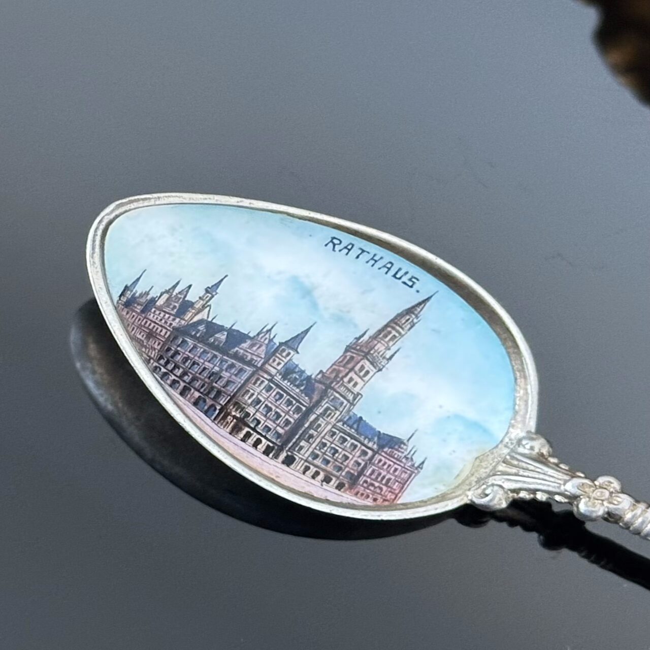 Srebrna łyżeczka pamiątkowa z Monachium w Niemczech. Całość została wykonana z srebra próby 800 (próba bita i potwierdzona kwasowo), w części centralnej umieszczono emaliowaną ilustrację Ratusza w Monachium. Łyżeczka pochodzi z około 1900 roku i stanowi pamiątkę z tamtego okresu. Łyżeczka znajduje się w bardzo dobrym stanie.