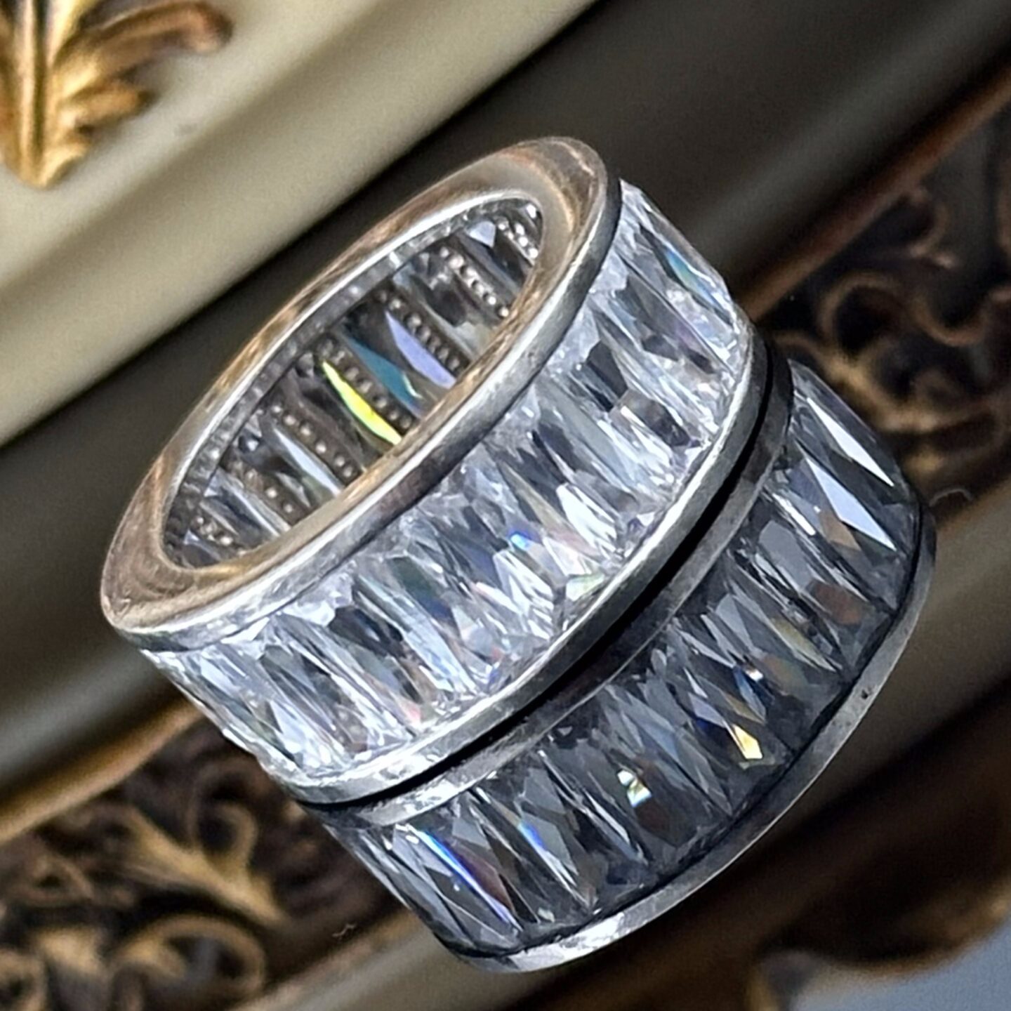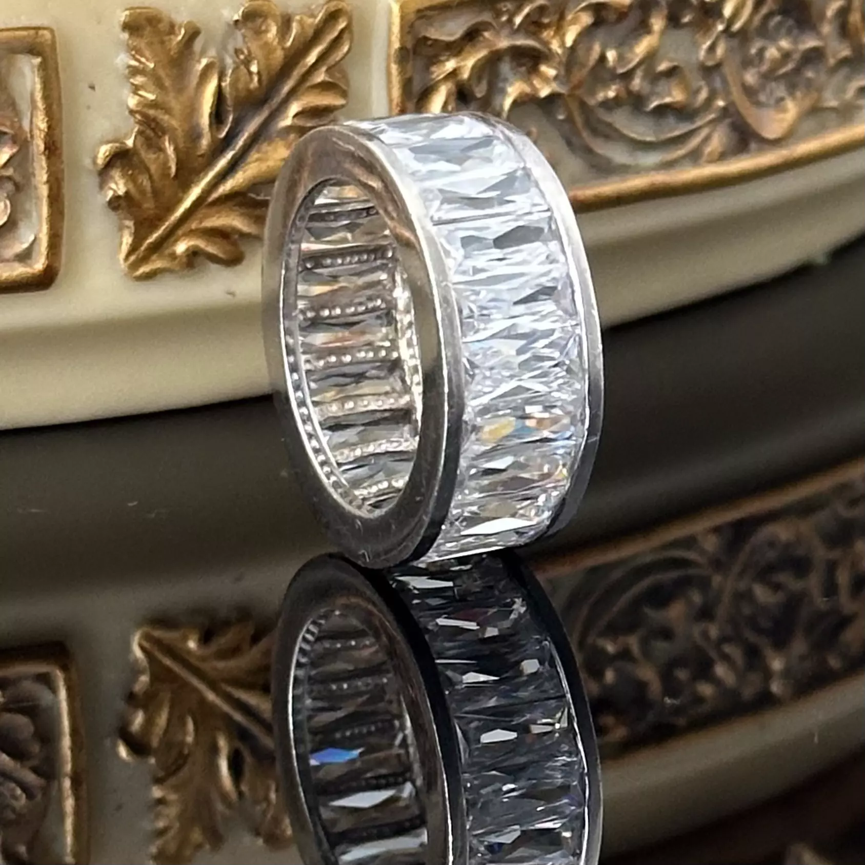 Srebrna obraczka z Cyrkoniami. To przepiękny projekt do złudzenia przypomina białe złoto i brylanty, wspaniały efekt optyczny mieniącego się blasku przy padającym świetle lub słońcu. Całość została wykonana z srebra próby 925.