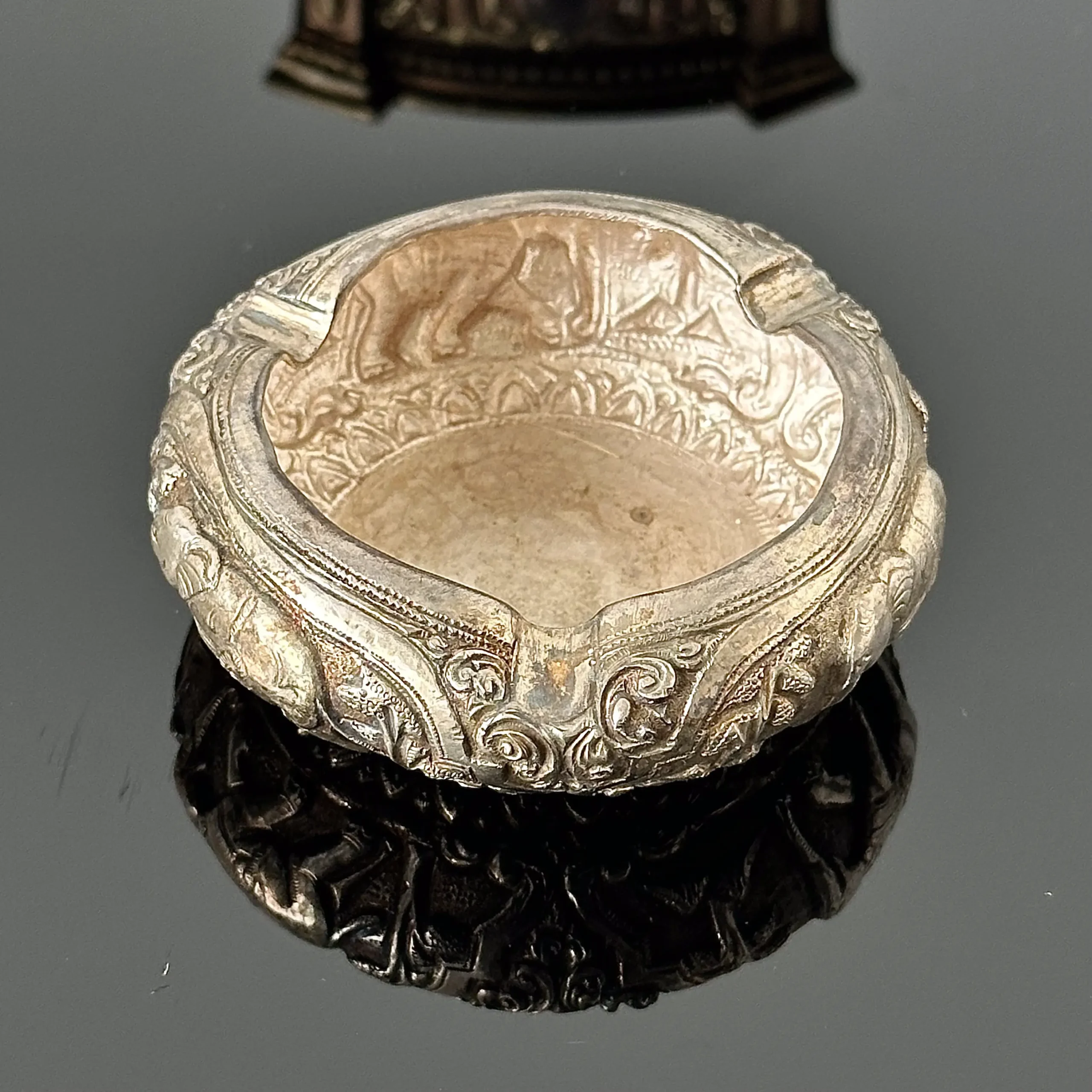 Srebrna popielniczka z słoniami