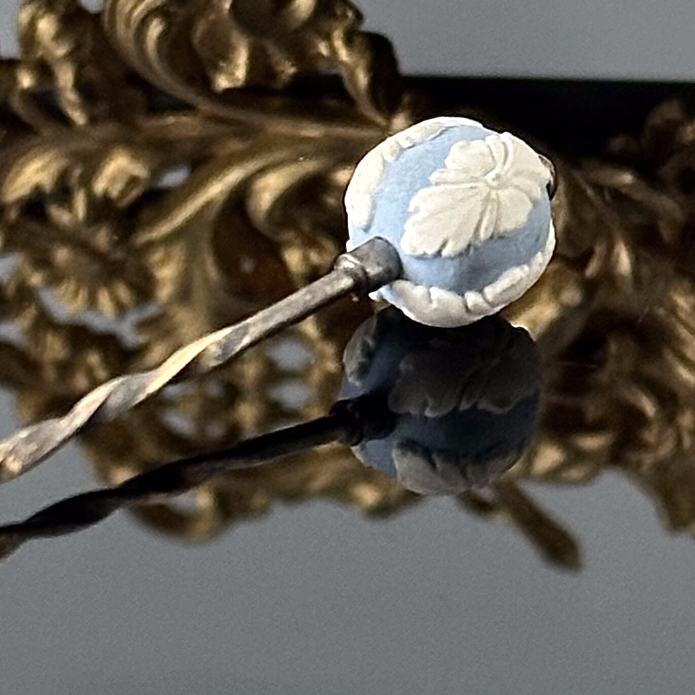 Srebrna szpilka do krawata lub marynarki firmy Wedgwood z Anglii z ok. 1970 roku. Szpilka została wykonana z srebra próby 925 (próba bita potwierdzona kwasowo), jak wszystkie wyroby tej firmy jest kojarzona z połączenia kolorów błękitu z bielą i tematyką historycznych greckich postaci. Szpilka  znajduje się w swoim oryginalnym stanie, bez uszkodzeń i wymaga wypolerowania.