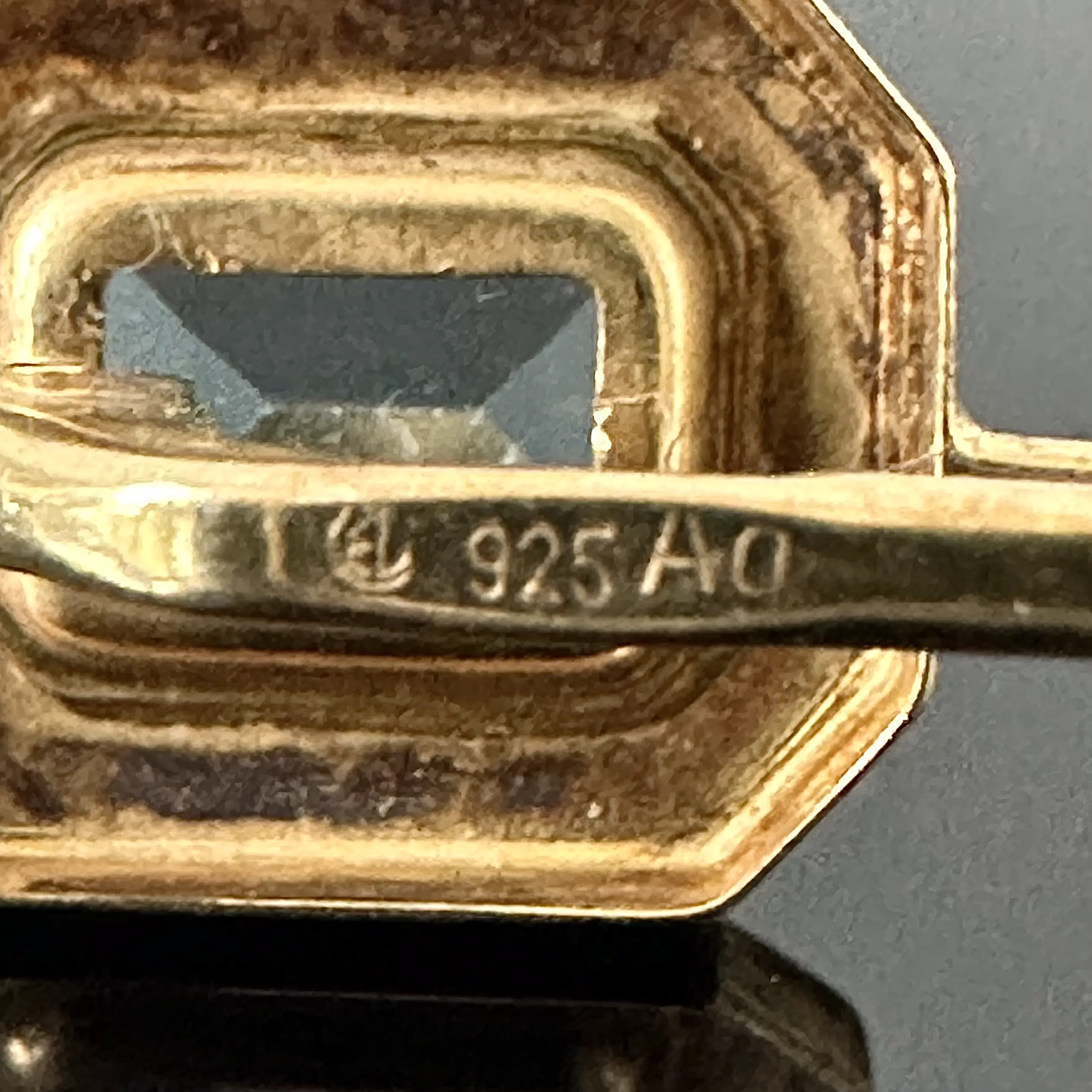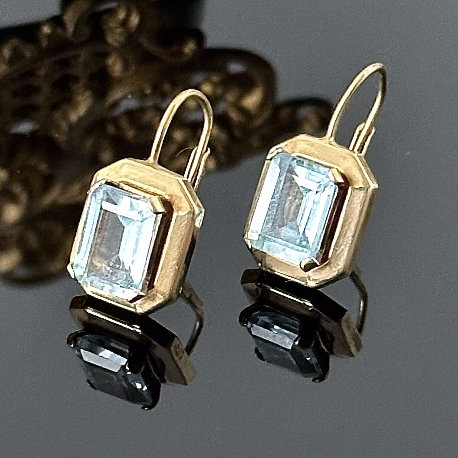 Przepiękne kolczyki oryginał wykonane w stylu Art Deco ok. 1960 roku z srebra próby 925 (próba bita i potwierdzona kwasowa) i pozłocone 14 karatowym złotem. Artysta zaprojektował i osadził w części centralnej dwa Akwamaryny oszlifowane w stylu szmaragdowym prostokątnym. Całość znajduje się w bardzo dobrym oryginalnym stanie, zalecam delikatnie przepolerować aby nabrały dawnego blasku.