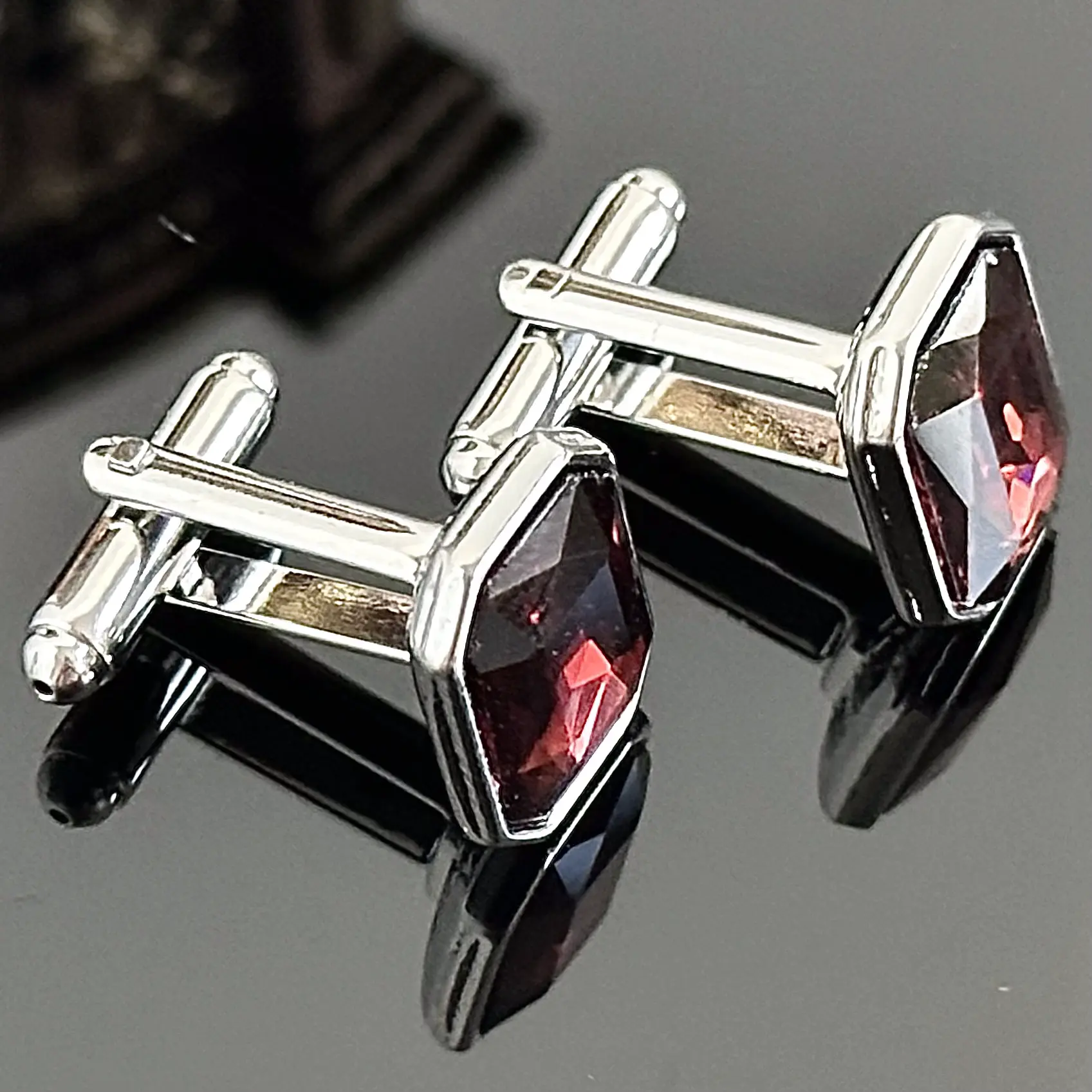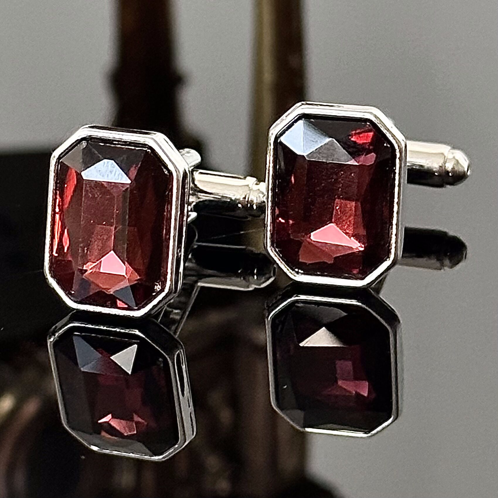 Srebrne spinki do koszuli z Granatami, kamieniem firmy Swarovskiego. Pochodzą z Londynu, należały do kolekcjonera spinek i nie były nigdy używane. Kamień z przepiękną głębią burgundu, dzięki szlifowi gwiaździstemu w zależności od konta padania światła, oddaje kolorystyczny urok i blask, wspaniały efekt optyczny. Całość pokryta powłoką zabezpieczającą przed ciemnieniem, jak nowe.