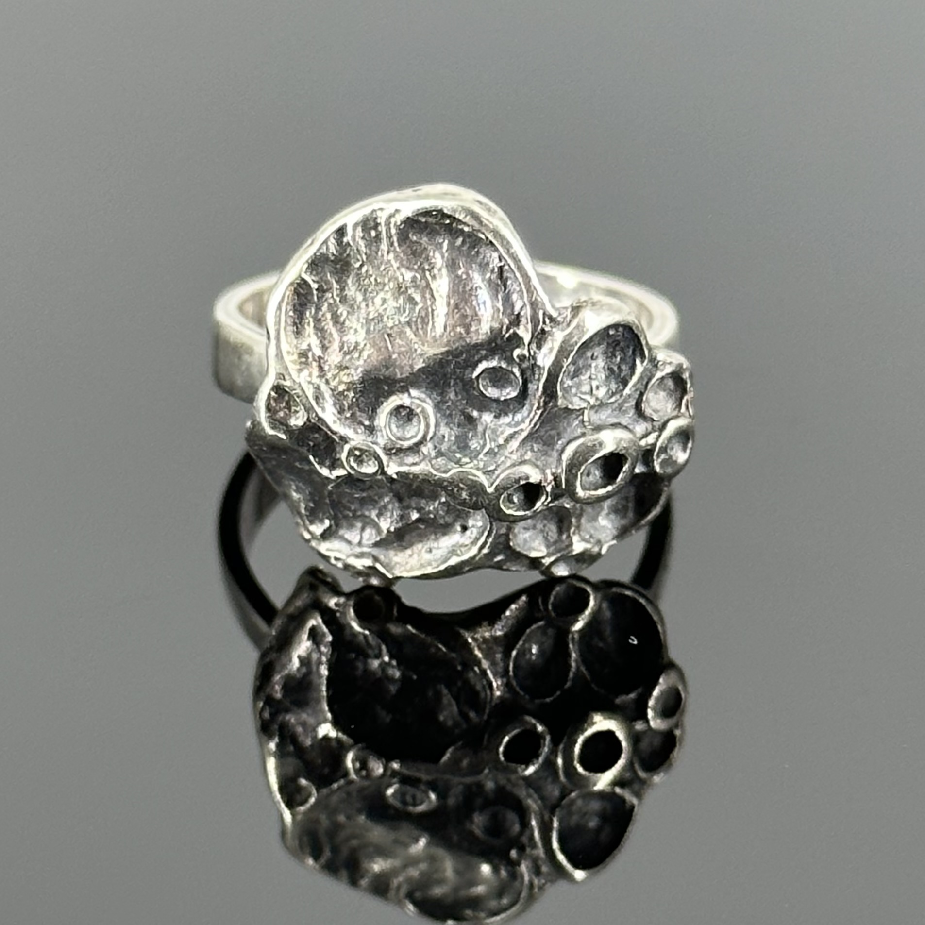 Wyjątkowy artystyczny pierścionek srebrny. To w pełni ręcznie wykonany pierścionek, imitujący księżycowe kratery, całoś zaprojektowano w srebrze próby 925 i oznakowano dodatkowo puncami artysty. Pierścionek znajduje się w idealnym stanie, brak uszkodzeń lub zarysowań, zdecydowanie polecamy.