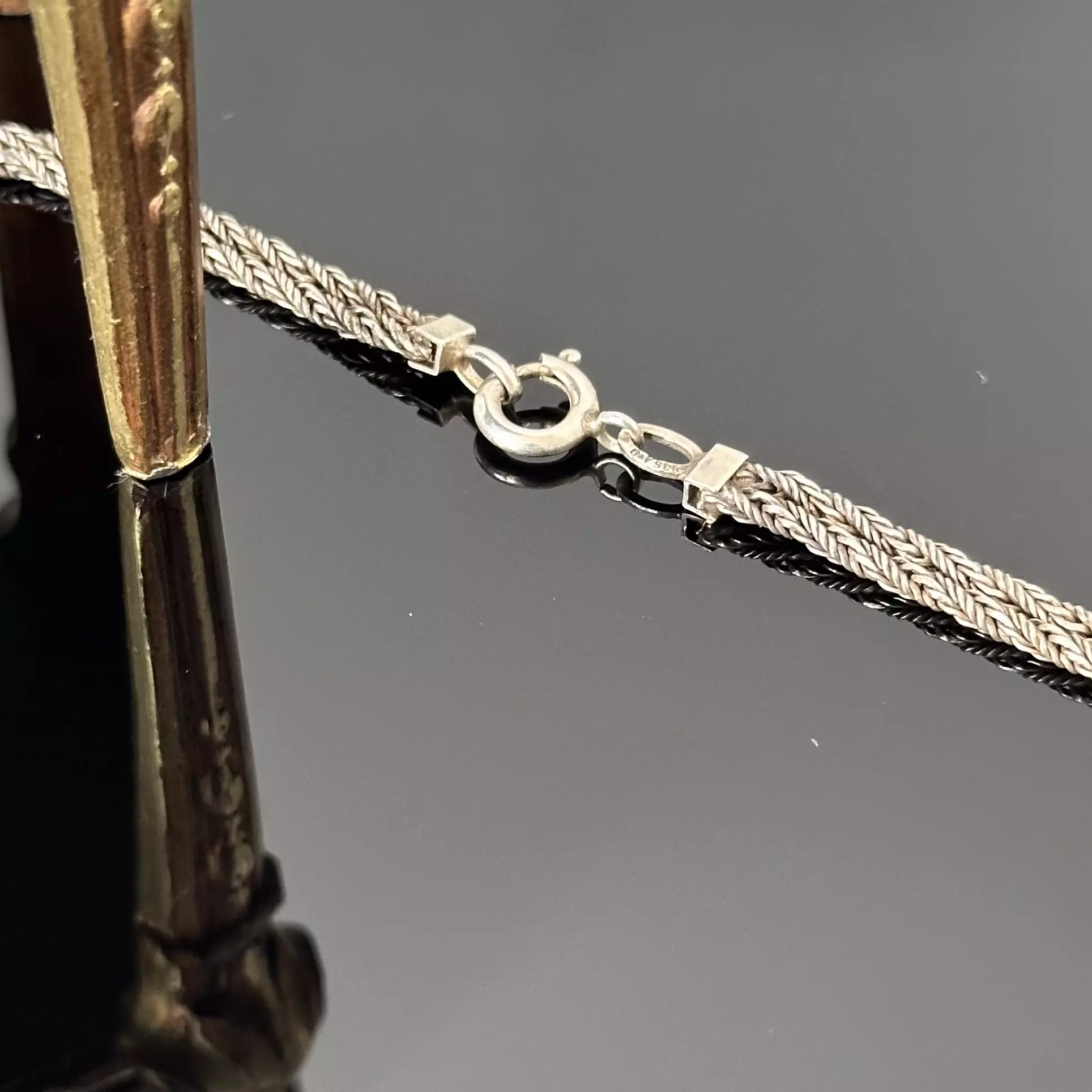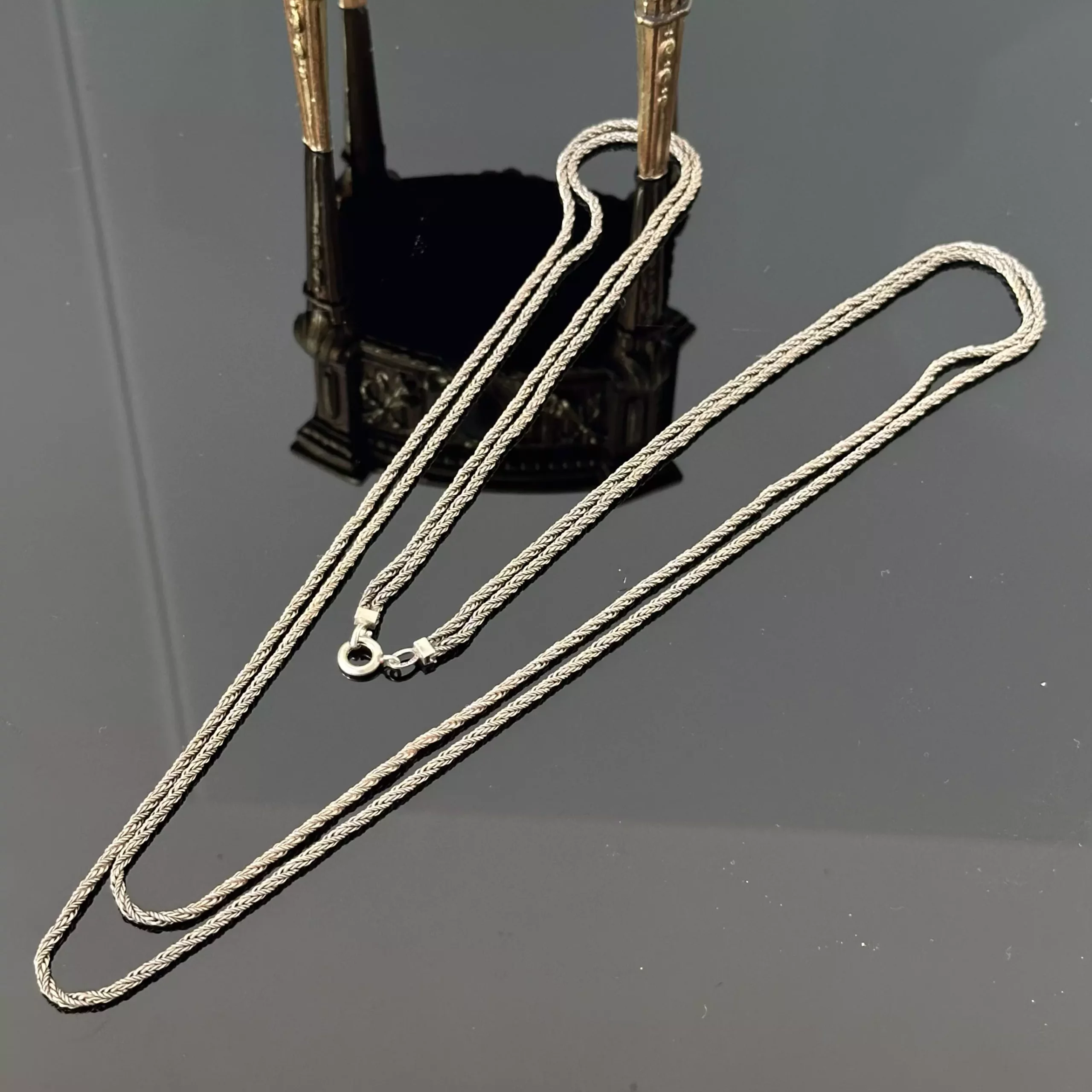 Srebrny historyczny podwójny łańcuch, oryginał z ok. 1880 roku wykonany ręcznie z srebra próby 835 (próba bita i potwierdzona kwasowo) o długości 80cm. Jest to wspaniały przykład sztuki końca XIX wieku i gratka dla koneserów.