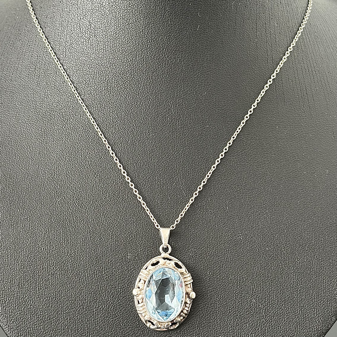 Srebrny naszyjnik z Akwamarynem - oryginał z około 1900 roku. Ten wspaniały oryginalny naszyjnik pochodzi z okresu secesji, początków XX wieku, wykonany w srebrze próby 800 (próba bita i potwierdzona kwasowo). Naszyjnik znajduje się w bardzo dobrym stanie, brak uszkodzeń lub zarysowań, kamień jest również bez zarysowań oraz zmatowień na kantach faset, zdecydowanie polecamy.