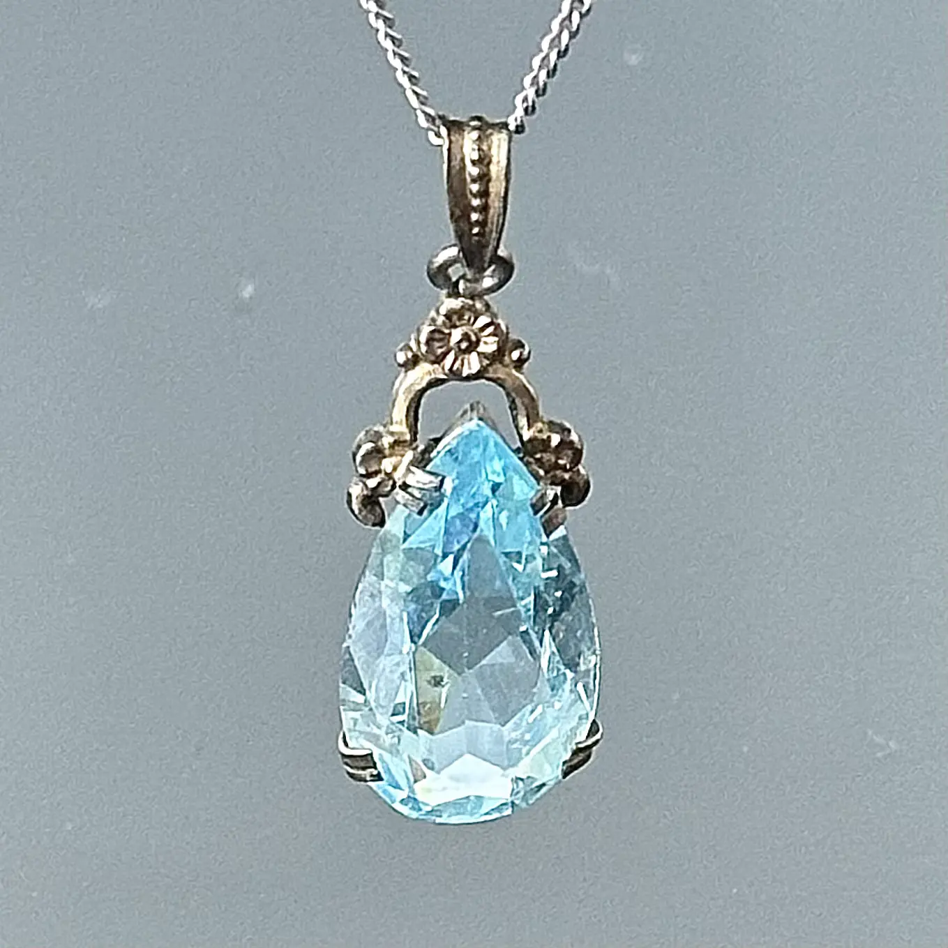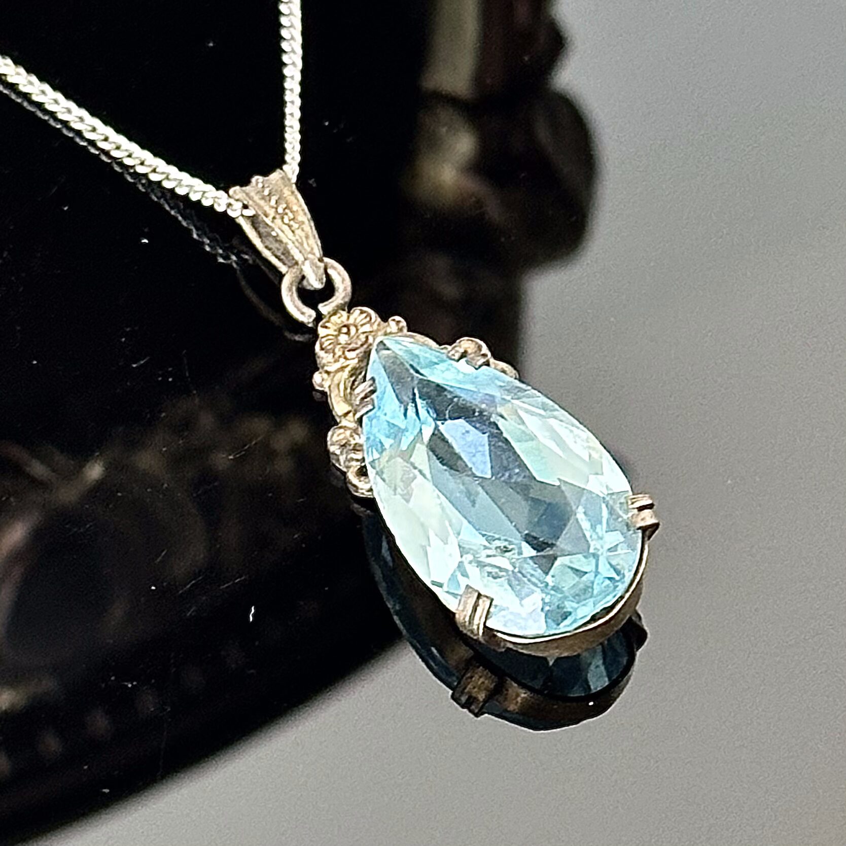 Naszyjnik z Akwamarynem - oryginał z około 1900 roku. Ten wspaniały oryginalny naszyjnik pochodzi z okresu secesji, początków XX wieku, przywieszka z zafasowanym Akwamarynem szlifowaną łezką w stylu vintage, łańcuszek srebrny próby 835 (próba bita i potwierdzona kwasowo). Naszyjnik znajduje się w bardzo dobrym stanie, brak uszkodzeń lub zarysowań, kamień jest również bez zarysowań i zmatowień na kantach faset.