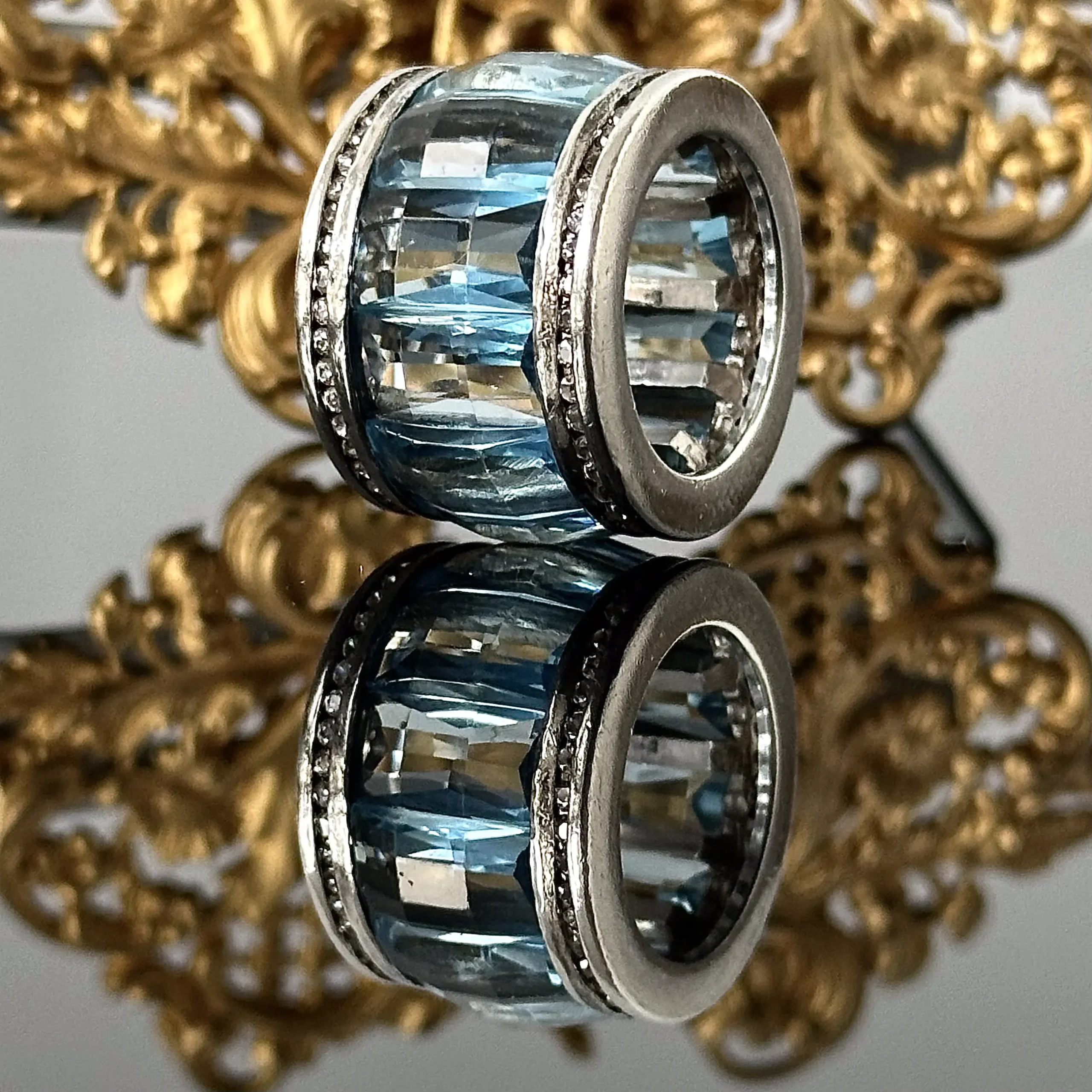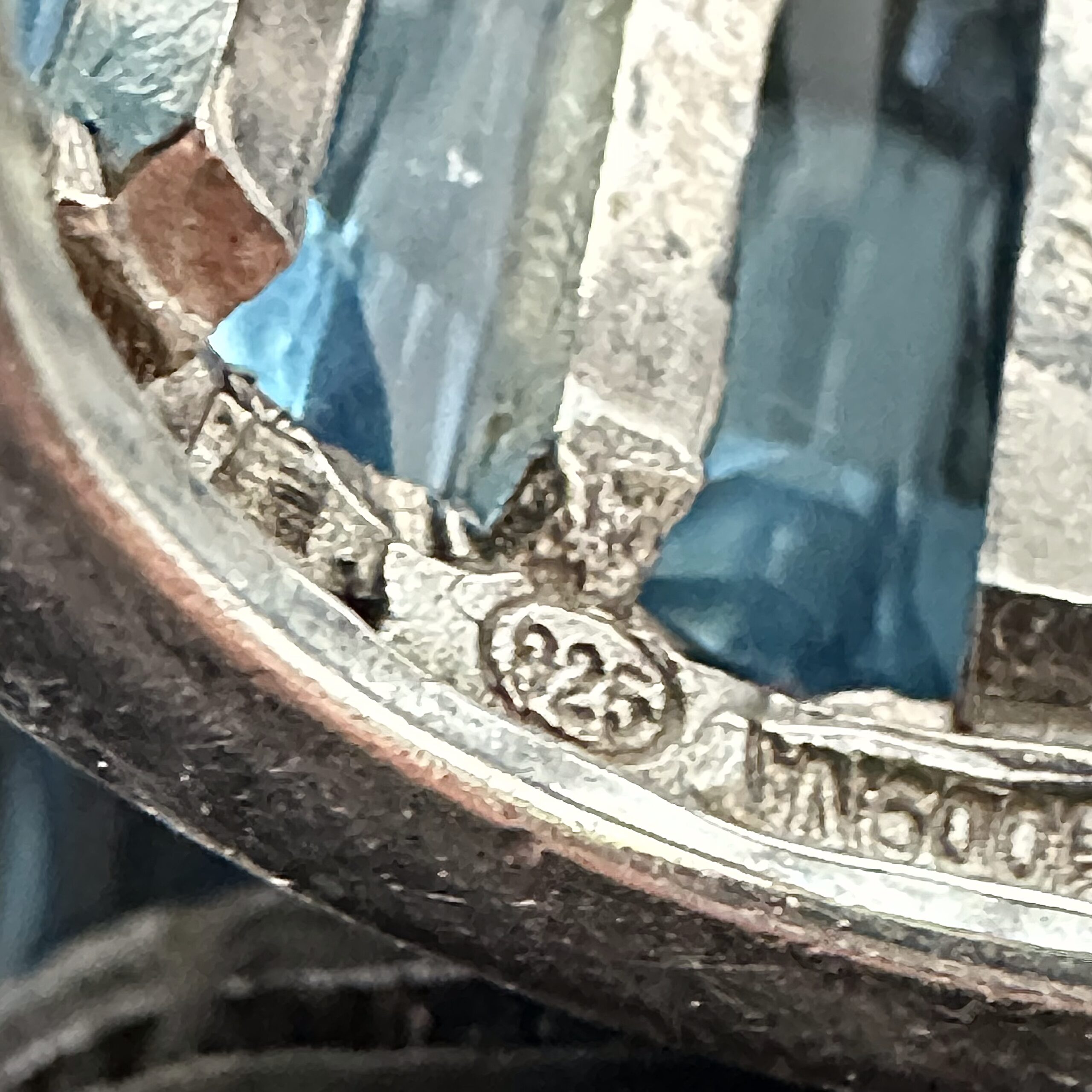 Srebrny pierścionek z Akwamarynami i Cyrkoniami klasy Premium. To przepiękny projekt dla prawdziwej kobiety biznesu, do złudzenia przypomina białe złoto, wspaniały efekt optyczny mieniącego się blasku przy padającym świetle lub słońcu. Całość została bardzo masywnie wykonana z srebra próby 925, idealny do codziennego użytku. Pierścionek znajduje się w dobrym stanie z drobnymi śladami użytkowania.