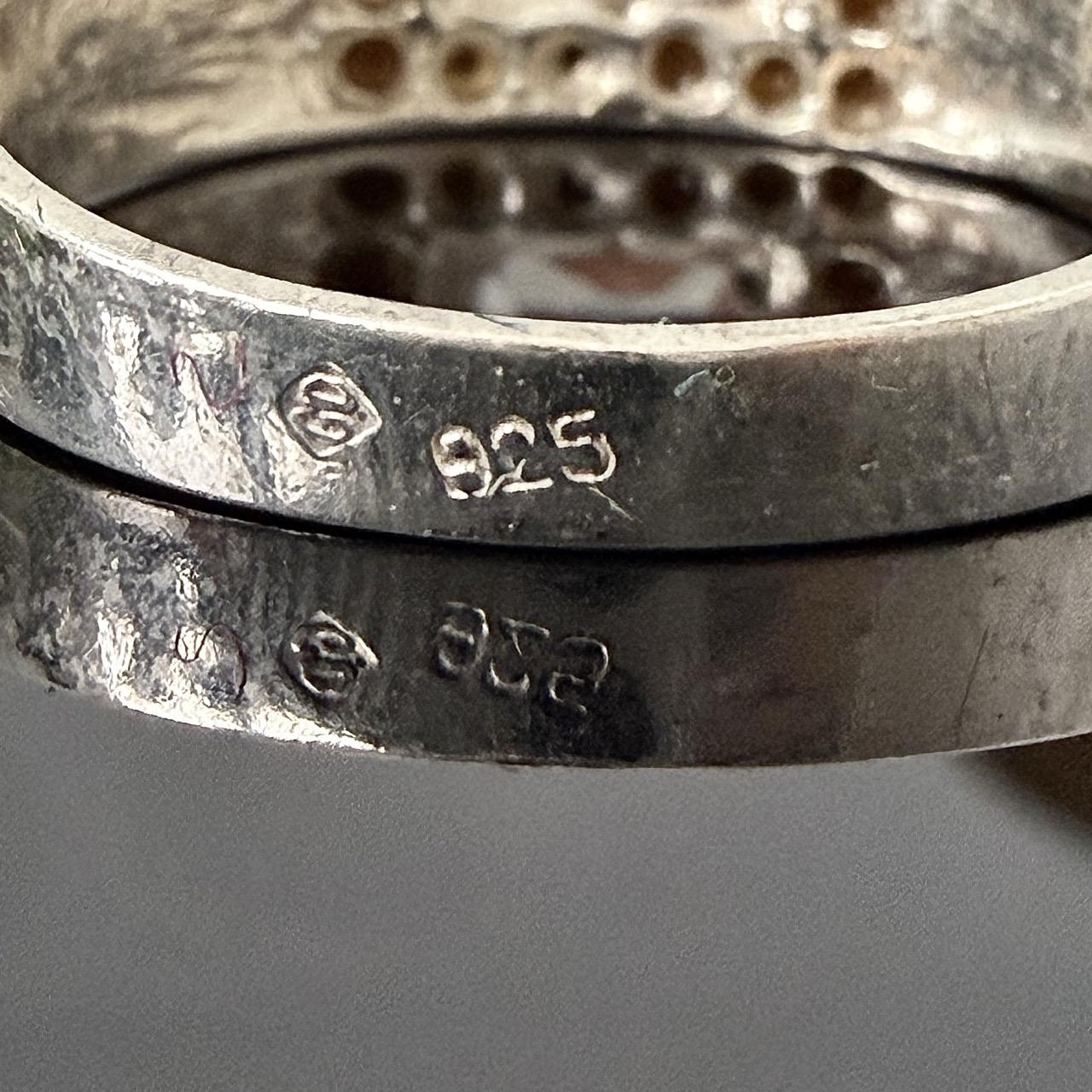 Wykonany ze srebra próby 925, rubinów i cyrkonii
